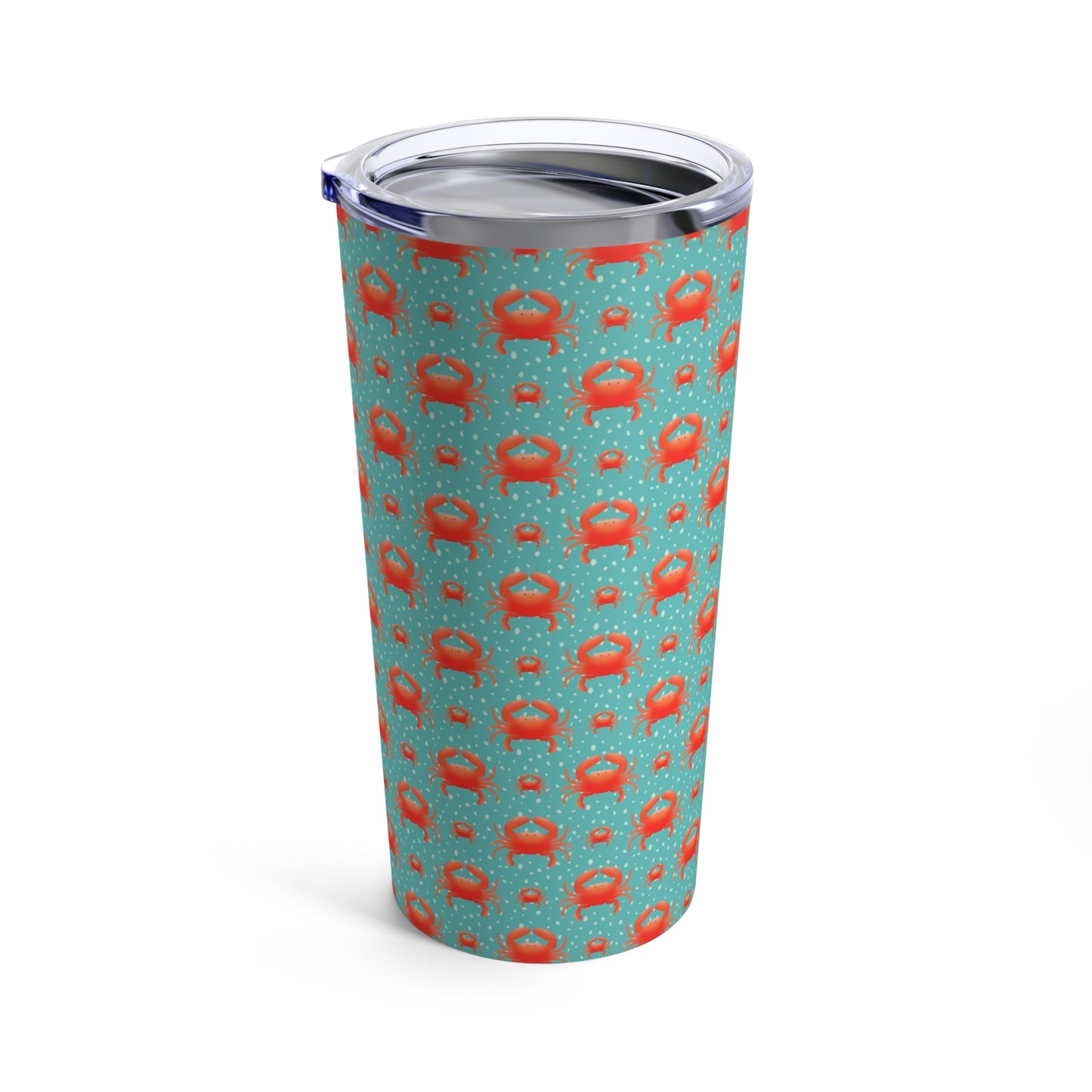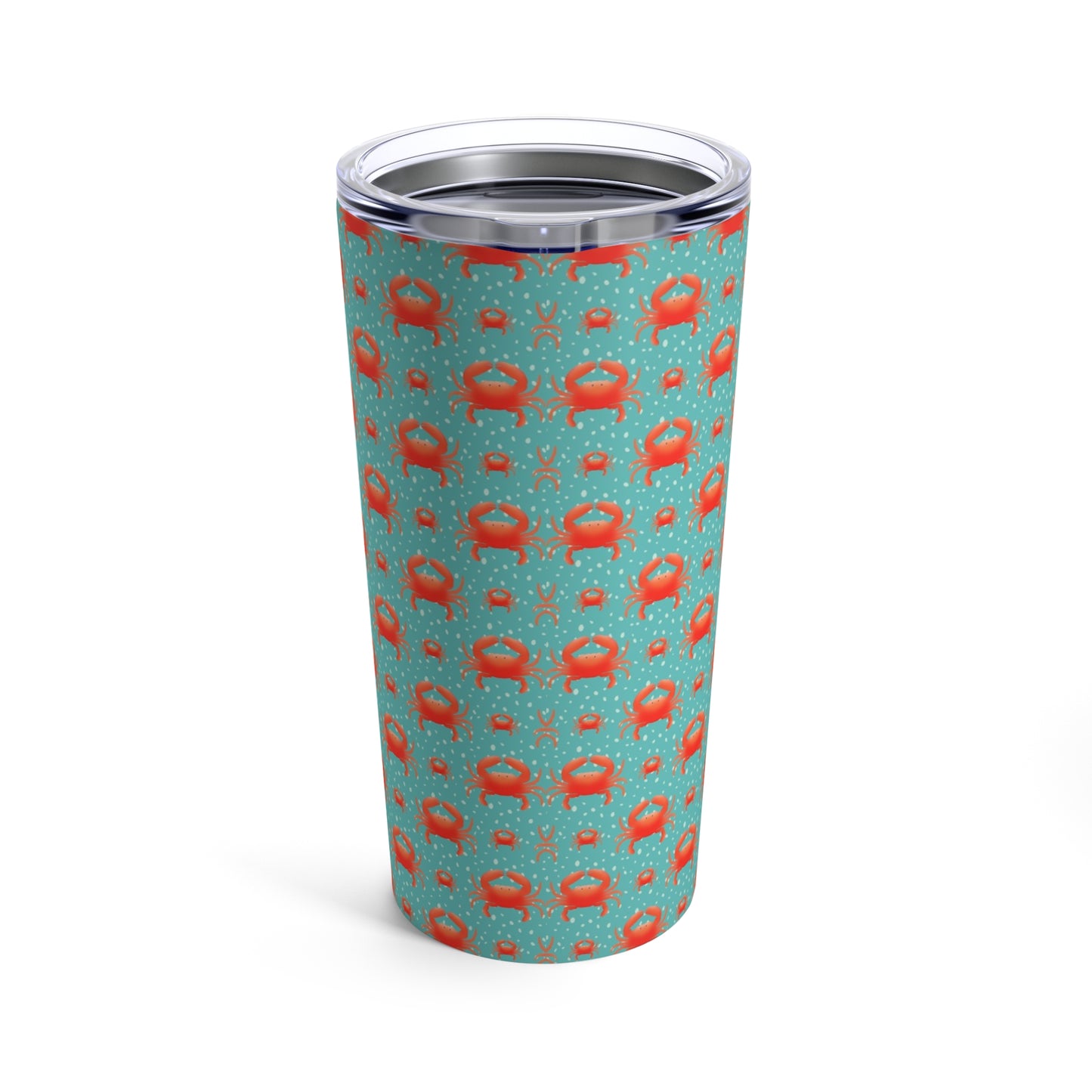 Introducing our 20-ounce stainless steel tumbler, featuring a charming crab design against a vibrant turquoise background, adorned with textured white dots. This stylish tumbler is perfect for keeping your beverages hot or cold while on the go. Whether you're sipping your morning coffee or enjoying a refreshing iced tea, this tumbler is sure to make a statement. With its durable stainless steel construction, it's ideal for both indoor and outdoor use. The double-wall insulation helps maintain the temperature of your drink, while the spill-resistant lid ensures mess-free sipping. Bring a touch of coastal charm to your daily routine with our crab-themed tumbler.
