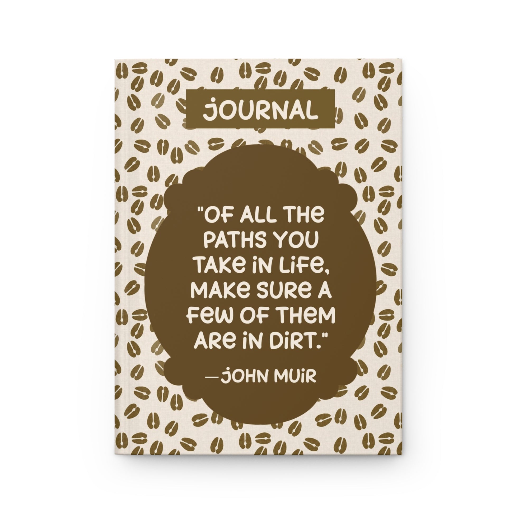This hardcover journal features a tossed pattern of deer tracks across a textured antique cream background, inspired by quiet forest paths. Centered within a decorative brown frame is the John Muir quote, “Of all the paths you take in life, make sure a few of them are in dirt.” Above it, the word Journal appears in antique cream over a rectangular brown frame, completing the layered, woodland-inspired design. Thoughtful and grounded, this journal is perfect for writing, reflection, and everyday notes.