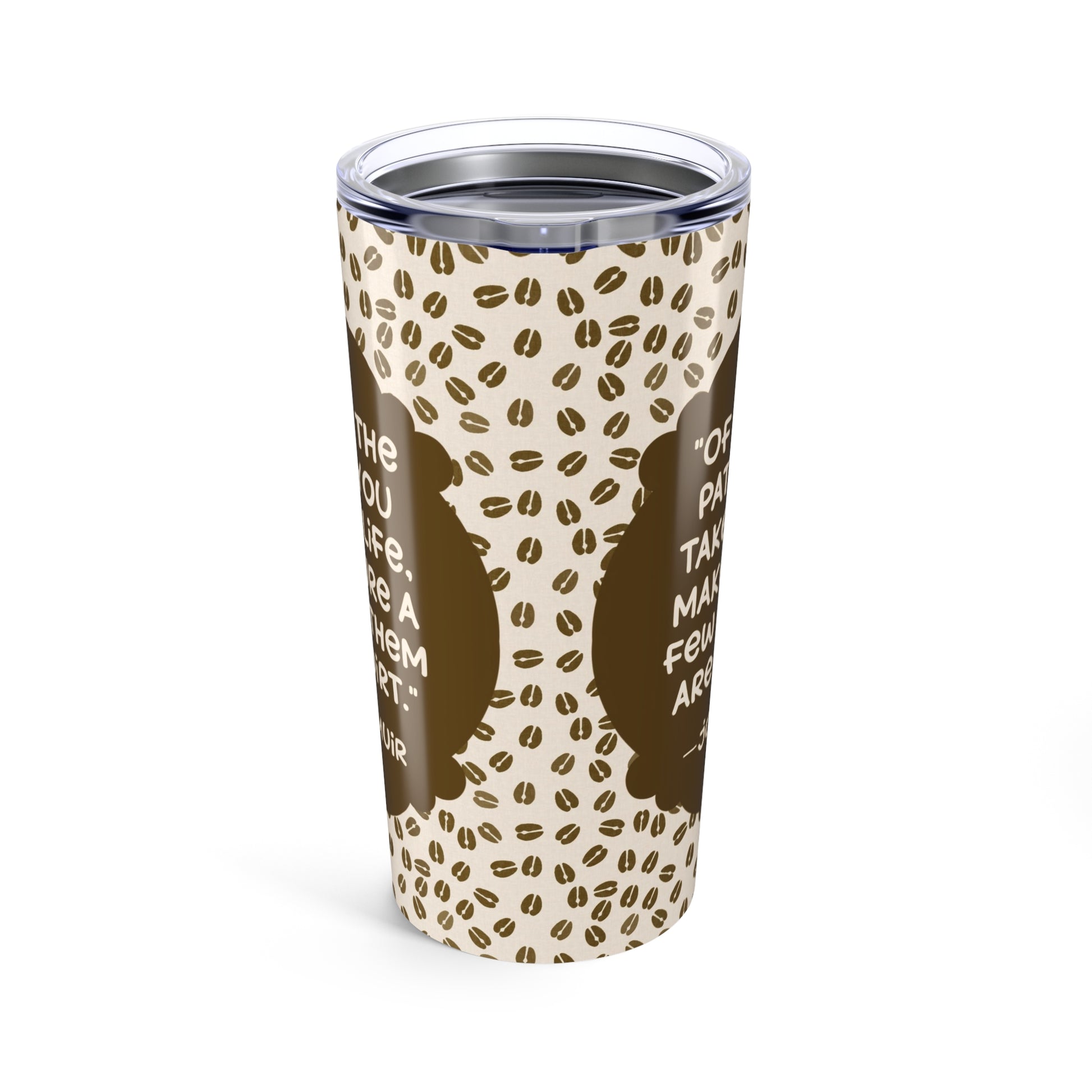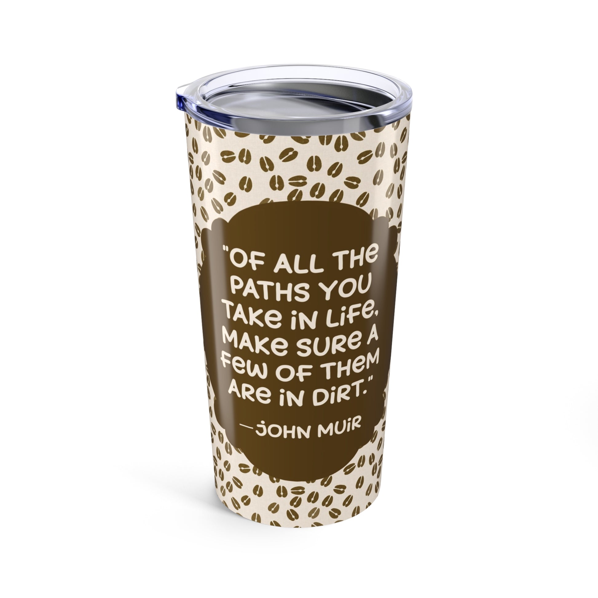 This 20 oz stainless steel travel mug features a tossed pattern of deer tracks across a textured antique cream background, inspired by quiet woodland paths. Centered within a decorative brown frame is the John Muir quote, “Of all the paths you take in life, make sure a few of them are in dirt.” Above it, the word Journal appears in antique cream over a rectangular brown frame, completing the layered, nature-inspired design. Durable and thoughtfully illustrated, this mug is perfect for coffee, tea, and slow mornings on the go.