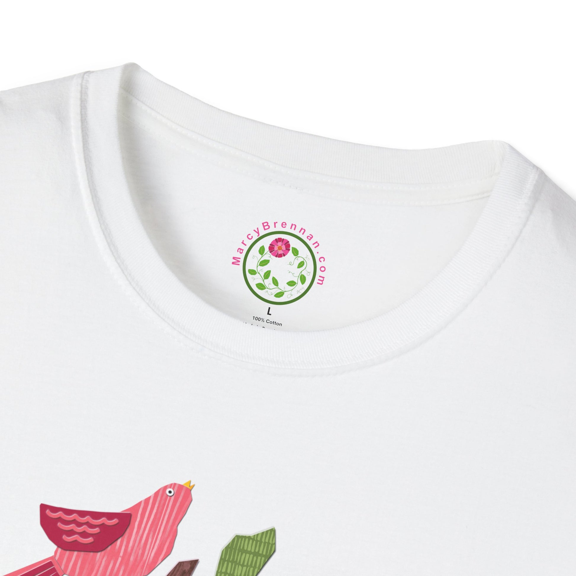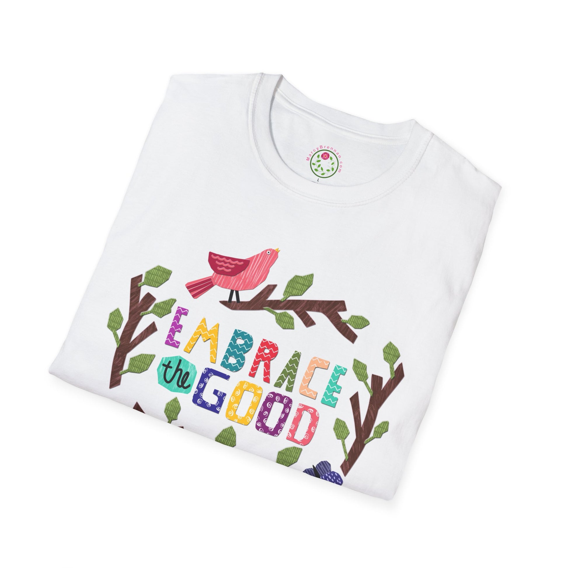 This soft-style t-shirt showcases a whimsical folk art paper cut collage design, featuring a bird nestled among branches, with vibrant, funky, and textured hand-lettering that says "Embrace the Good." A cute purple butterfly adds a playful touch to the design. Made from premium, soft fabric, this shirt combines comfort with a positive, nature-inspired message—perfect for adding a burst of color and good vibes to your wardrobe.