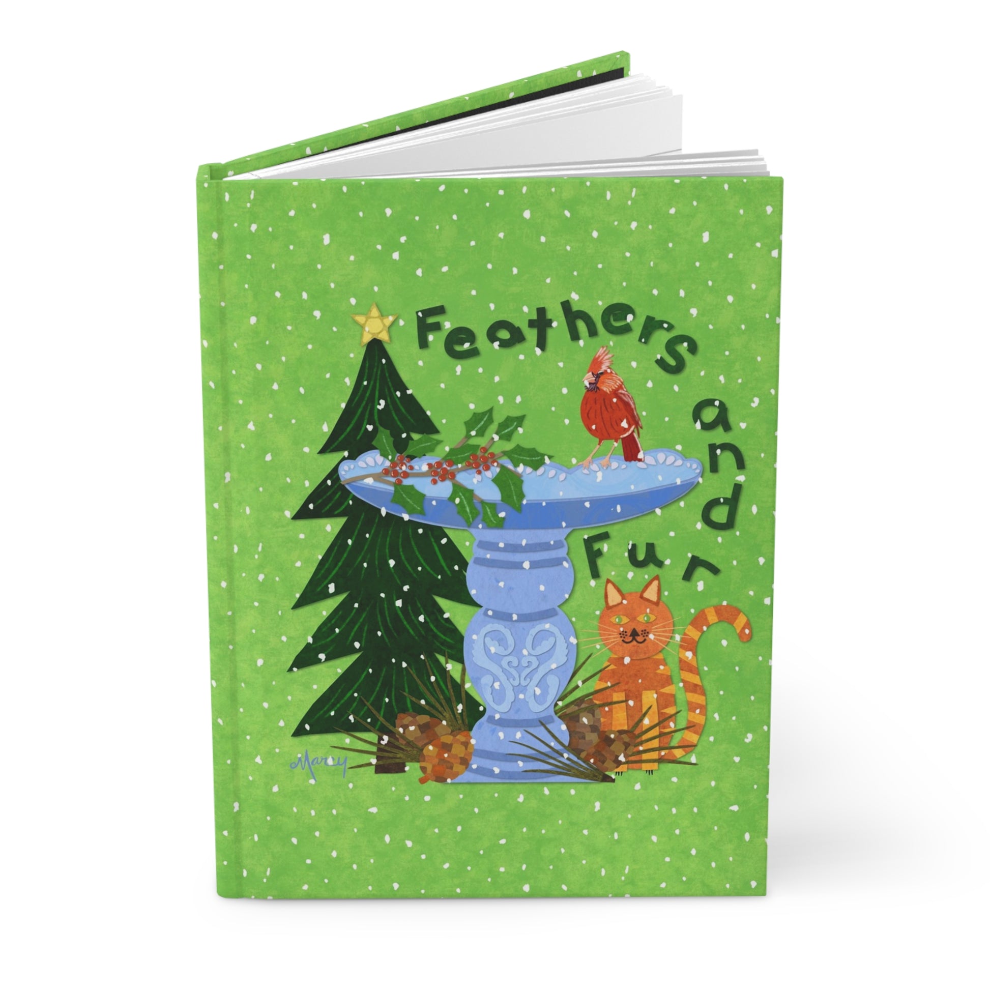 Capture your thoughts, dreams, and everyday moments in this charming hardcover journal featuring my Feathers and Furcollage illustration. The cover showcases a bright red cardinal perched on a birdbath accented with a sprig of holly, while a curious ginger tabby cat sits nearby soaking in the snowy winter day. A tiny Christmas tree adds a festive touch, and pine cones and pine needles rest at the base of the birdbath for a warm woodland feel. Hand-lettered text spelling “Feathers and Fur” brings the design together. Set against a textured bright green background with falling snow, this journal is the perfect blend of cozy, whimsical, and seasonal charm. Ideal for holiday journaling, gift-giving, or adding a touch of winter magic to your everyday writing routine.