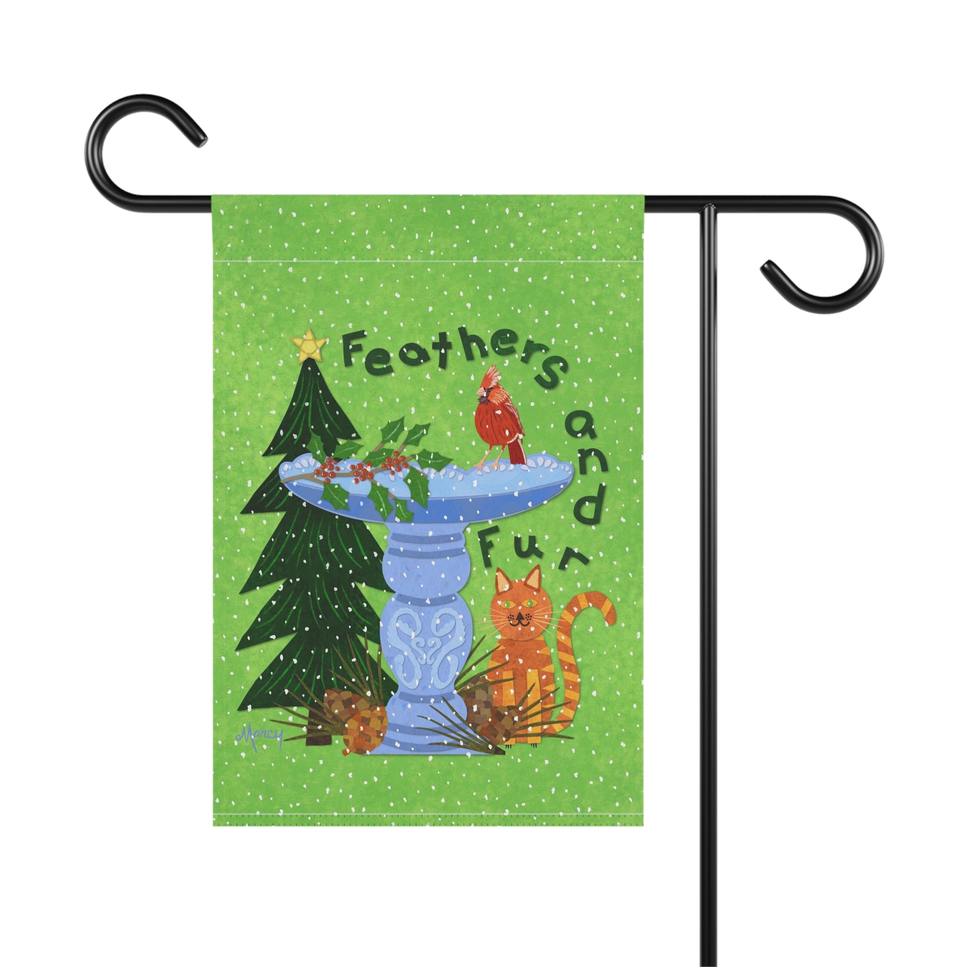 Welcome guests with festive charm using this beautifully crafted garden banner featuring my Feathers and Fur collage illustration. The design showcases a bright red cardinal perched on a birdbath accented with a sprig of holly, alongside a sweet ginger tabby cat taking in the snowy winter scene. A tiny Christmas tree adds a touch of seasonal magic, while pine cones and pine needles rest at the base of the birdbath for a cozy woodland feel. Hand-lettered “Feathers and Fur” adds a warm, whimsical touch. Set against a textured bright green background with softly falling snow, this durable outdoor banner brings delightful holiday cheer to porches, yards, walkways, and gardens. Perfect for adding a heartwarming winter accent to your outdoor decor or gifting to someone who loves animals and Christmas charm.