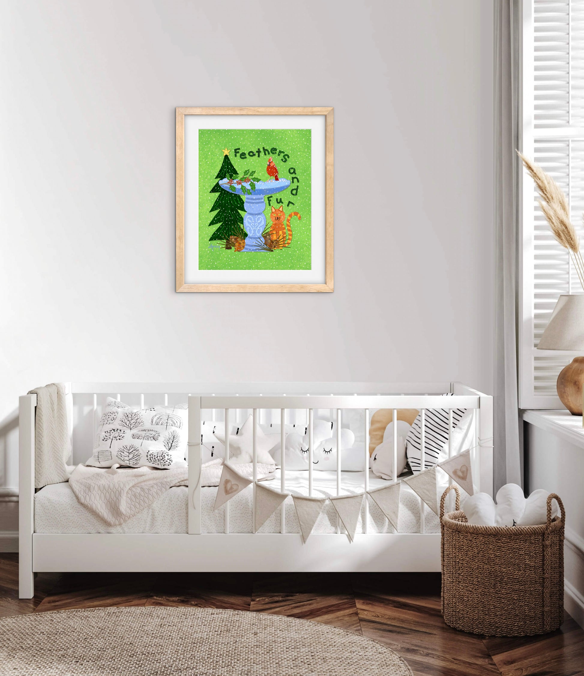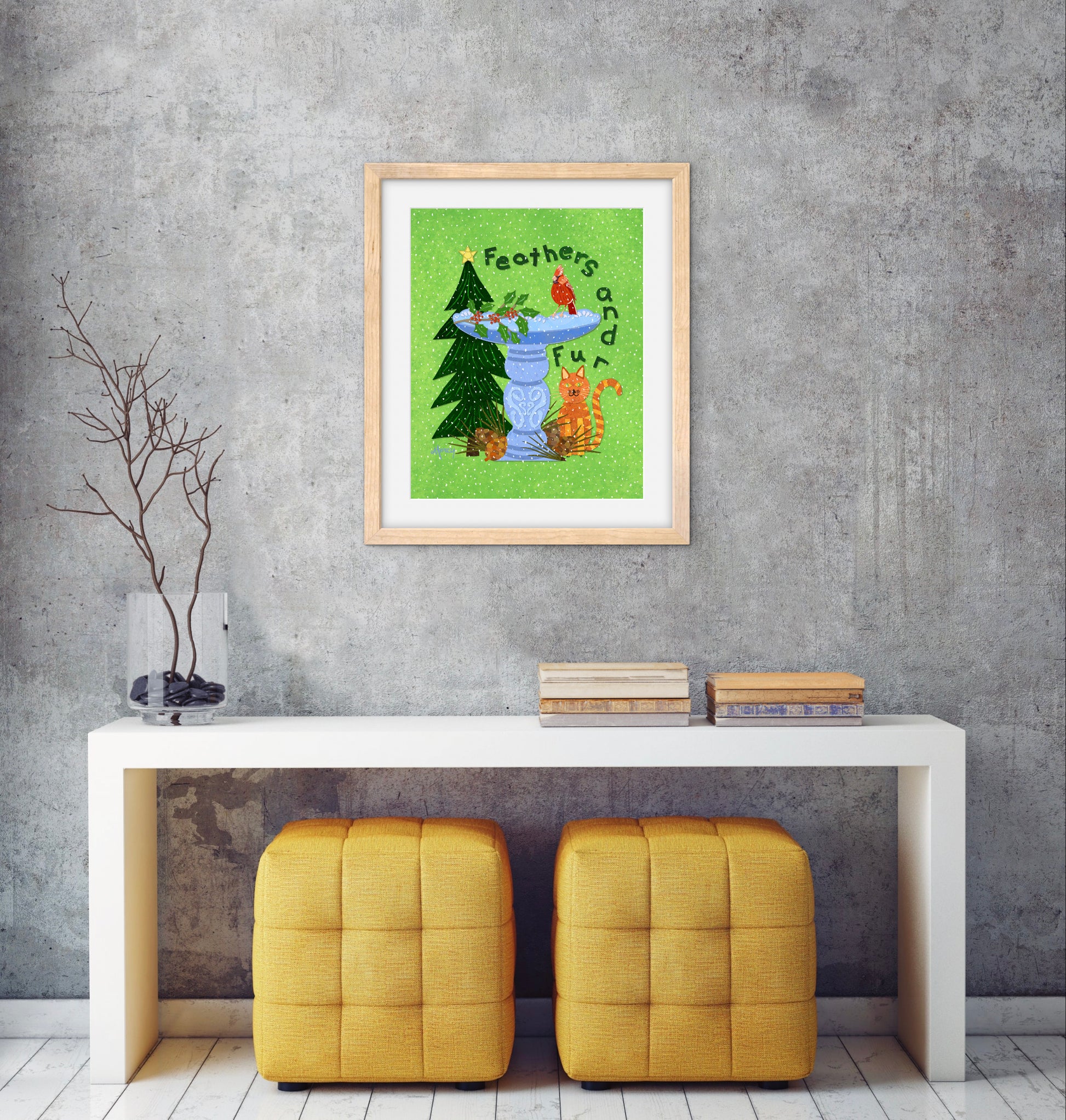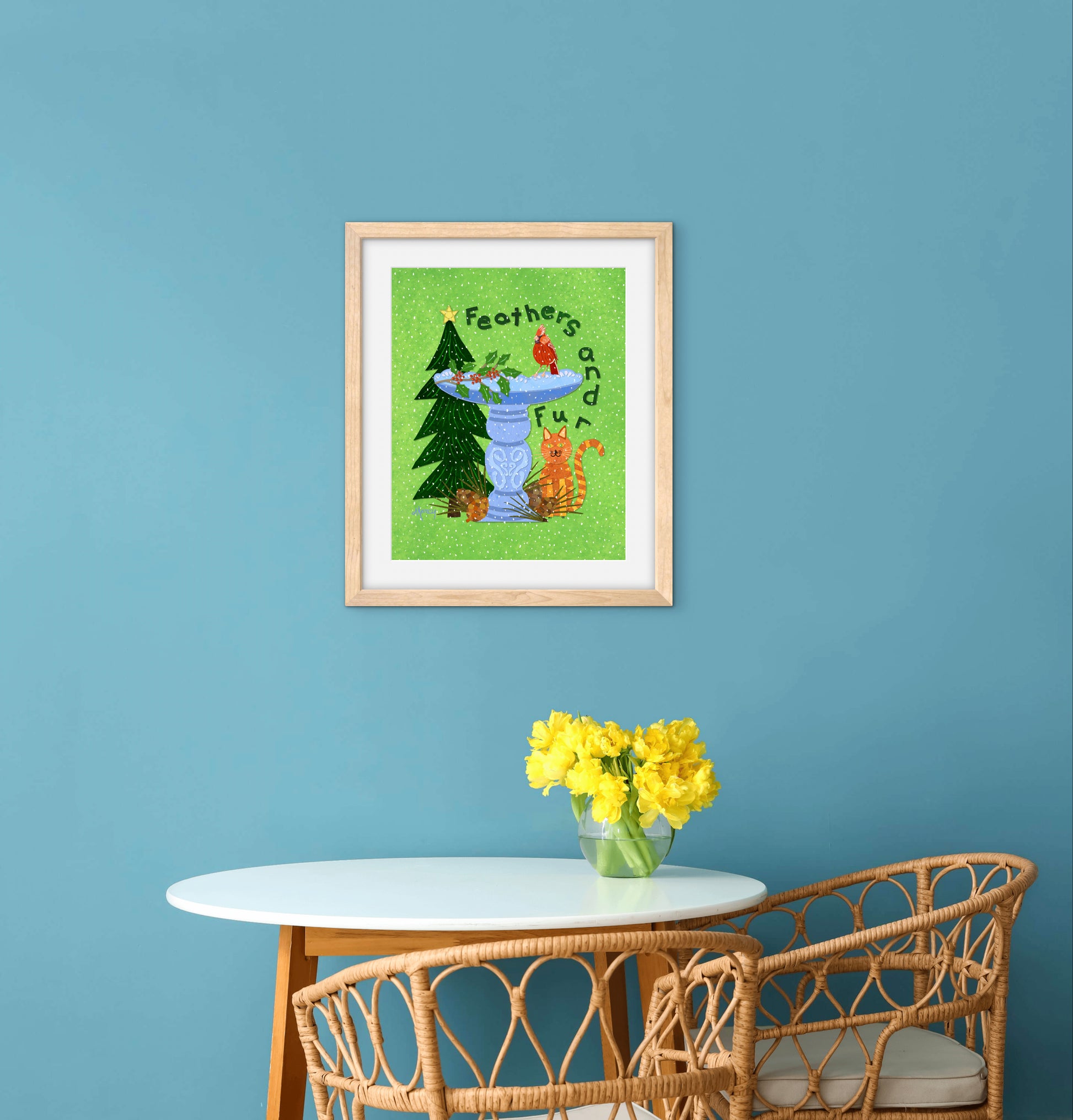 Elevate your holiday décor with this wood framed premium matte print featuring my Feathers and Fur collage illustration. This festive artwork showcases a bright red cardinal perched on a birdbath accented with a sprig of holly, while a curious ginger tabby cat watches nearby. A tiny Christmas tree adds whimsy and cheer, with pine cones and pine needles nestled at the base of the birdbath to complete the cozy woodland scene. The hand-lettered phrase “Feathers and Fur” adds a warm, artistic touch. Set against a textured bright green background on a softly snowing day, this premium matte print—enhanced by a beautifully crafted wooden frame—brings a charming, heartwarming winter moment to any wall. Perfect for holiday decorating, gifting, or enjoying year-round.