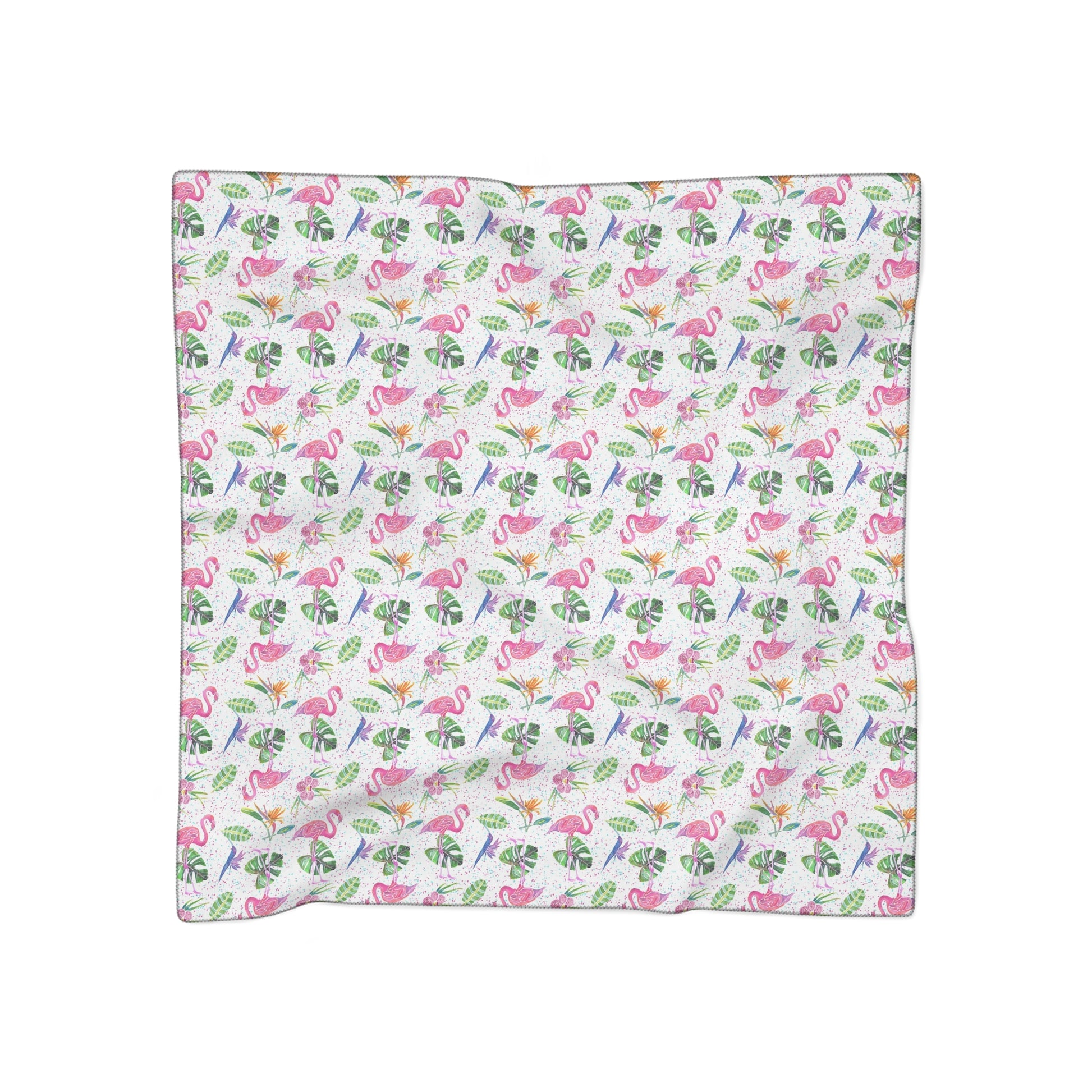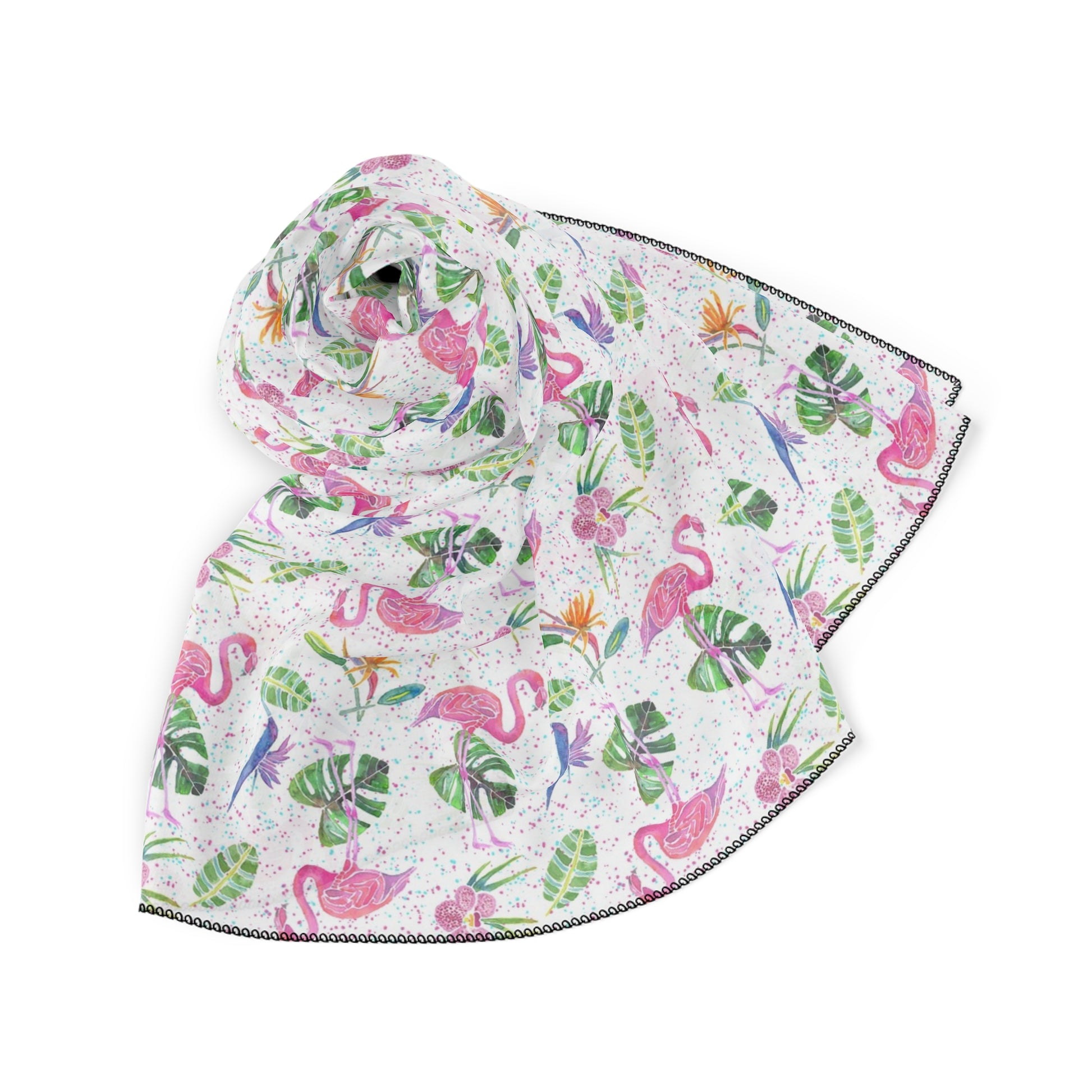Introducing our exquisite square poly scarf featuring the vibrant "Flamingo Party" design. This playful accessory showcases cheerful pink flamingos surrounded by lush tropical foliage, including striking monstera and banana leaves. Accented with delicate pink orchids and the exotic beauty of birds of paradise flowers, this design truly comes to life. The white background is adorned with colorful pastel splatters, adding a whimsical touch to your ensemble. Made from high-quality poly fabric, this scarf is lightweight, soft, and perfect for adding a splash of tropical flair to any outfit.