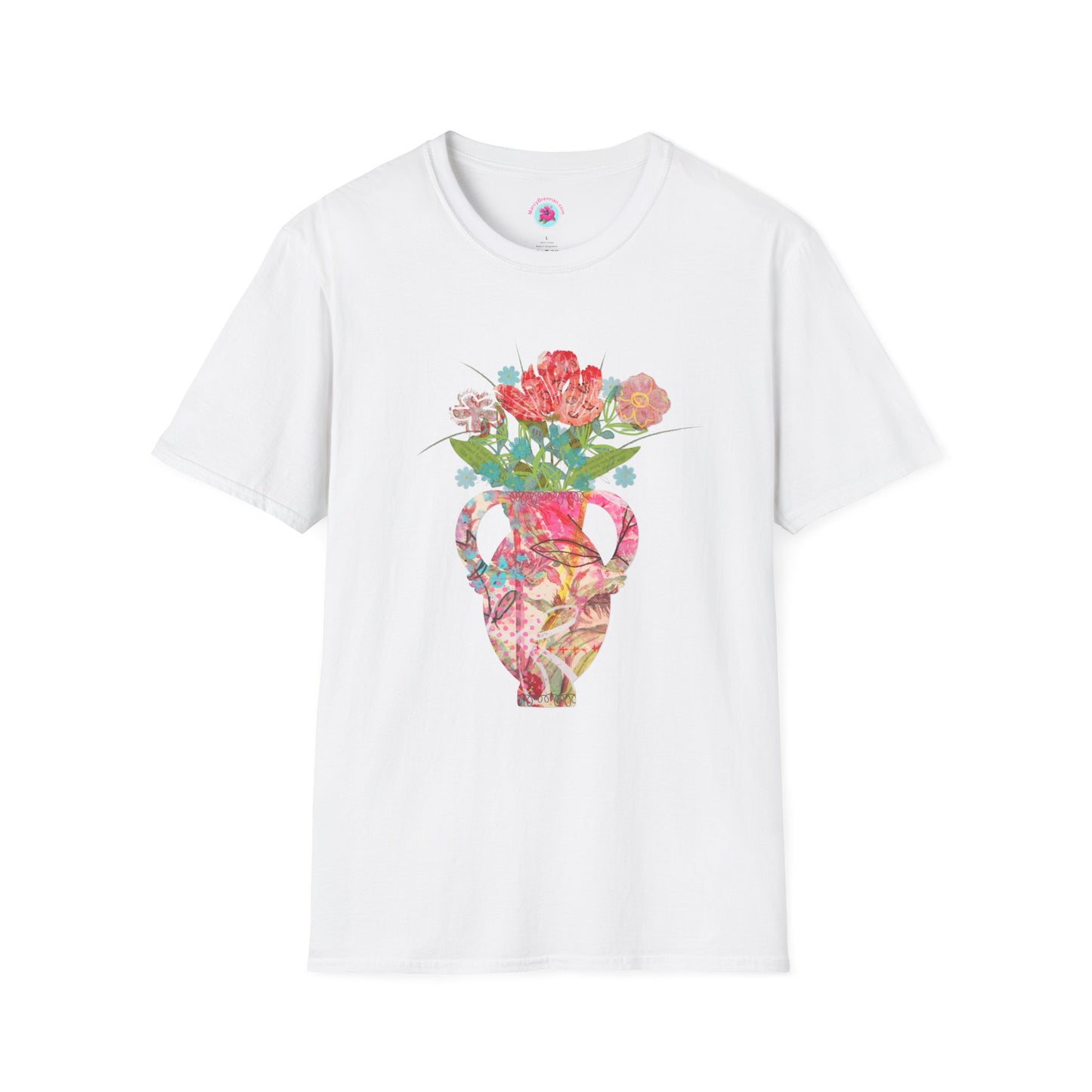 Add a touch of vintage charm to your wardrobe with this softstyle t-shirt featuring a unique digital collage design. At the heart of the artwork is a vintage-style vase overlaid with pink and yellow abstract floral collage paper, overflowing with red floral accents and whimsical blue daisies. Soft, comfortable, and effortlessly artistic—this tee is perfect for creatives, nature lovers, and fans of mixed media art.