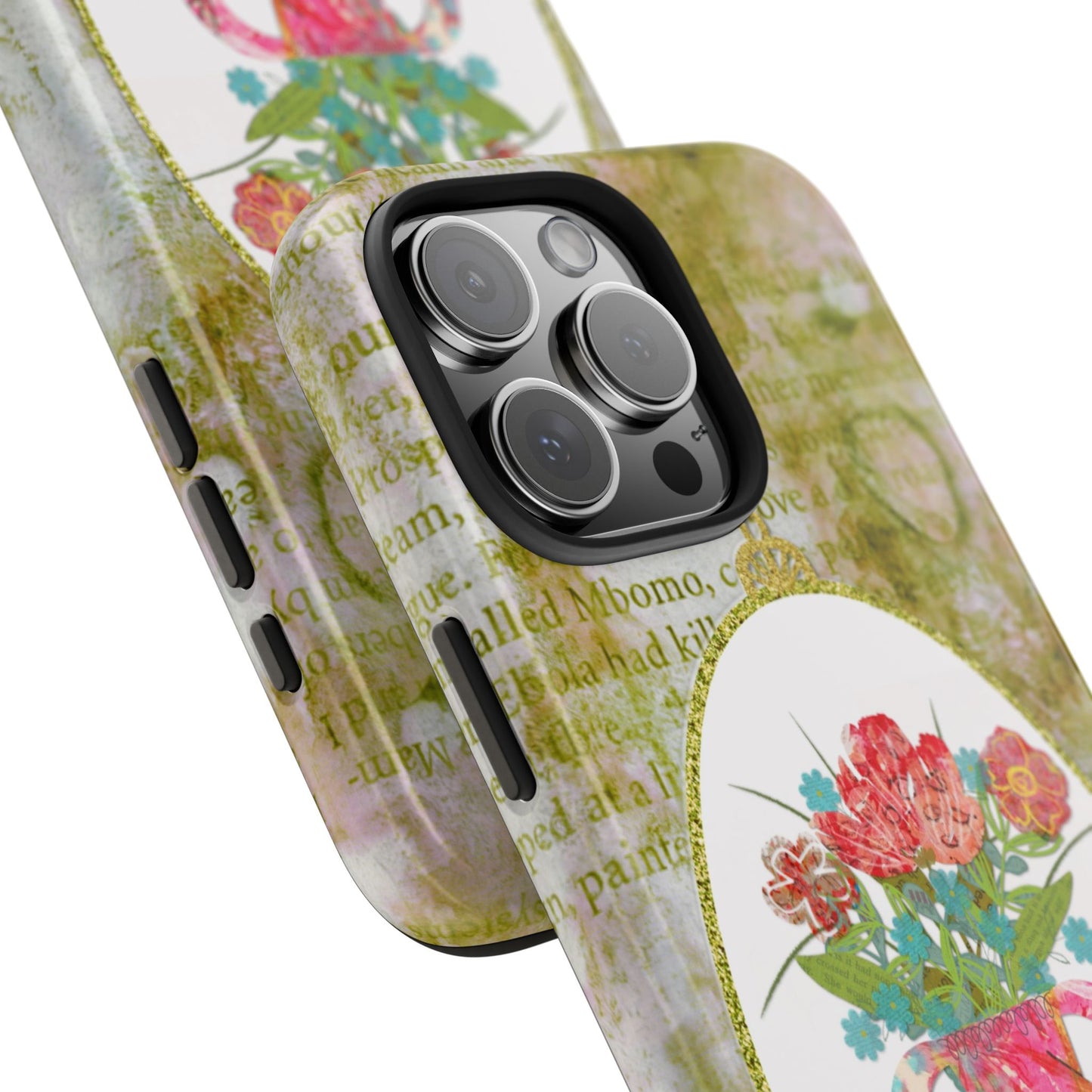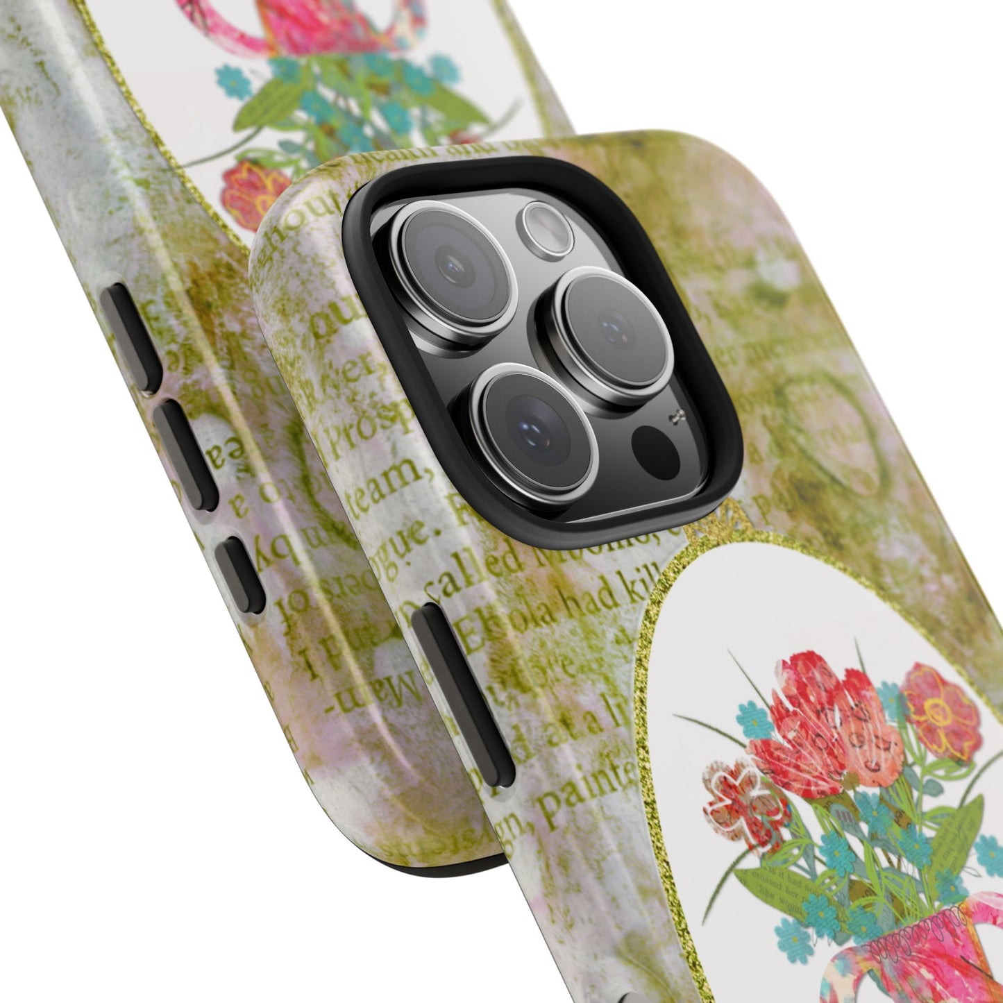 Add timeless charm and artistic flair to your device with this unique tough phone case featuring a vintage-inspired collage design. At the heart of the illustration is a classic vase overflowing with a vibrant bouquet of flowers and greenery. The vase is beautifully overlaid with abstract floral collage papers in soft pinks and sunny yellows, while the three large blooms pop with rich red collage textures. Scattered blue daisies add playful detail, all elegantly arranged on an oval white backdrop framed by a dazzling ornate gold glitter border. The background features a textured, golden abstract surface made from a transformed National Geographic page, adding depth, character, and a touch of literary nostalgia. With its vintage aesthetic and bold layered composition, this tough case offers both protection and personality for your phone.
