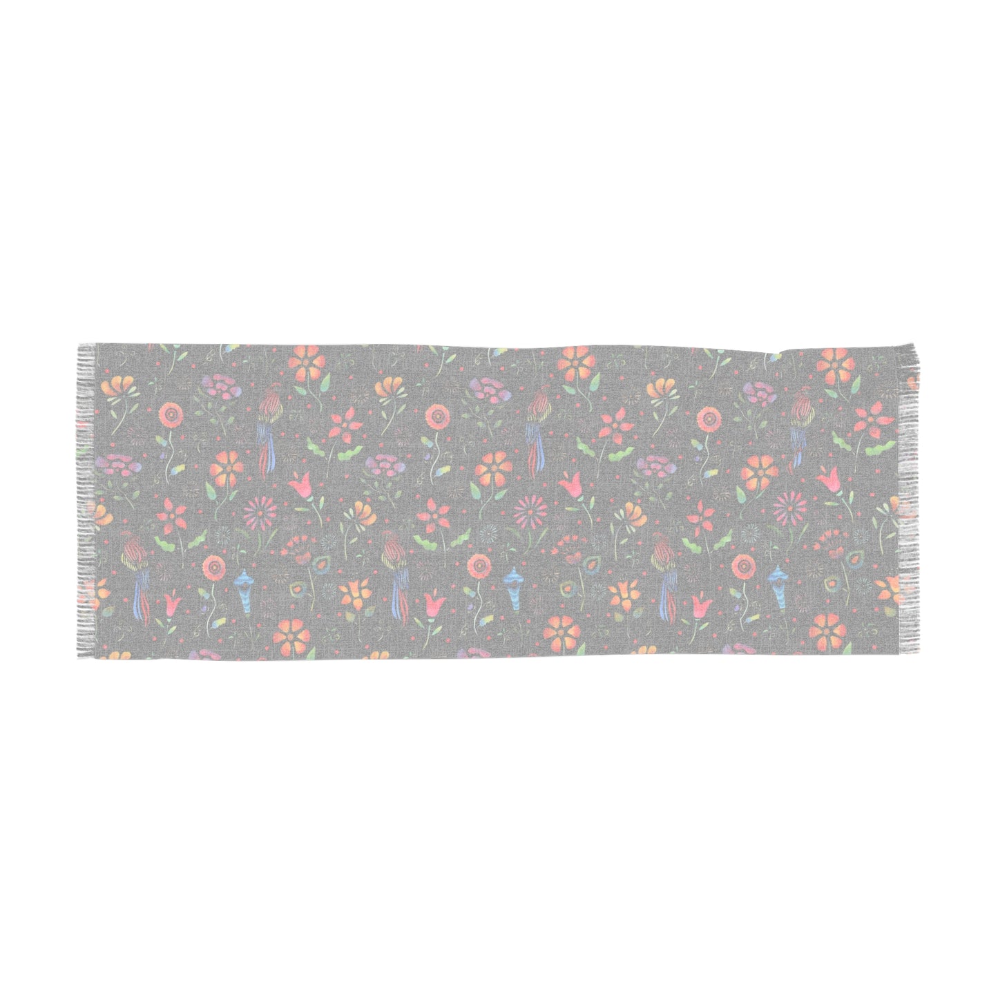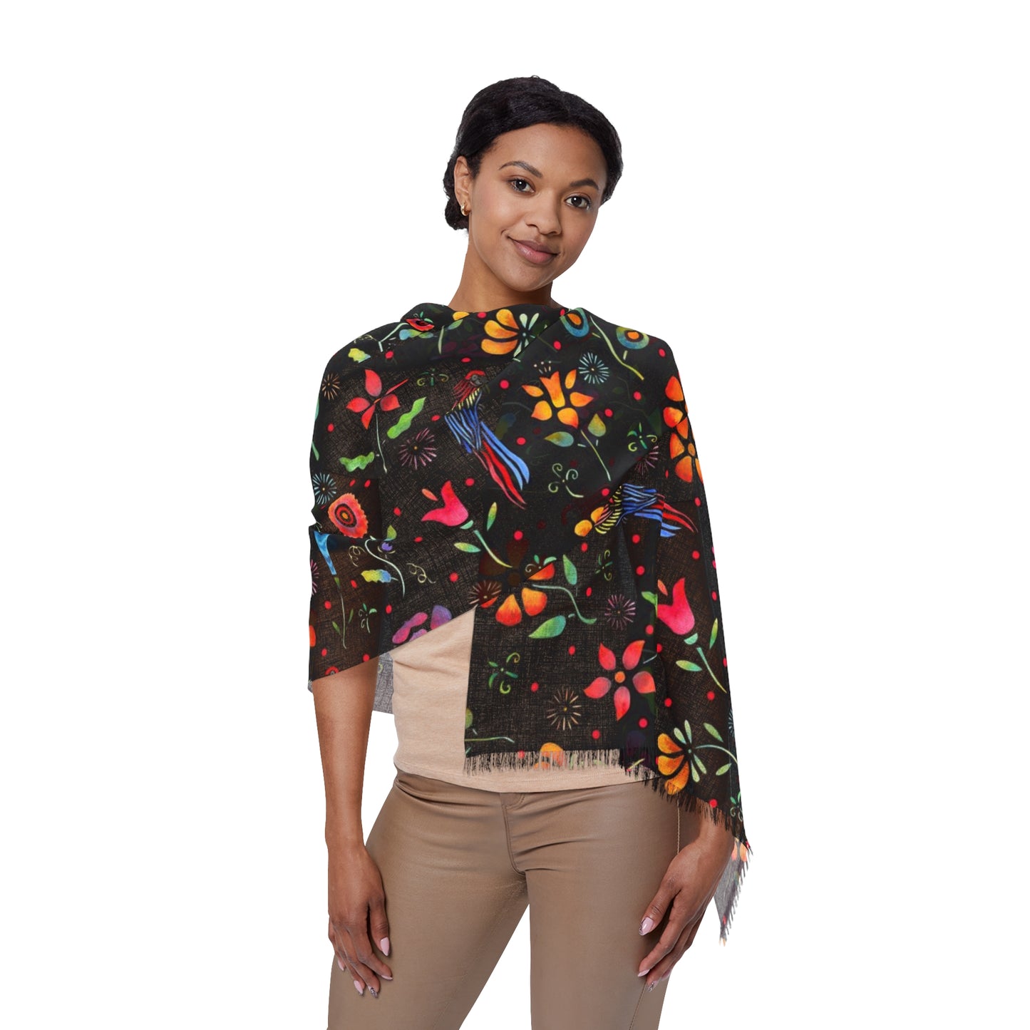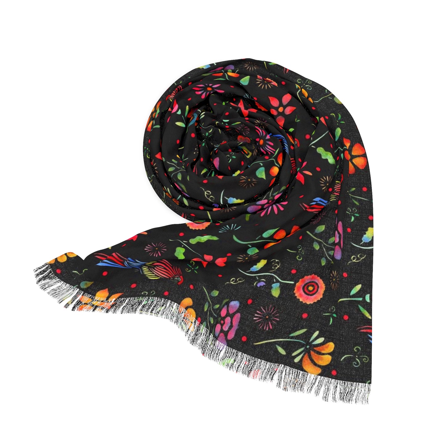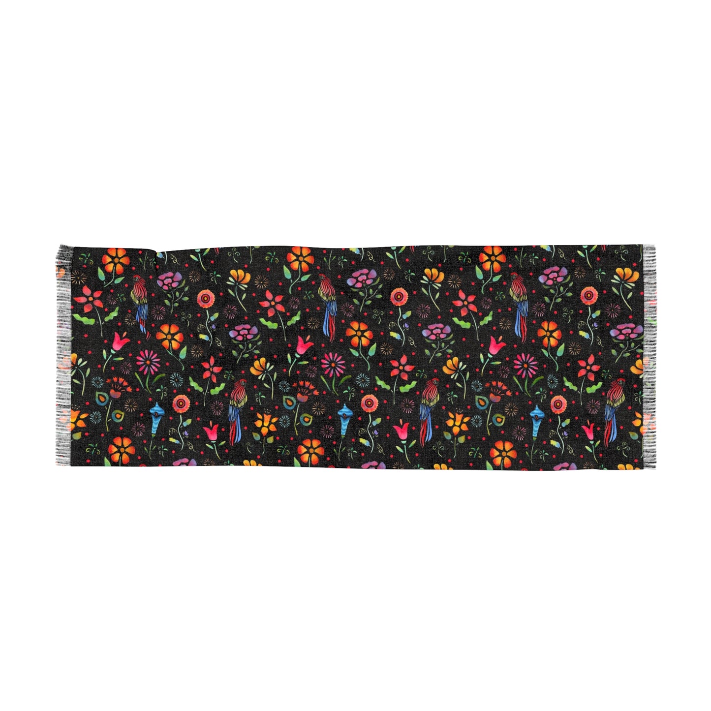 Introducing the Frida Flowers lightweight rectangular scarf, a stunning accessory that is perfect for adding a pop of color to any outfit. The scarf features a vibrant handpainted watercolor Mexican folk art flower design with a black background, giving it a bold and eye-catching look.