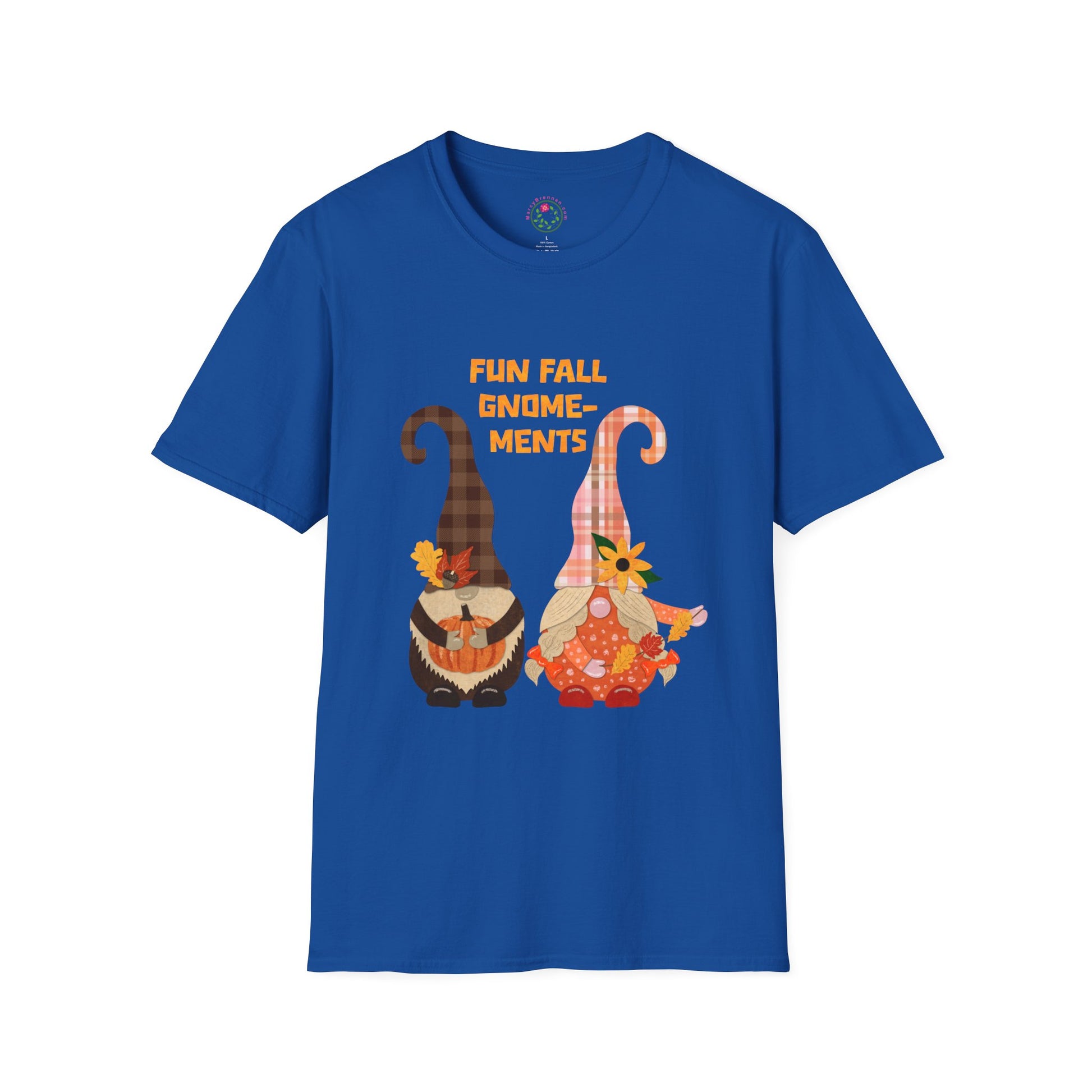 Celebrate cozy autumn style with this “Fun Fall Gnome-ments” softstyle t-shirt! This charming design features an adorable boy and girl gnome dressed in festive fall outfits, each topped with a plaid hat for a touch of rustic warmth. The boy gnome holds a bright pumpkin, while the girl gnome carries a dainty garland of colorful fall leaves — together, they bring joyful harvest vibes wherever you go.