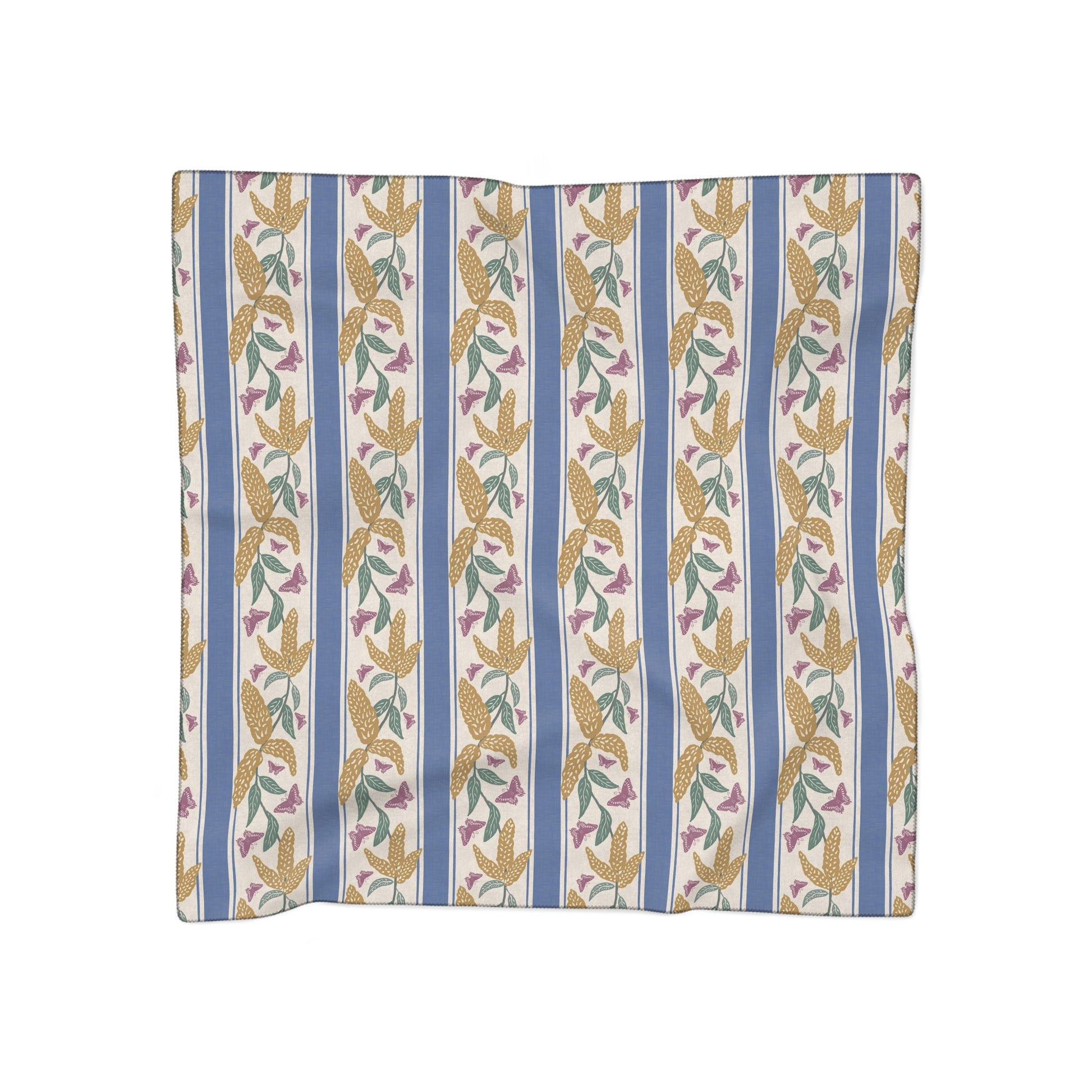Add a soft, artful accent to your wardrobe with this square poly scarf featuring my “Goldenrod and Butterflies” design. Antique gold goldenrod flowers and mulberry rose butterflies drift across a gently textured soft cream background, layered with classic deep cornflower blue ticking stripes for a timeless, garden-inspired look.