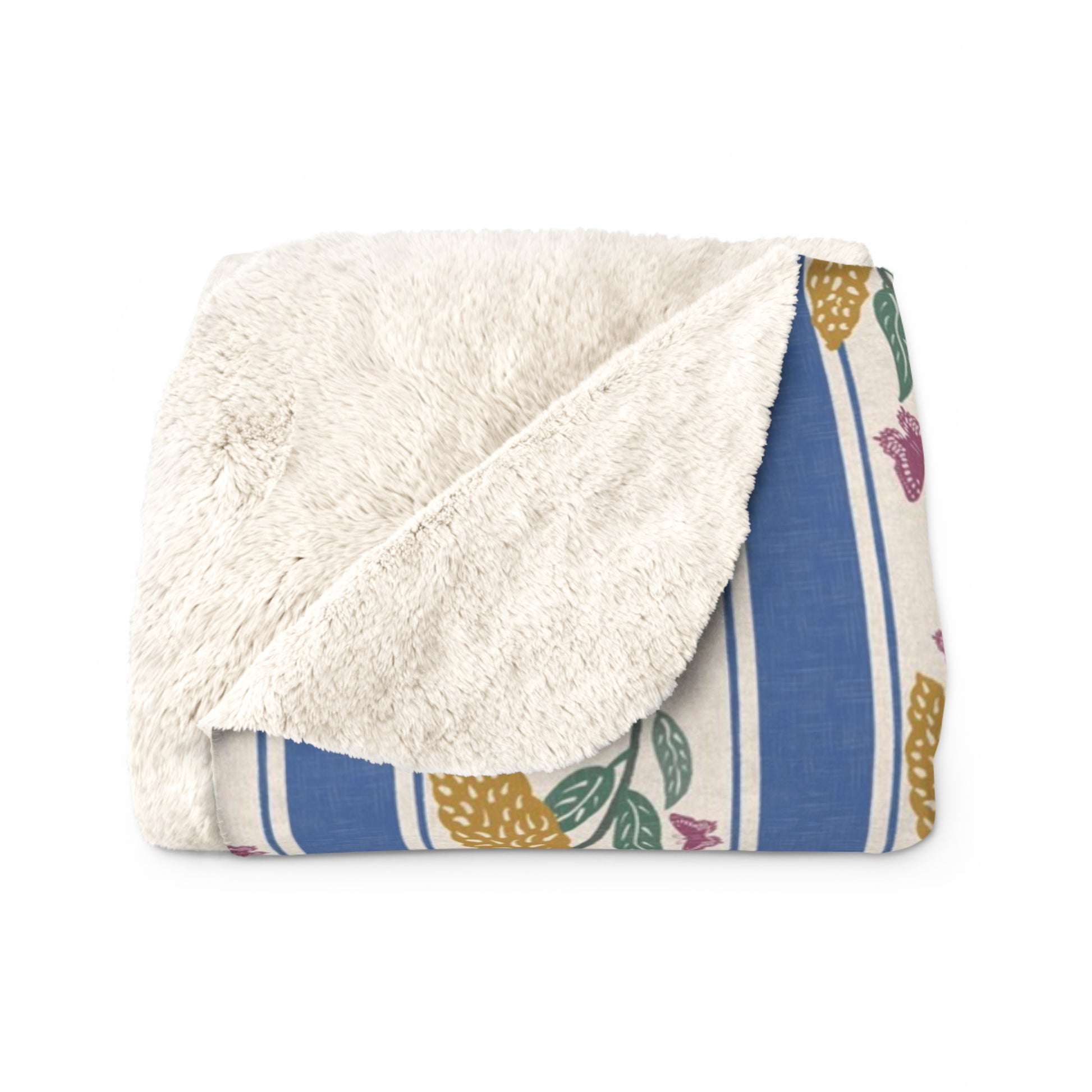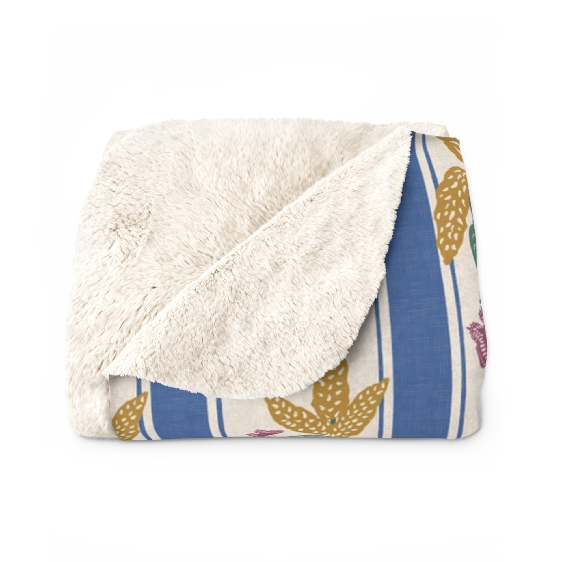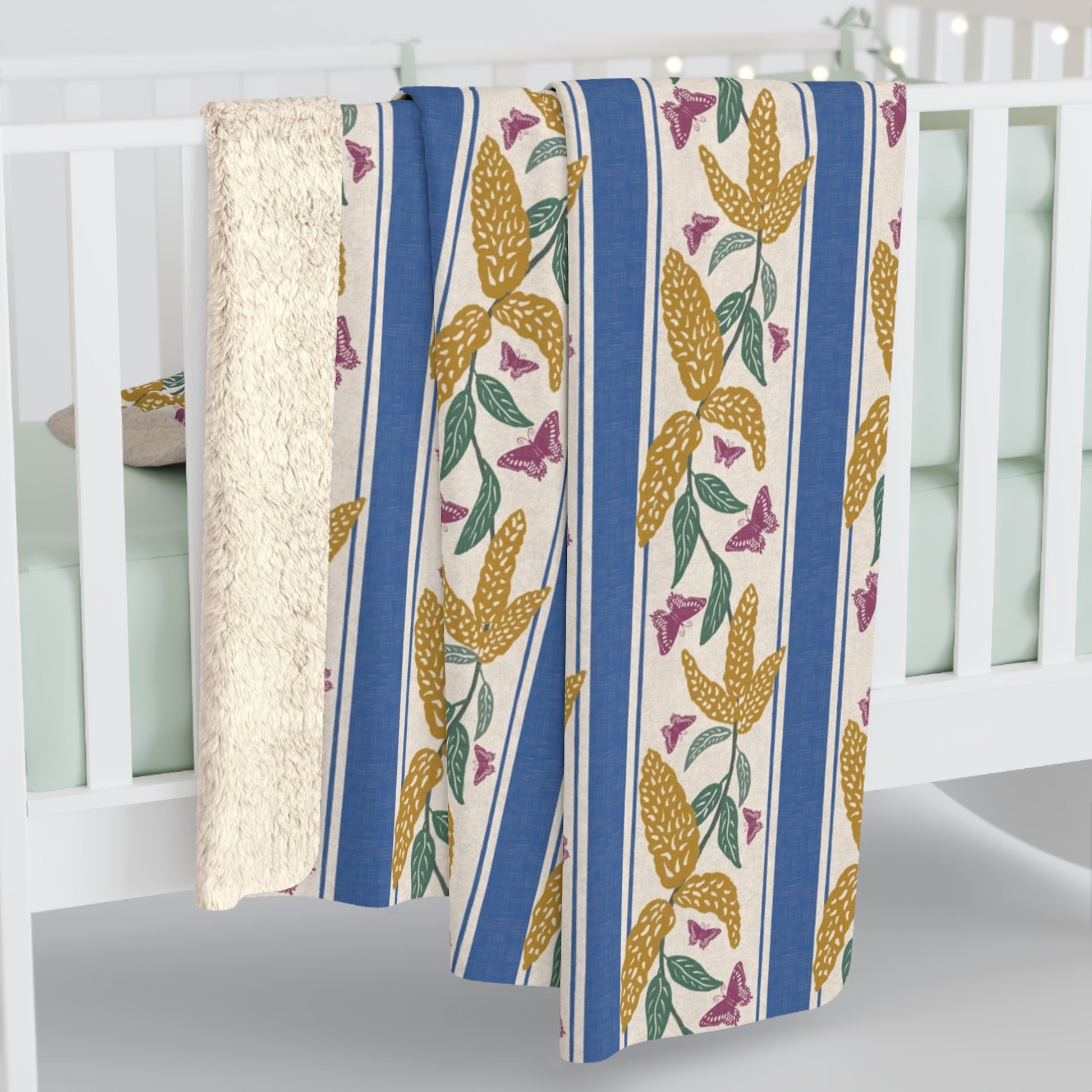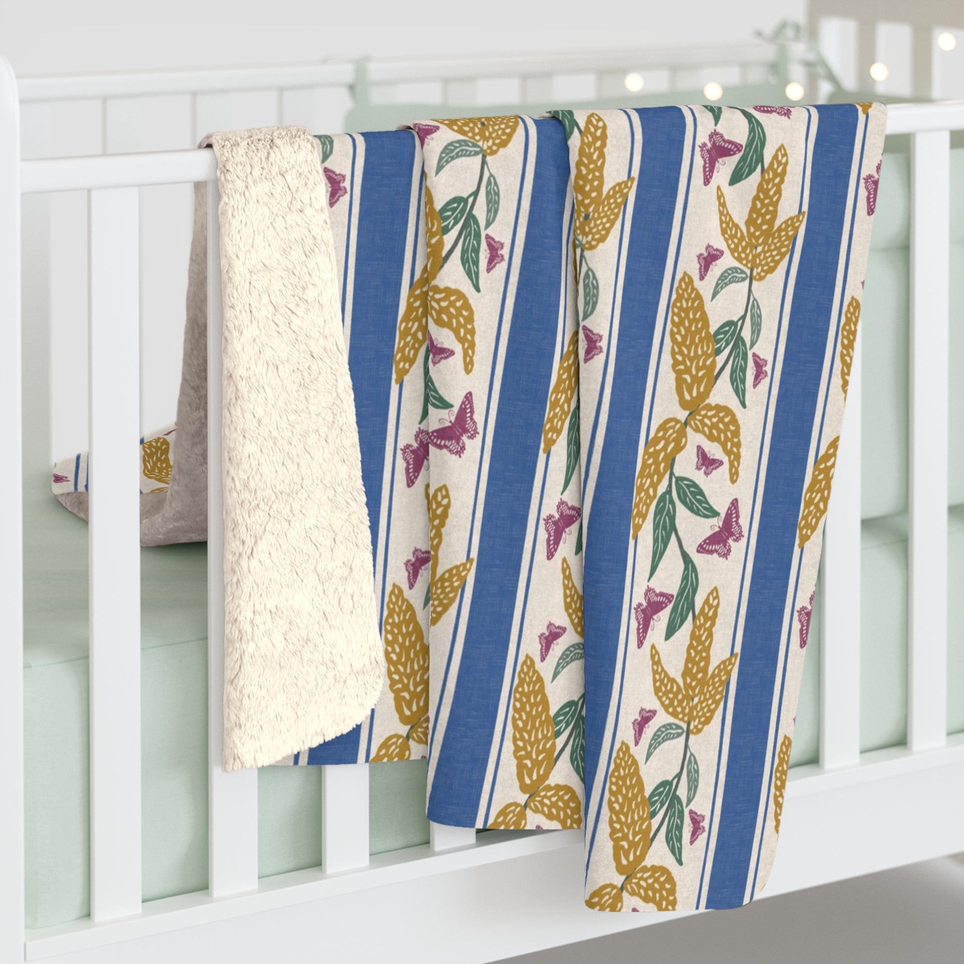 Wrap yourself in comfort and quiet beauty with this Sherpa fleece blanket featuring my “Goldenrod and Butterflies”design. Antique gold goldenrod flowers bloom across a softly textured cream background, accompanied by delicate butterflies illustrated in mulberry rose. Deep cornflower blue ticking stripes add a timeless, farmhouse-inspired rhythm beneath the florals.