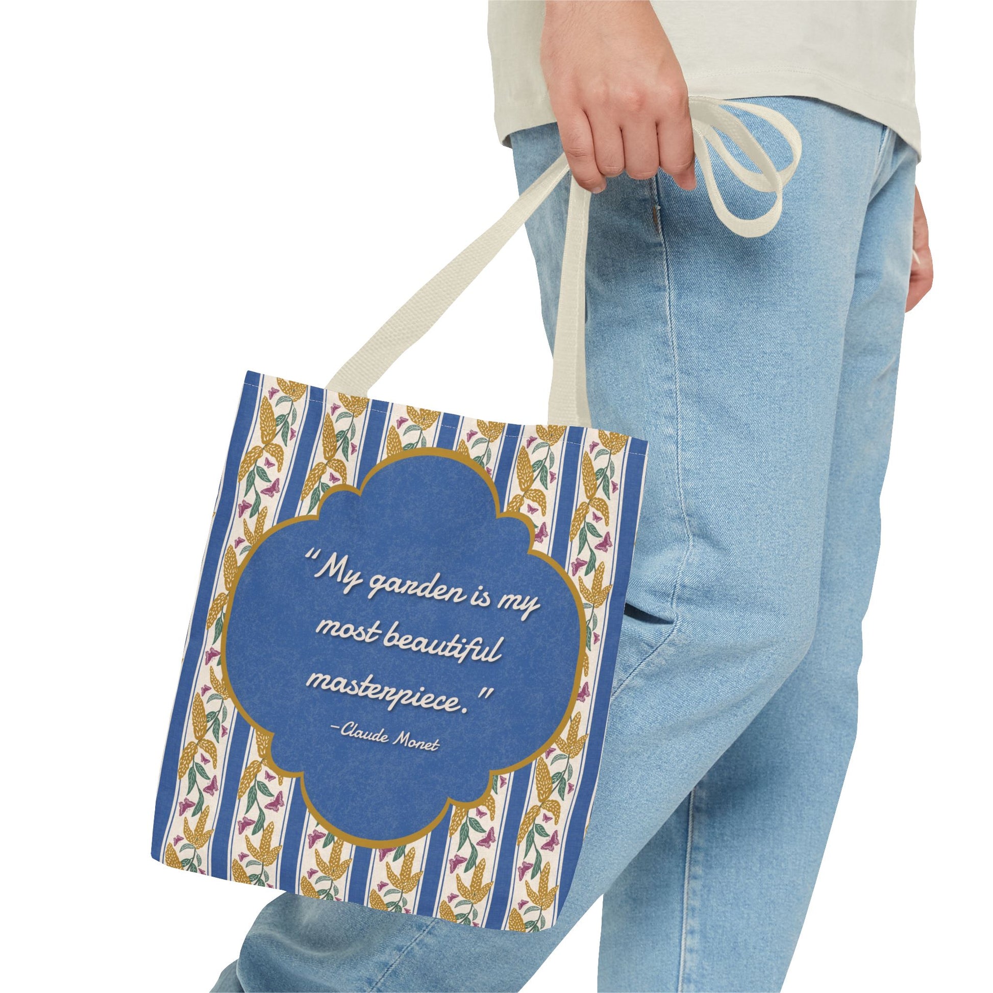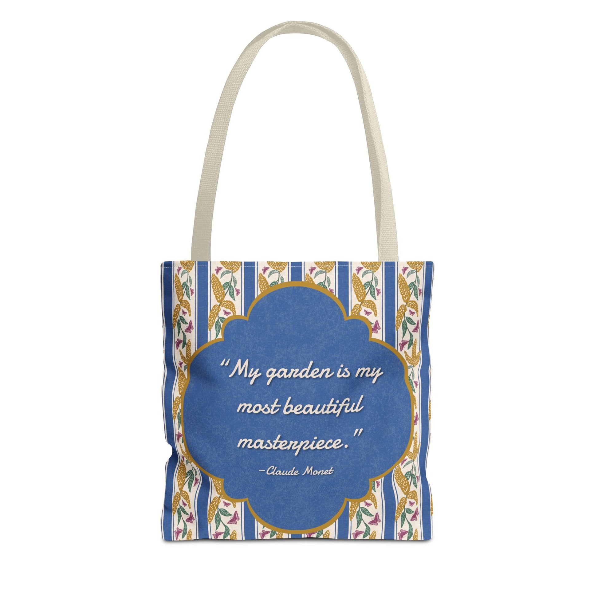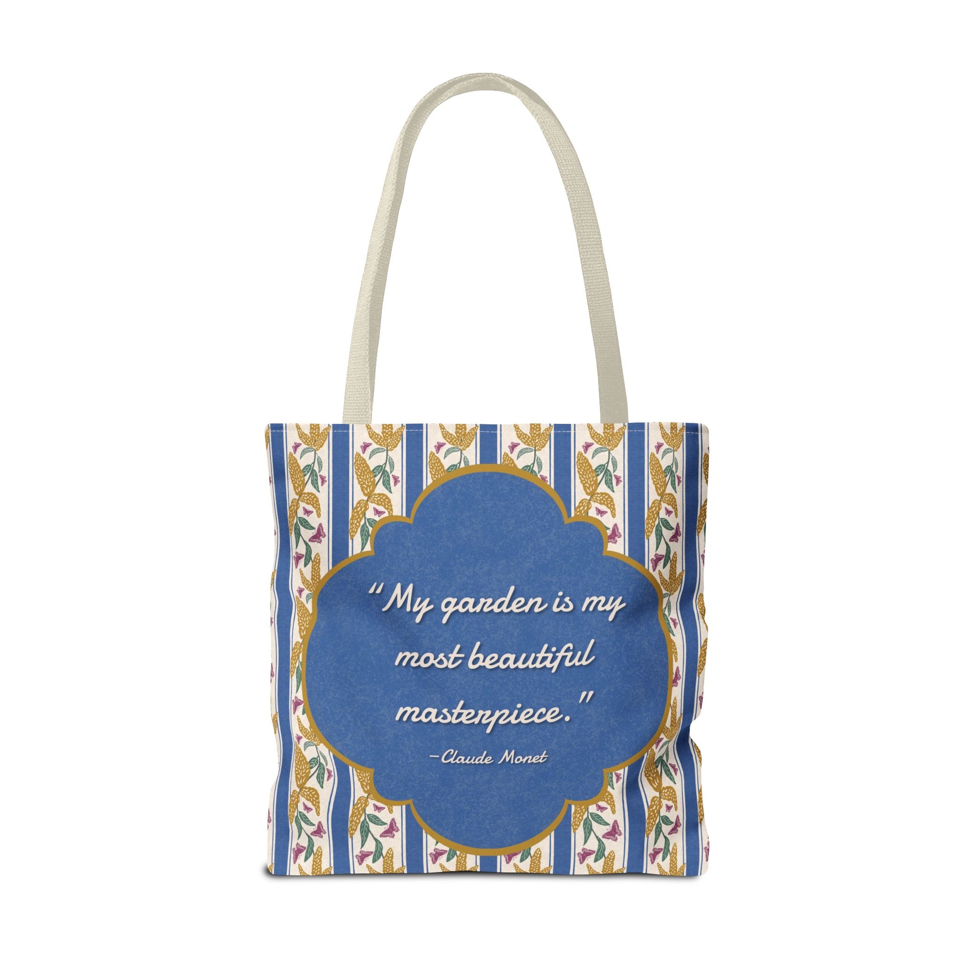 Carry a piece of garden poetry wherever you go with this Goldenrod and Butterflies tote bag. Antique-gold goldenrod blooms and mulberry rose butterflies float across classic deep cornflower blue ticking stripes on a softly textured cream background. Centered on the design, a decorative cornflower blue frame outlined in antique gold features Claude Monet’s quote, “My garden is my most beautiful masterpiece.” A timeless tote for market days, library trips, and everyday errands inspired by nature and art.