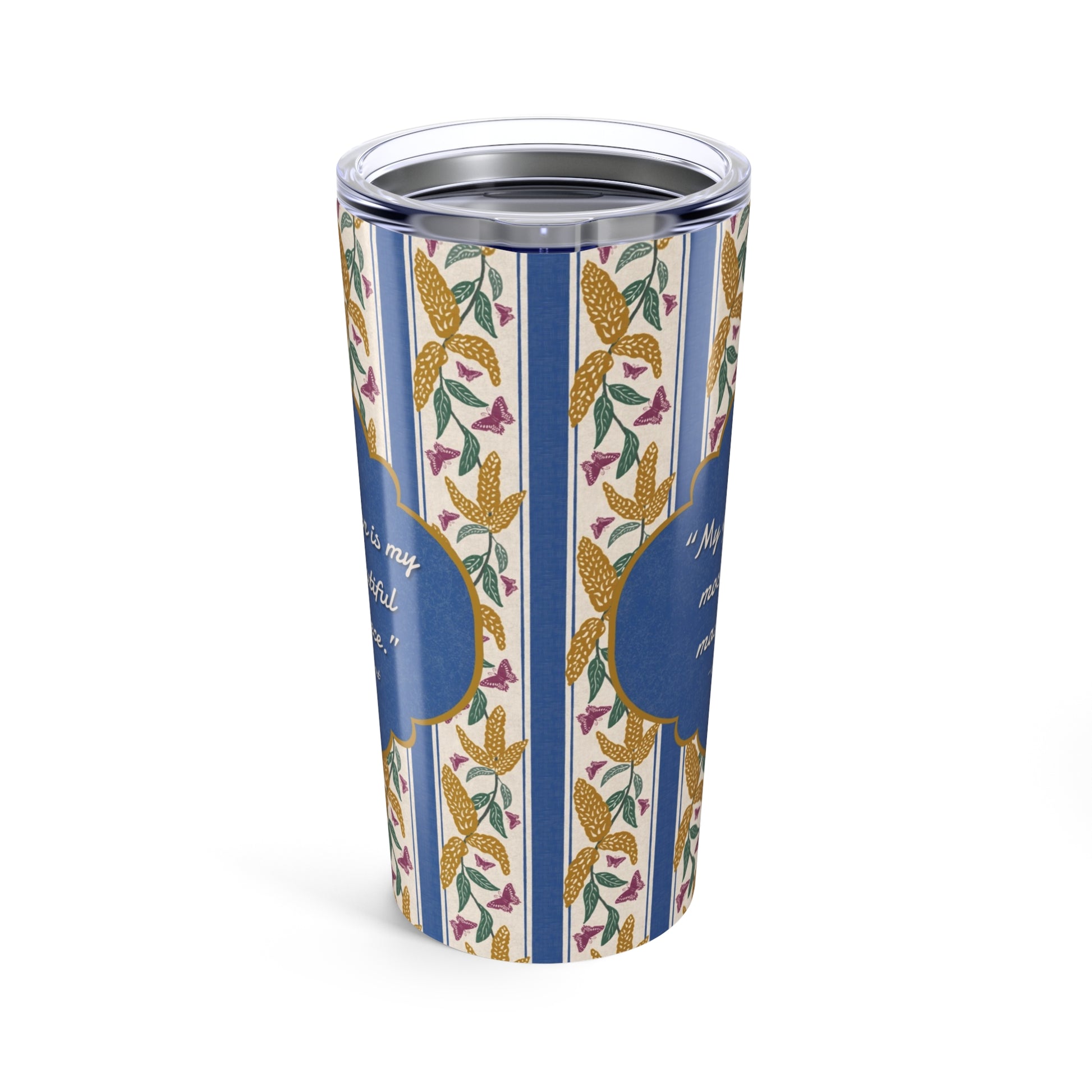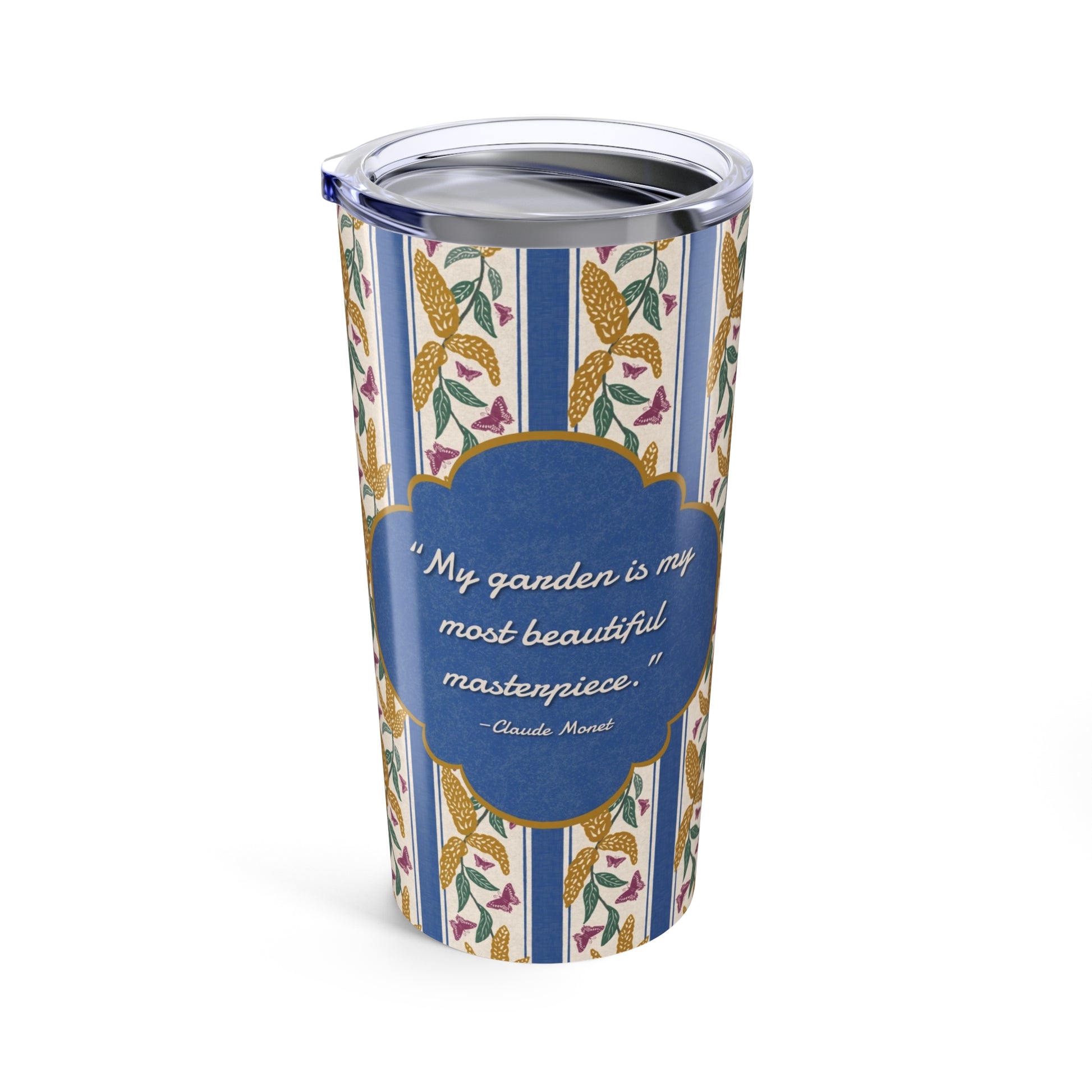 Sip slowly and savor beauty with this Goldenrod and Butterflies 20 oz stainless steel mug. Antique-gold goldenrod blooms and mulberry rose butterflies rest over classic deep cornflower blue ticking stripes on a softly textured cream background. Centered on the design, Claude Monet’s quote, “My garden is my most beautiful masterpiece,” is framed in cornflower blue and edged with a fine antique-gold outline. A timeless mug inspired by gardens, artistry, and quiet moments outdoors.