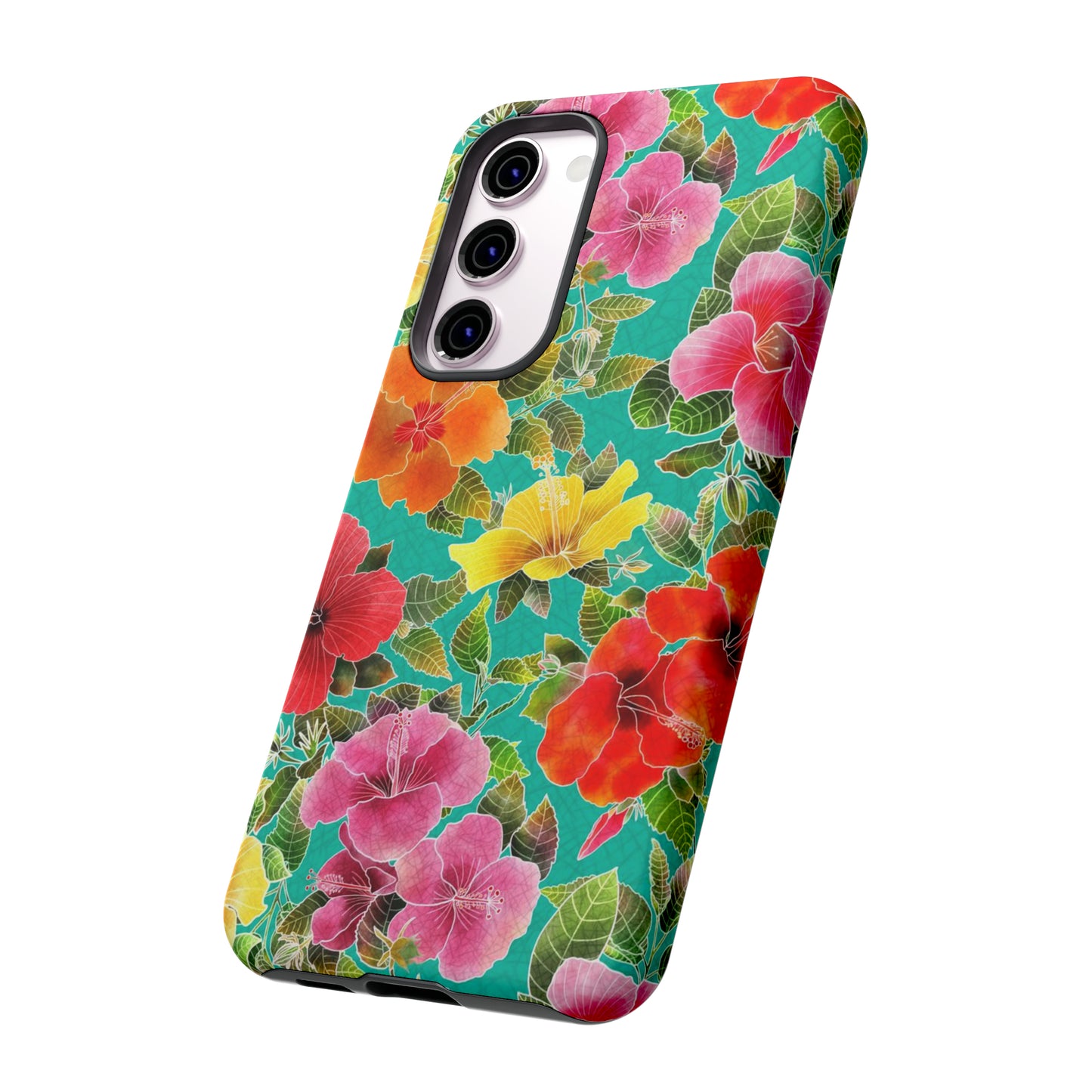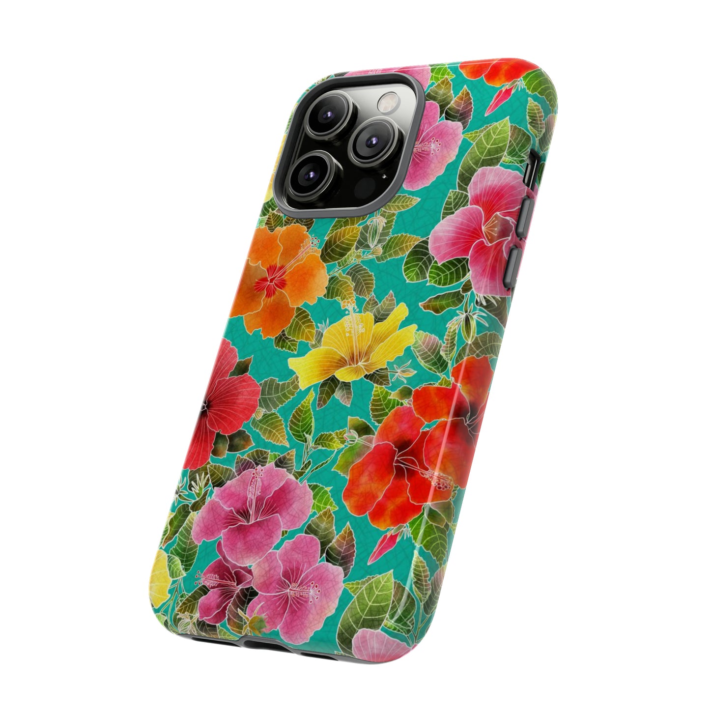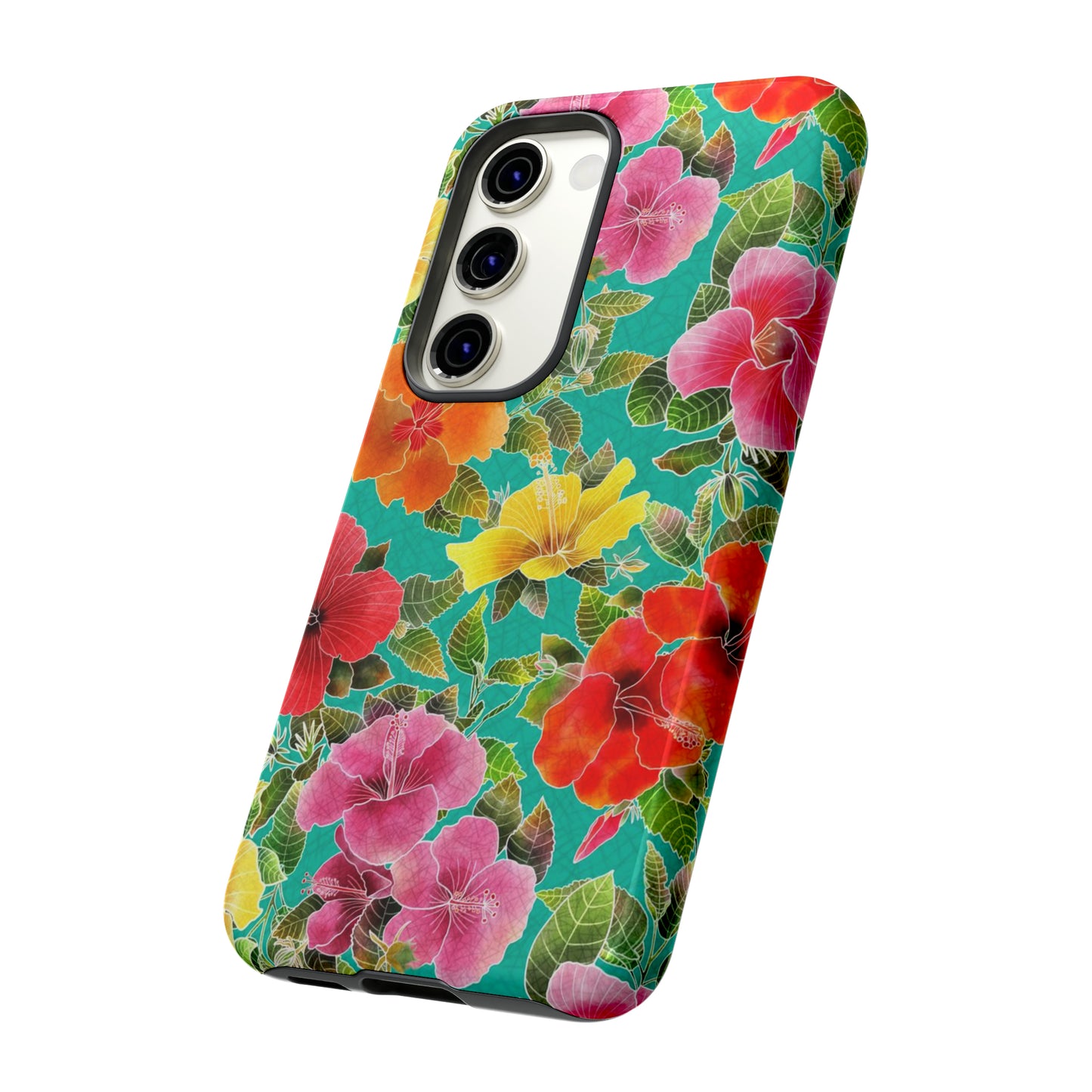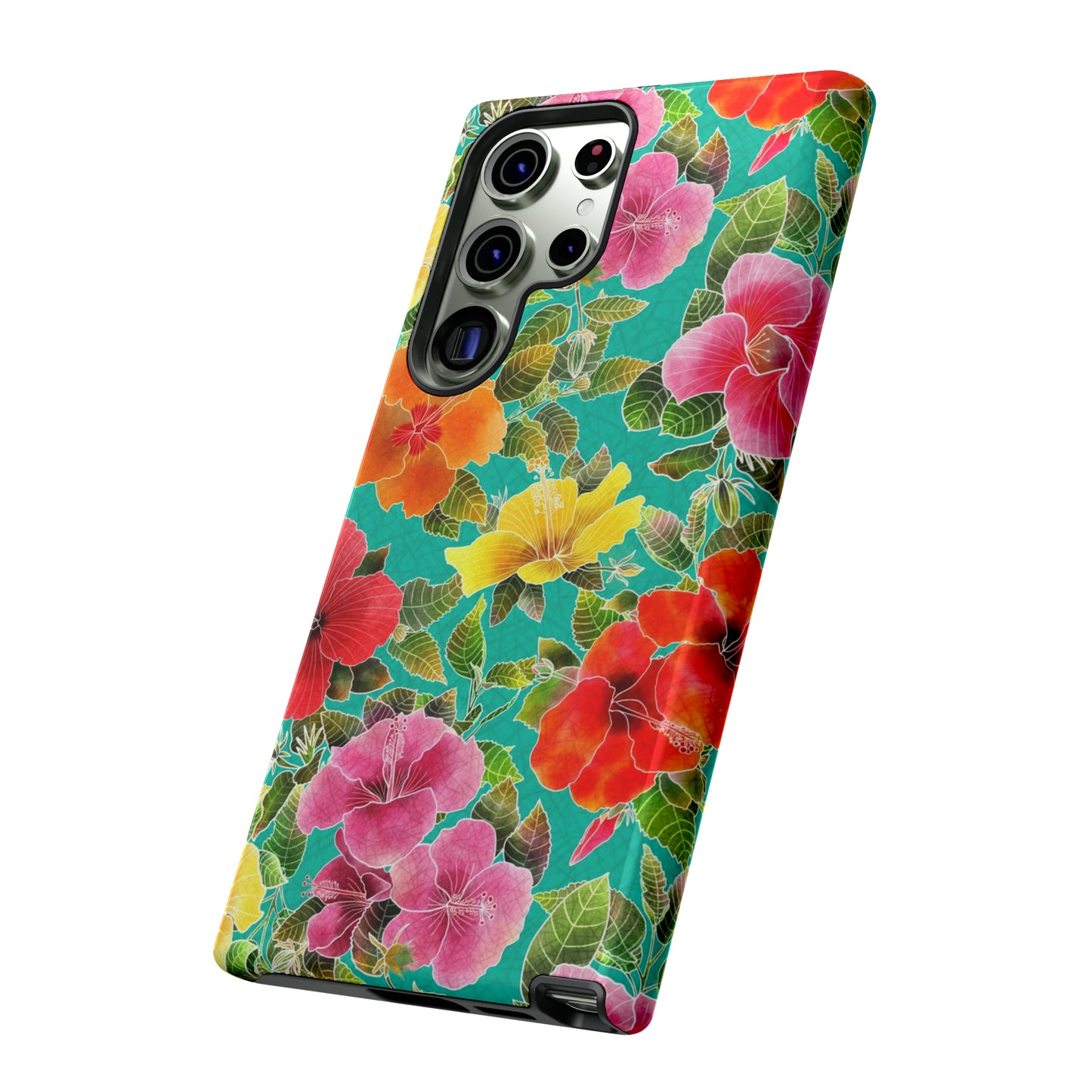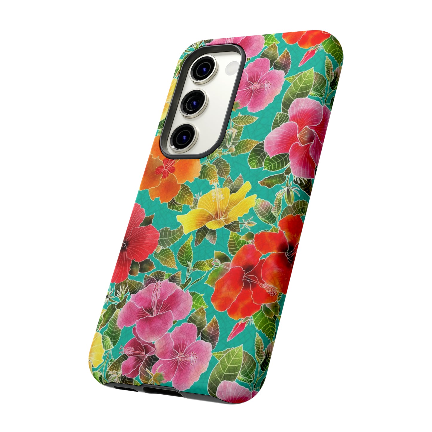 Introducing the Hibiscus Garden tough phone case, designed to keep your phone safe and stylish! This phone case features a beautiful batik-style design with red, yellow, orange, and pink hibiscus flowers painted on a turquoise background. The tough exterior is designed to withstand drops and impact, keeping your phone safe from scratches and cracks.