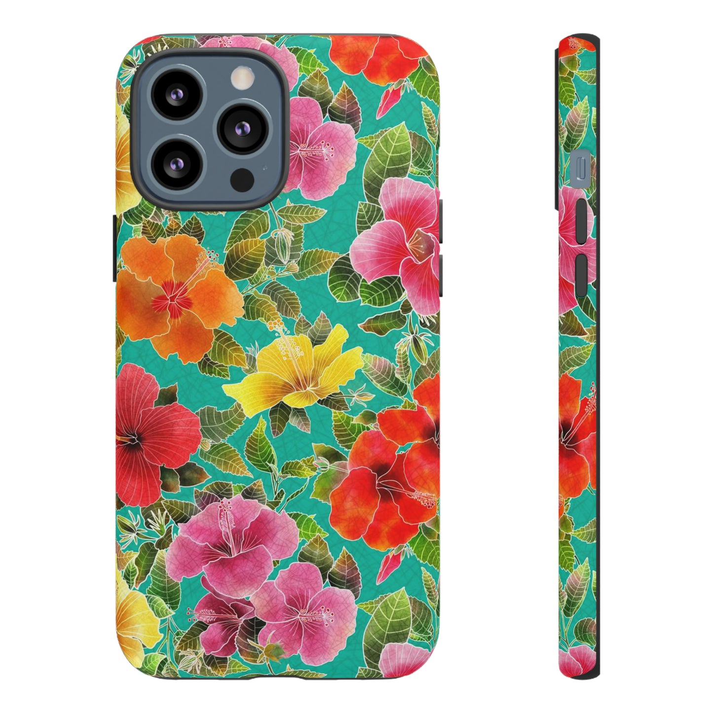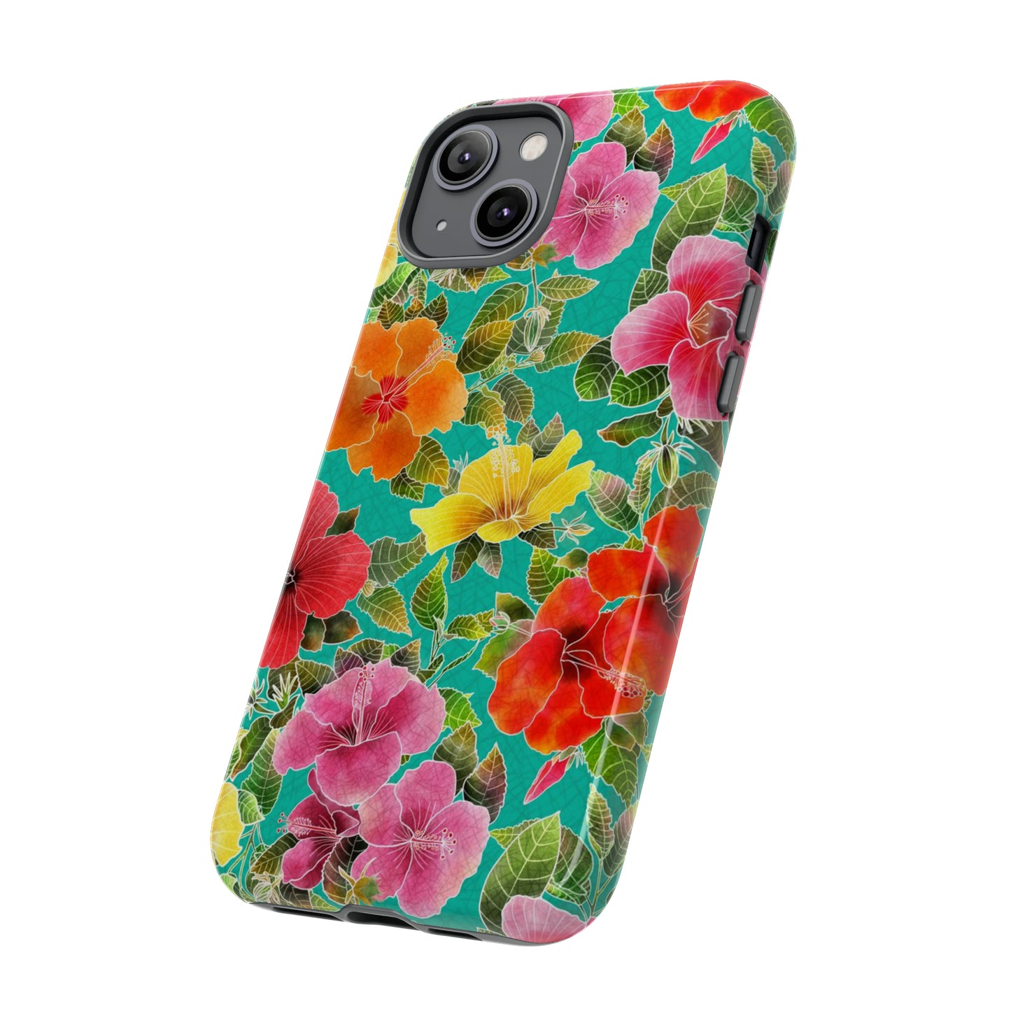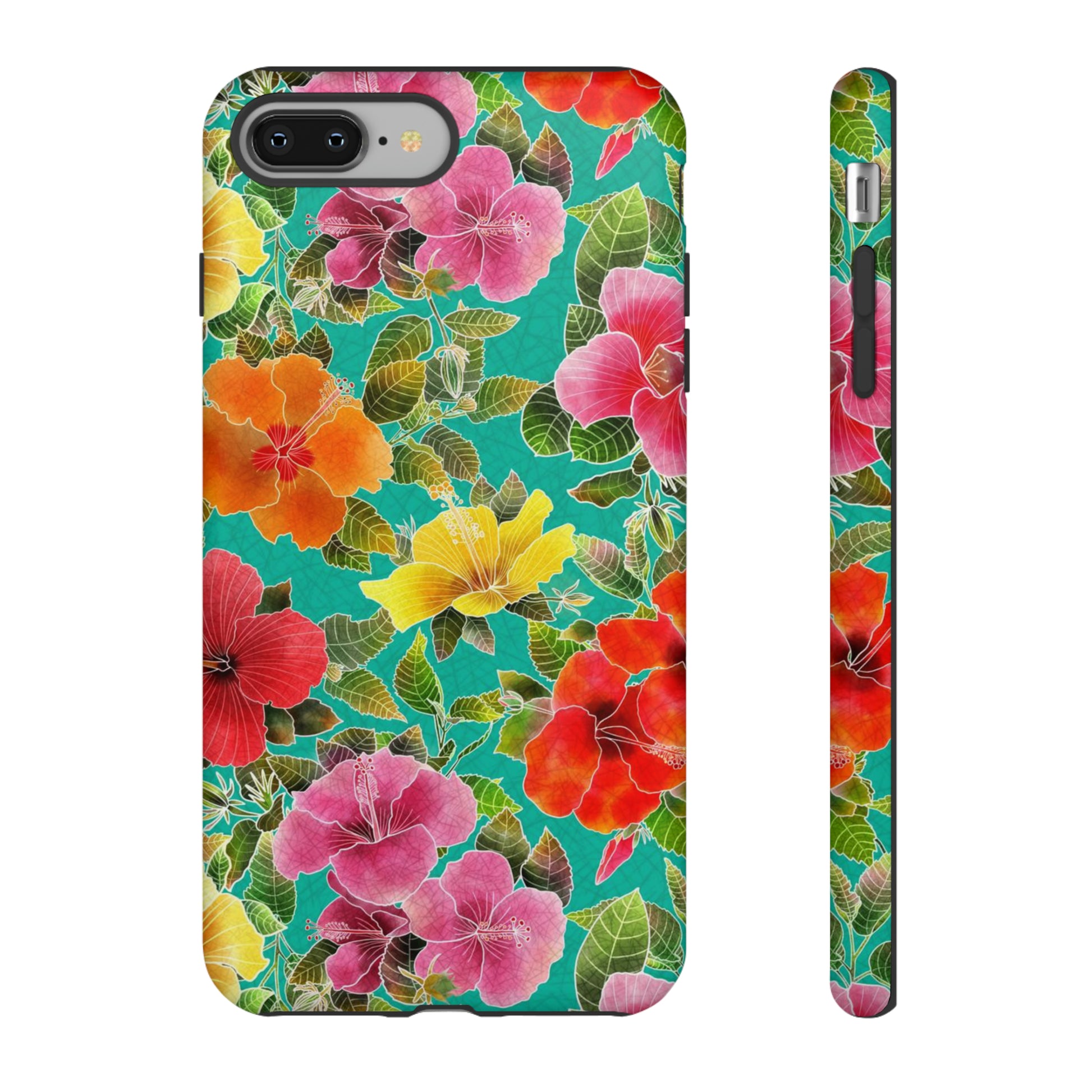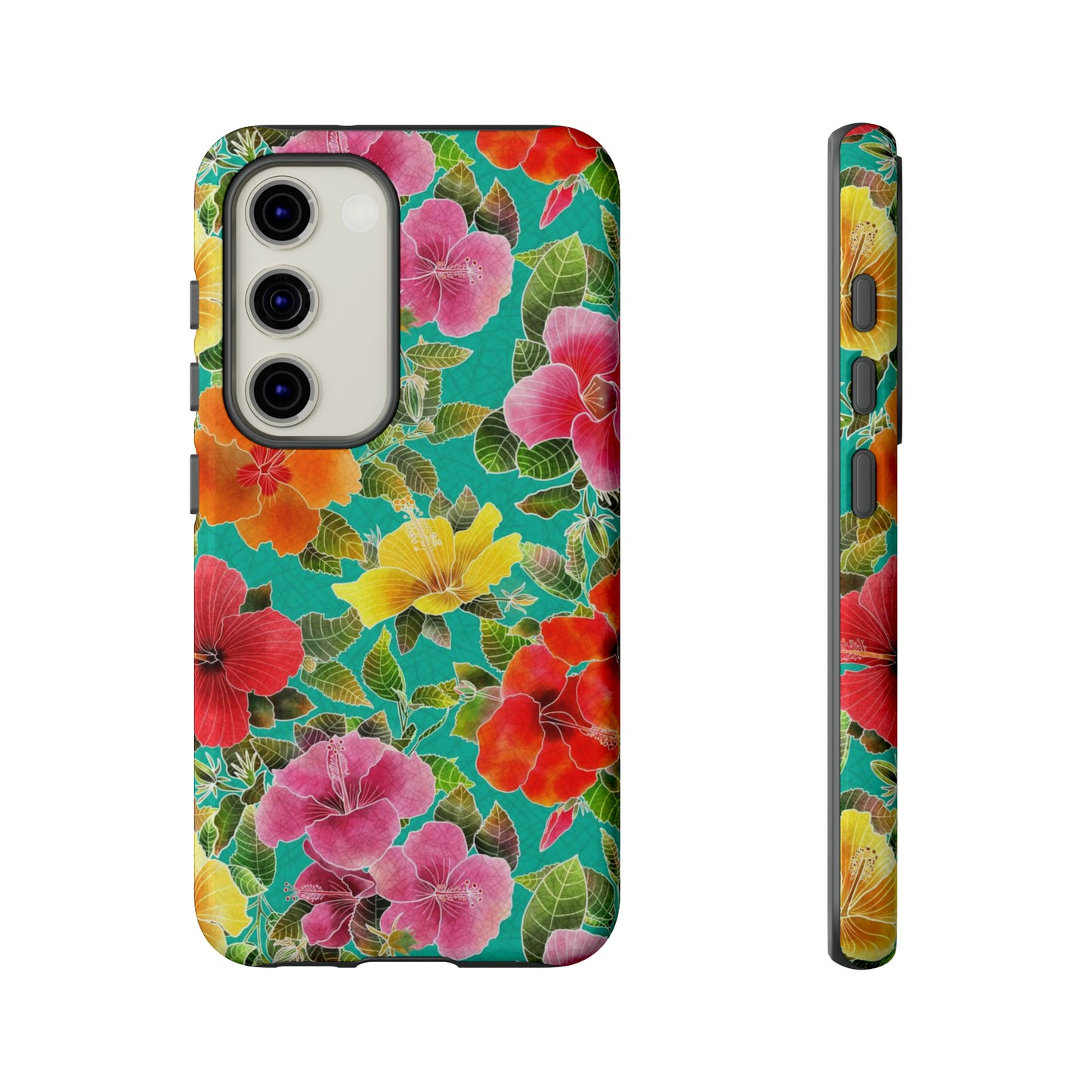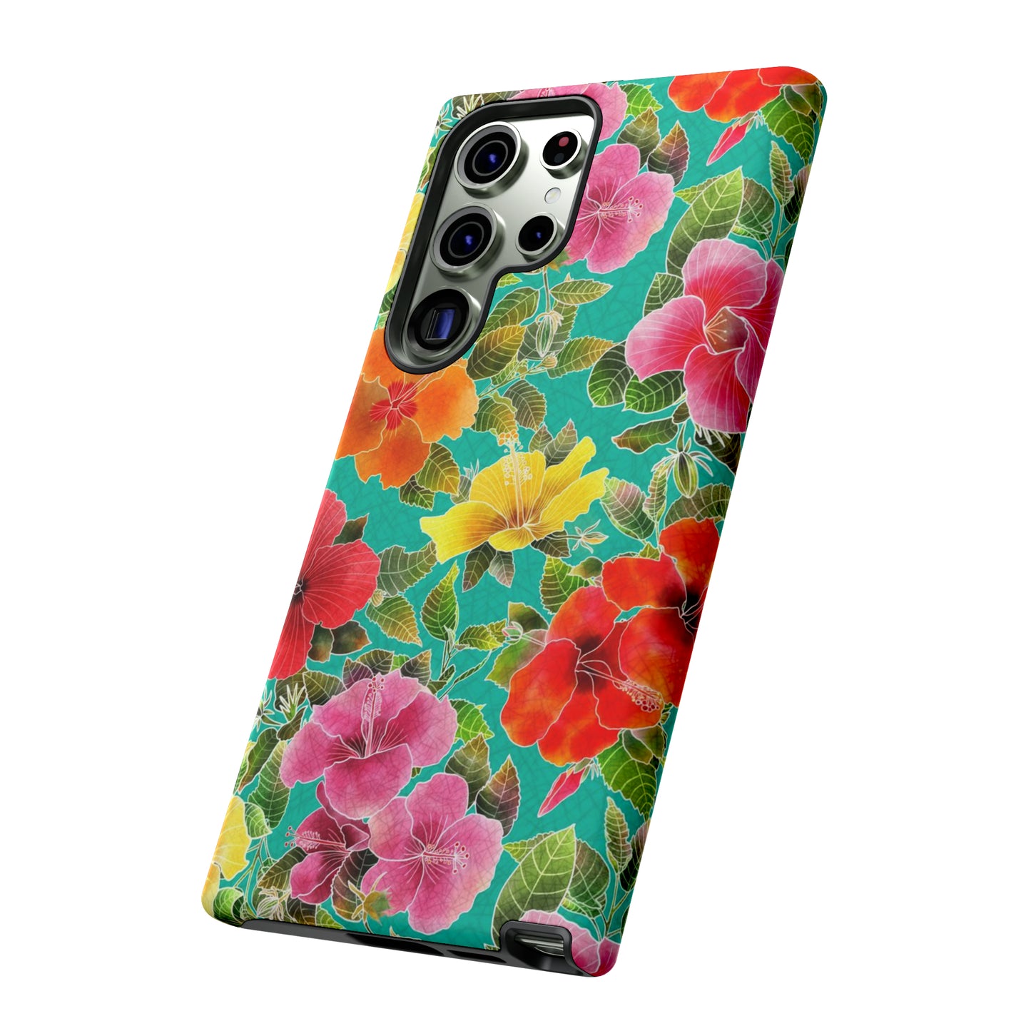 Introducing the Hibiscus Garden tough phone case, designed to keep your phone safe and stylish! This phone case features a beautiful batik-style design with red, yellow, orange, and pink hibiscus flowers painted on a turquoise background. The tough exterior is designed to withstand drops and impact, keeping your phone safe from scratches and cracks.
