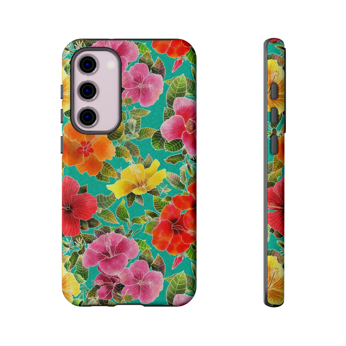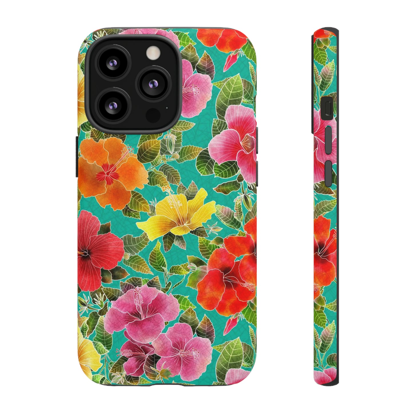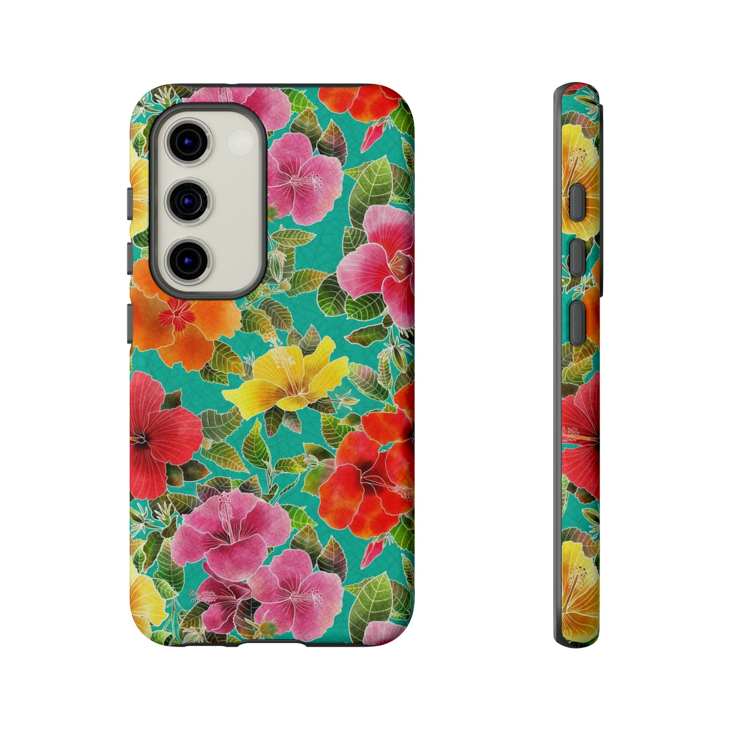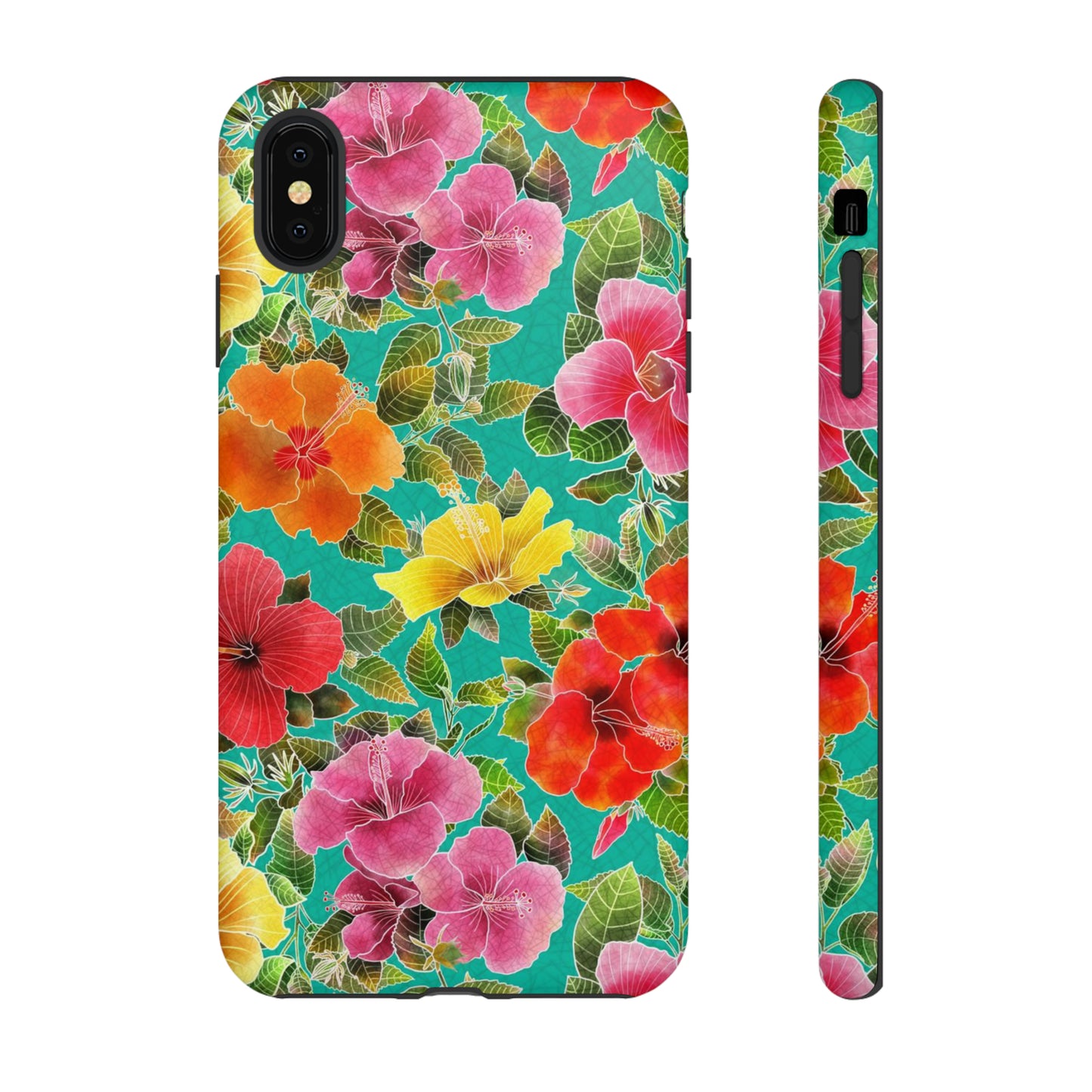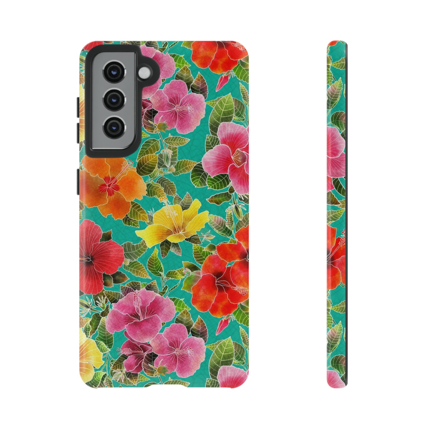 Introducing the Hibiscus Garden tough phone case, designed to keep your phone safe and stylish! This phone case features a beautiful batik-style design with red, yellow, orange, and pink hibiscus flowers painted on a turquoise background. The tough exterior is designed to withstand drops and impact, keeping your phone safe from scratches and cracks.