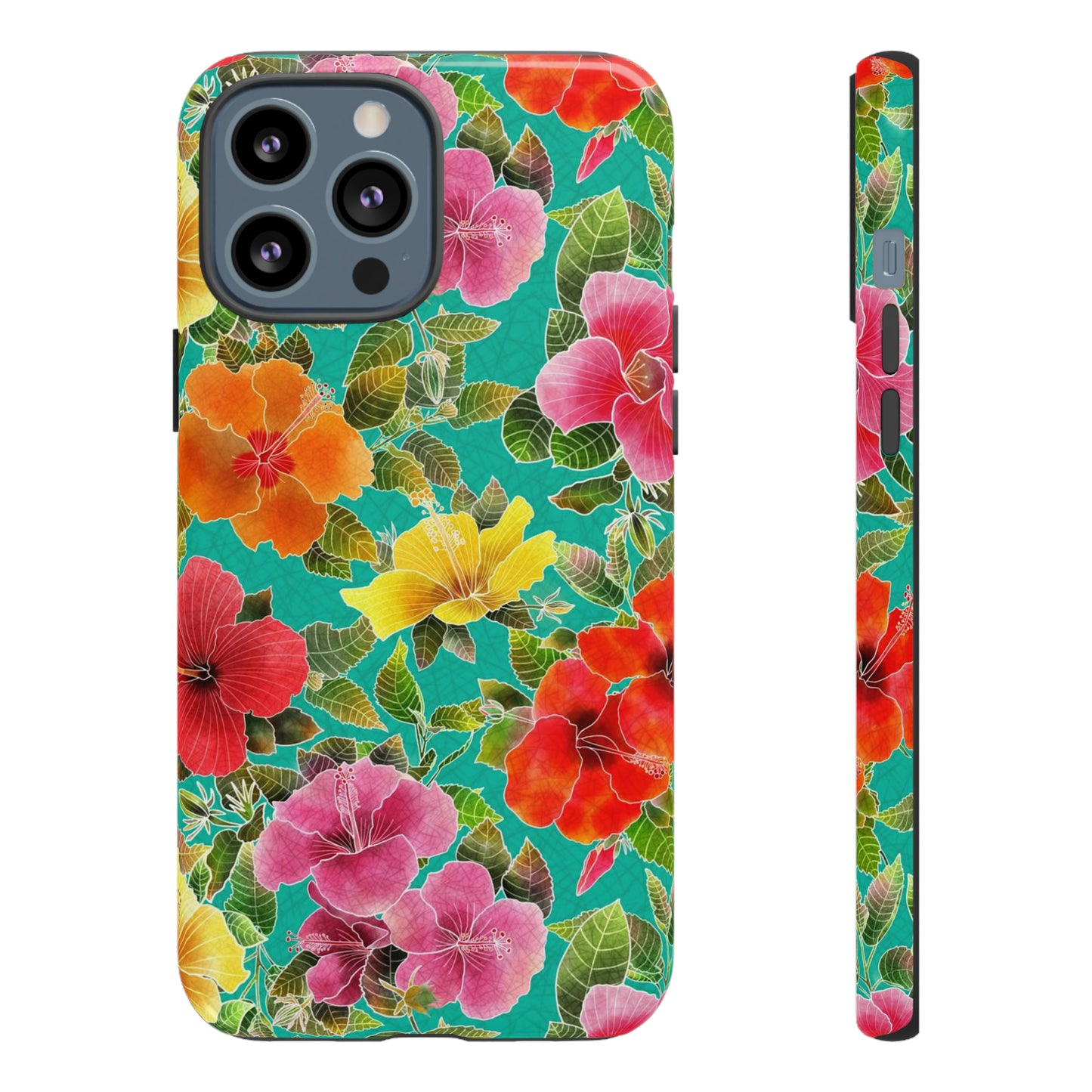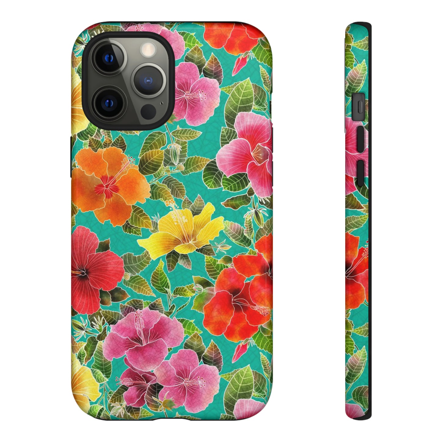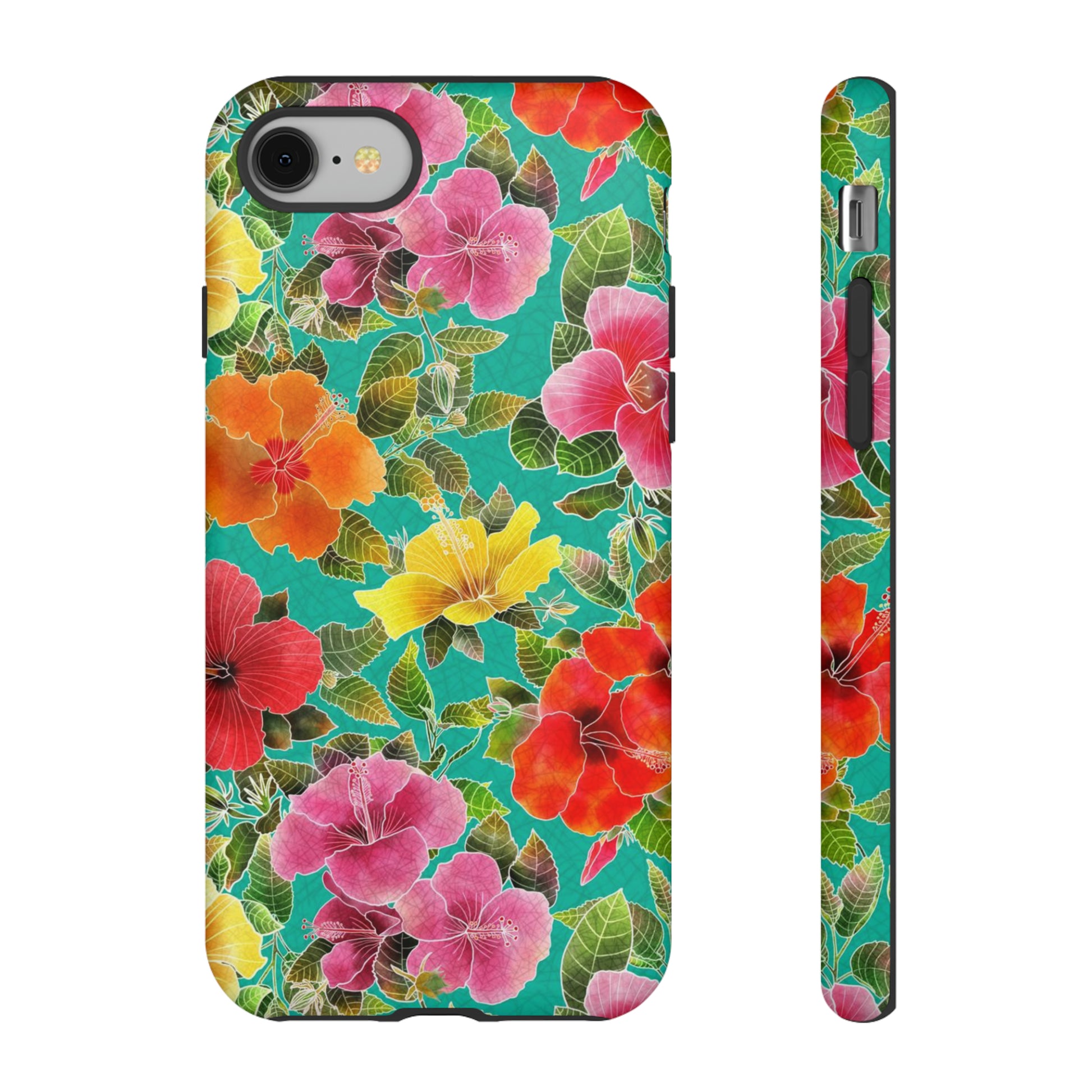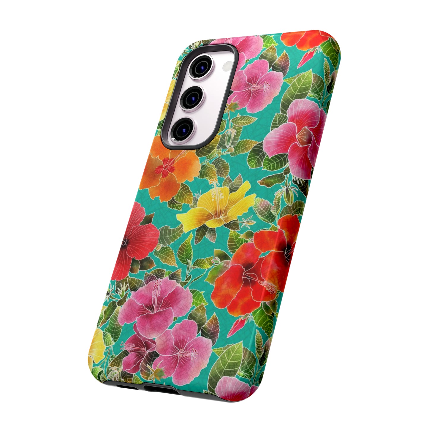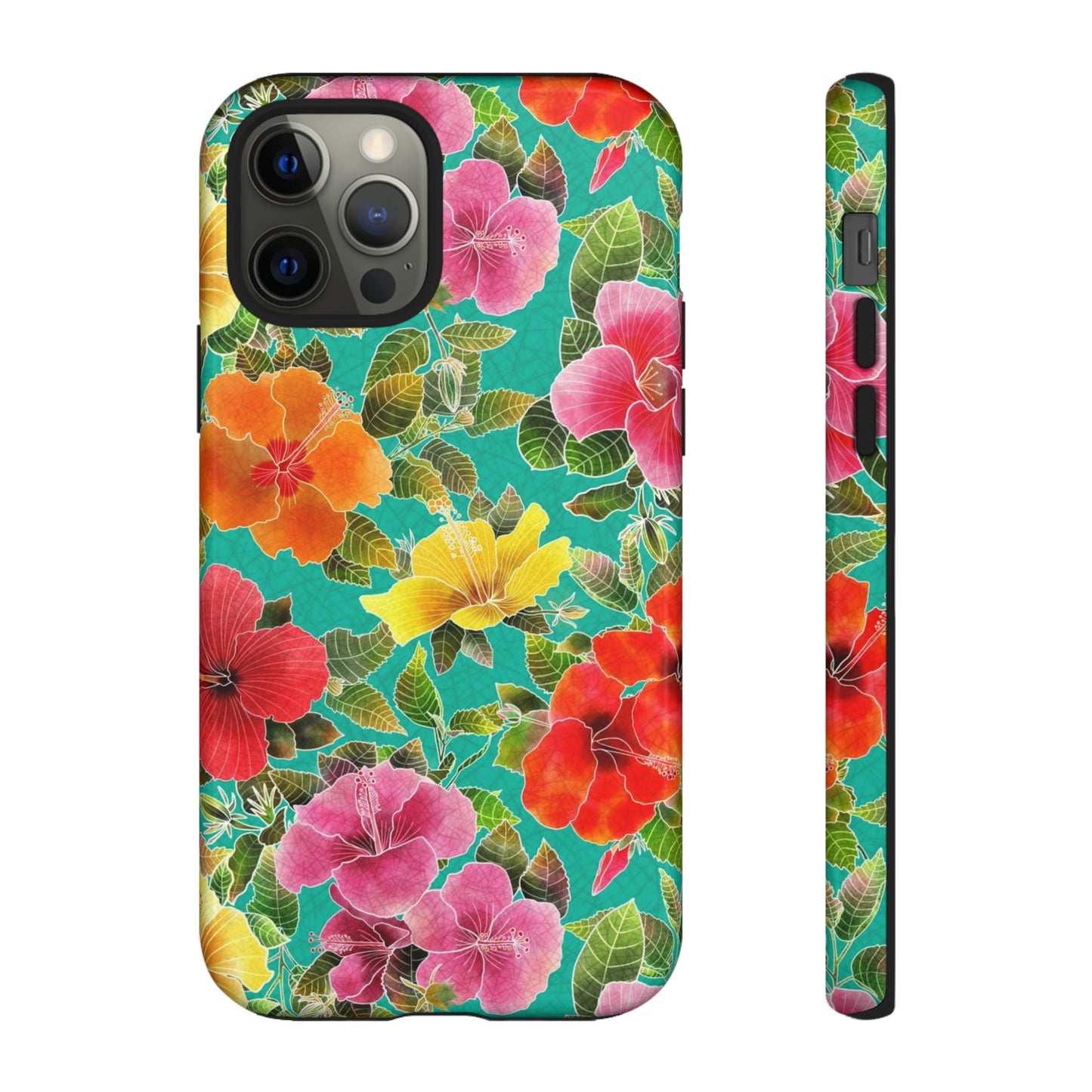 Introducing the Hibiscus Garden tough phone case, designed to keep your phone safe and stylish! This phone case features a beautiful batik-style design with red, yellow, orange, and pink hibiscus flowers painted on a turquoise background. The tough exterior is designed to withstand drops and impact, keeping your phone safe from scratches and cracks.