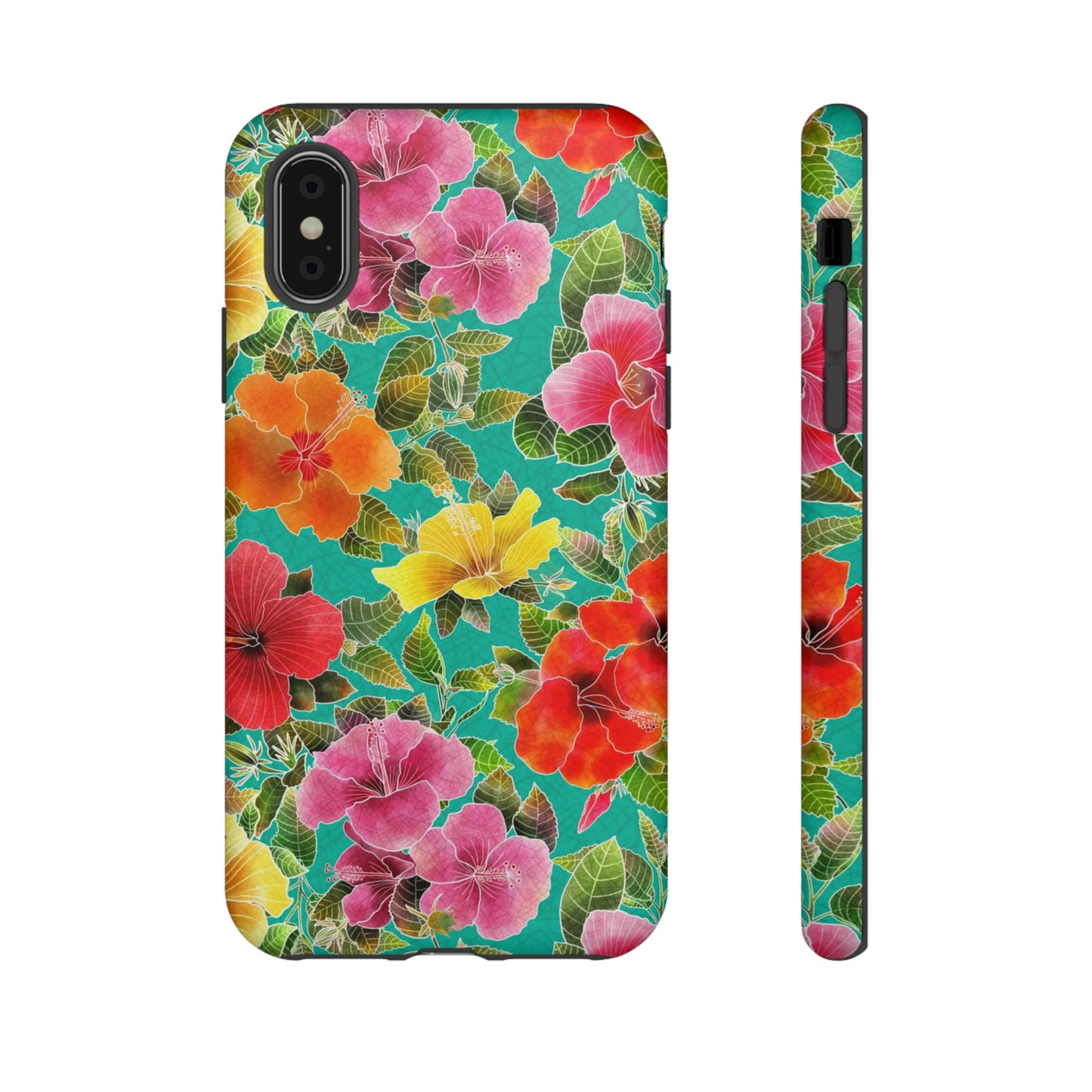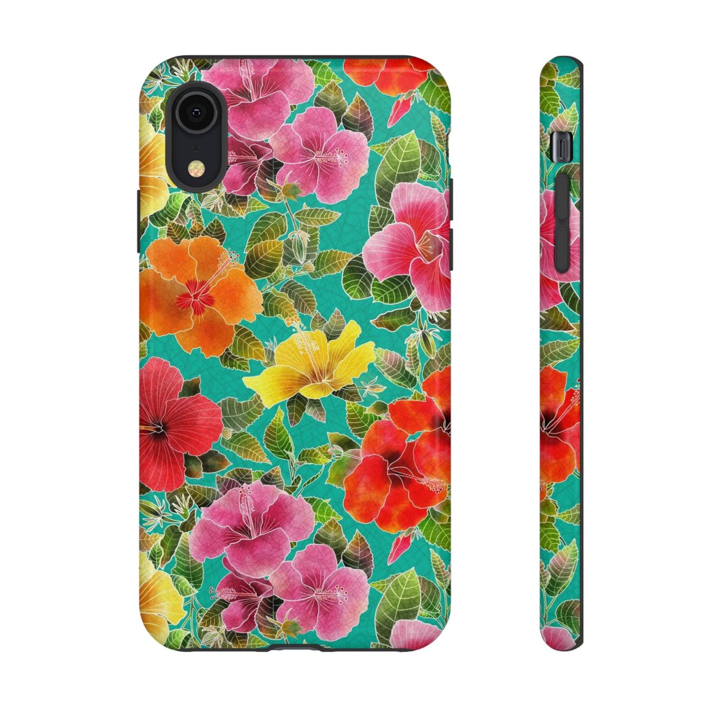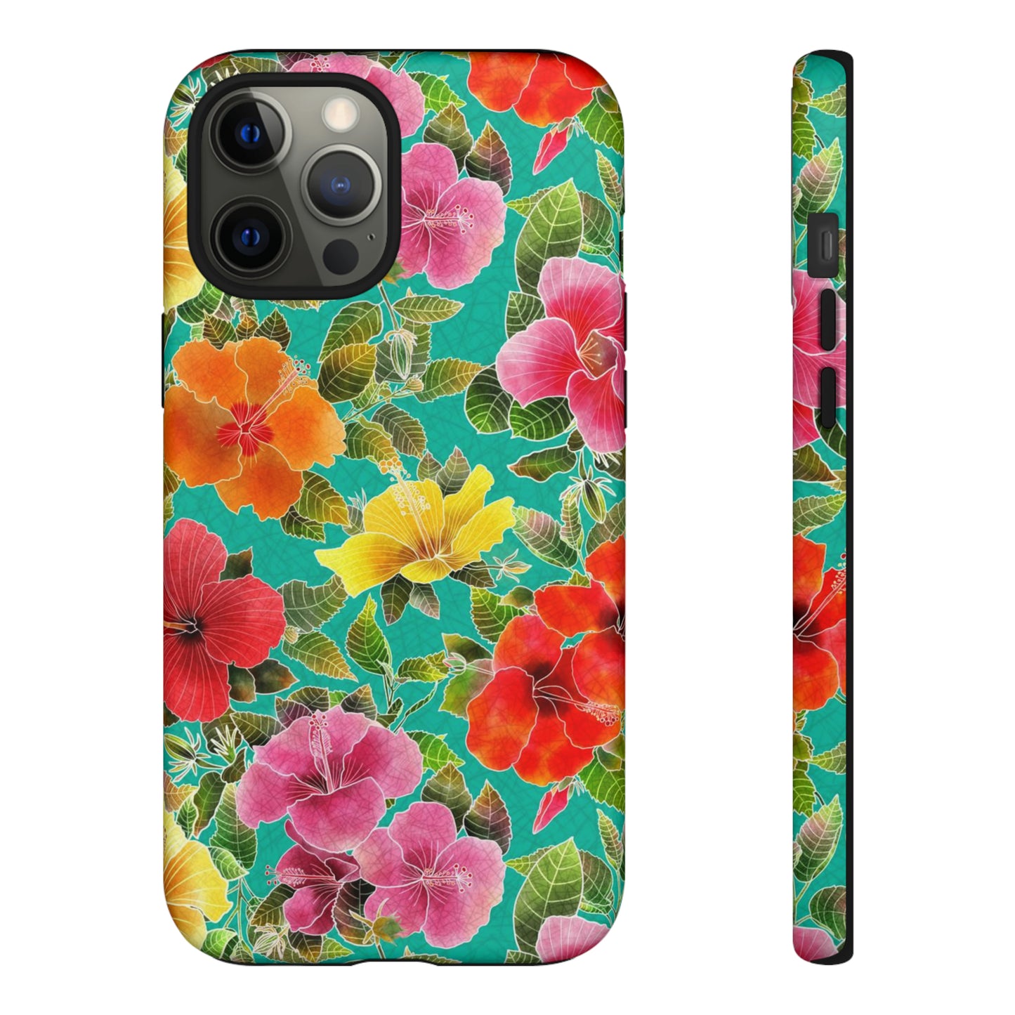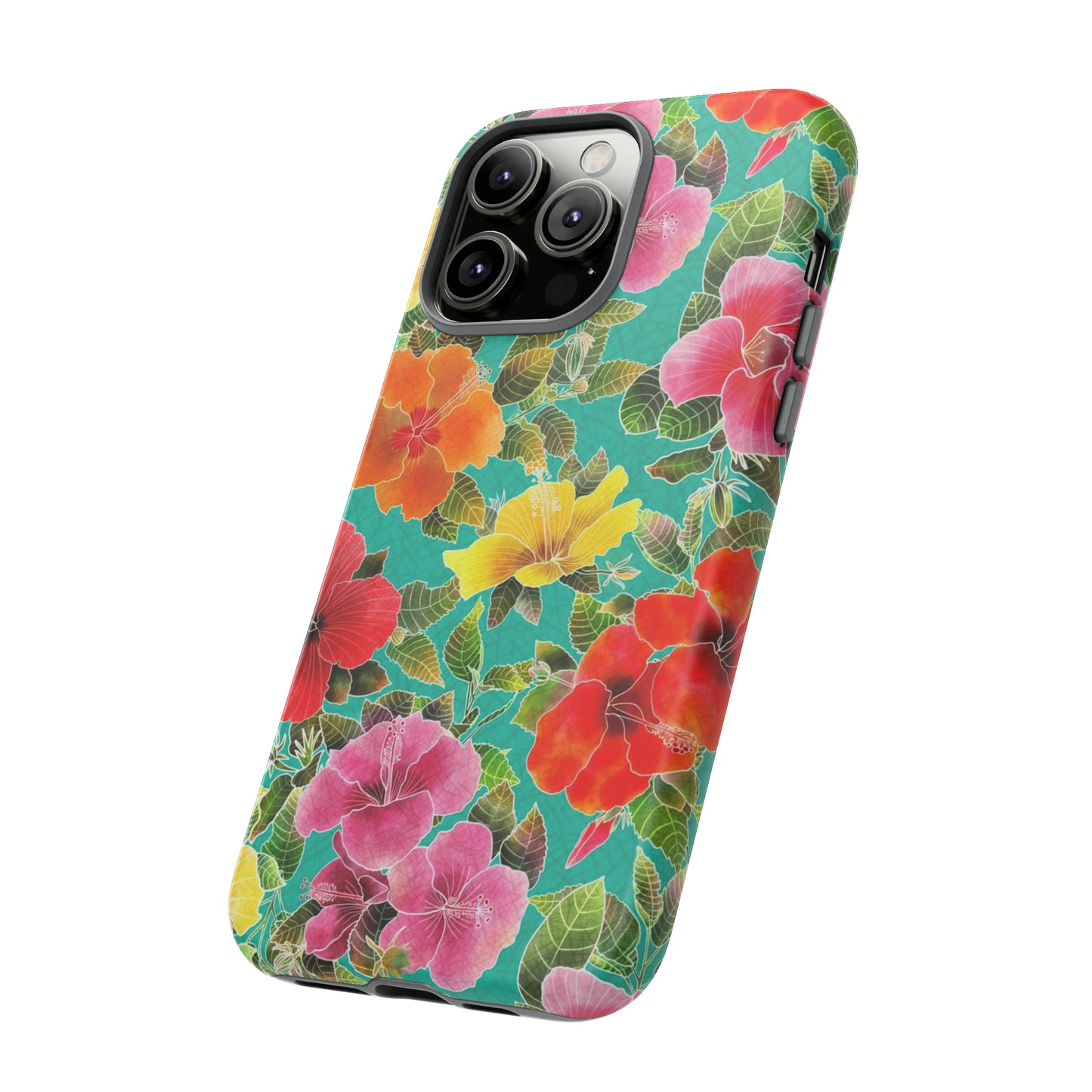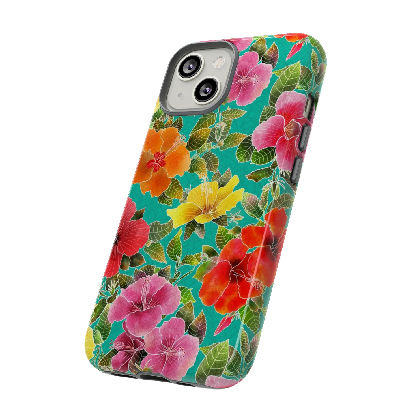 Introducing the Hibiscus Garden tough phone case, designed to keep your phone safe and stylish! This phone case features a beautiful batik-style design with red, yellow, orange, and pink hibiscus flowers painted on a turquoise background. The tough exterior is designed to withstand drops and impact, keeping your phone safe from scratches and cracks.
