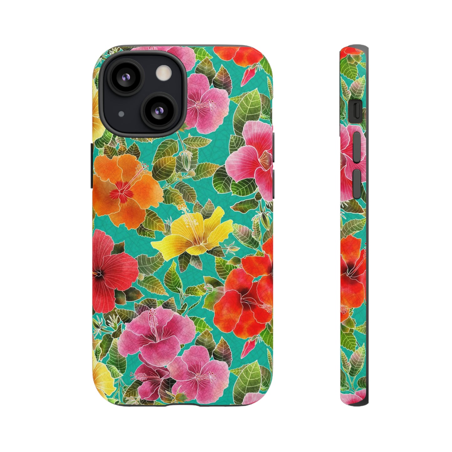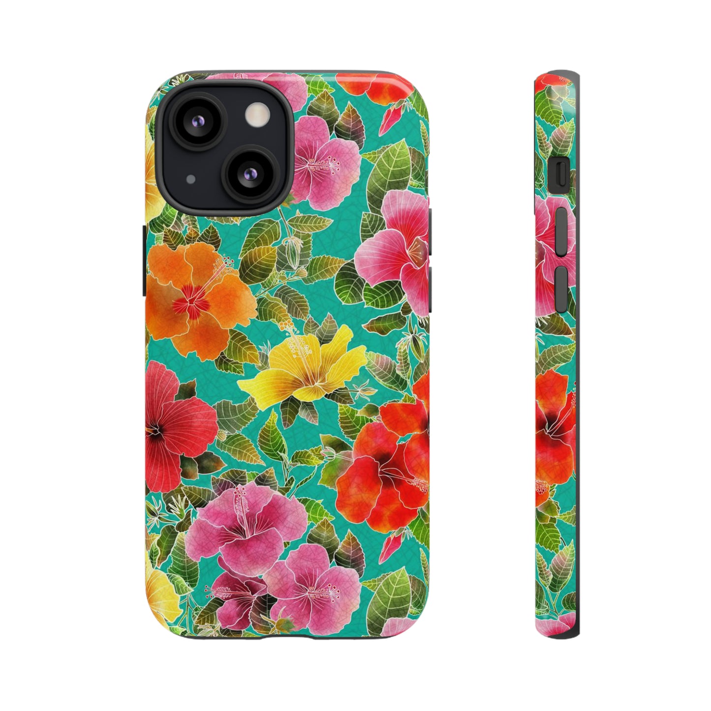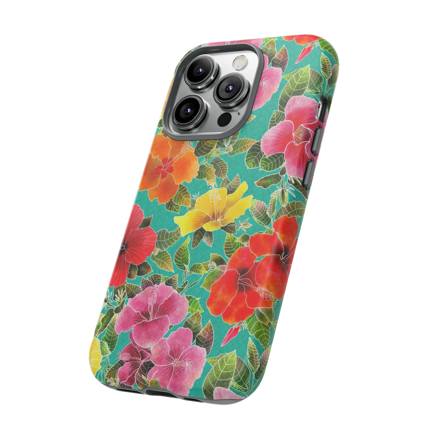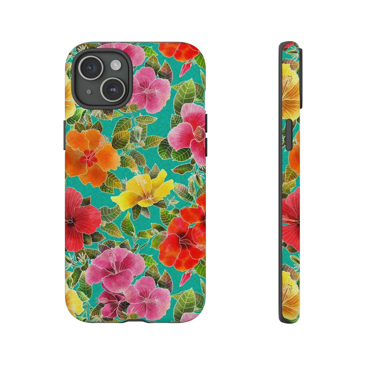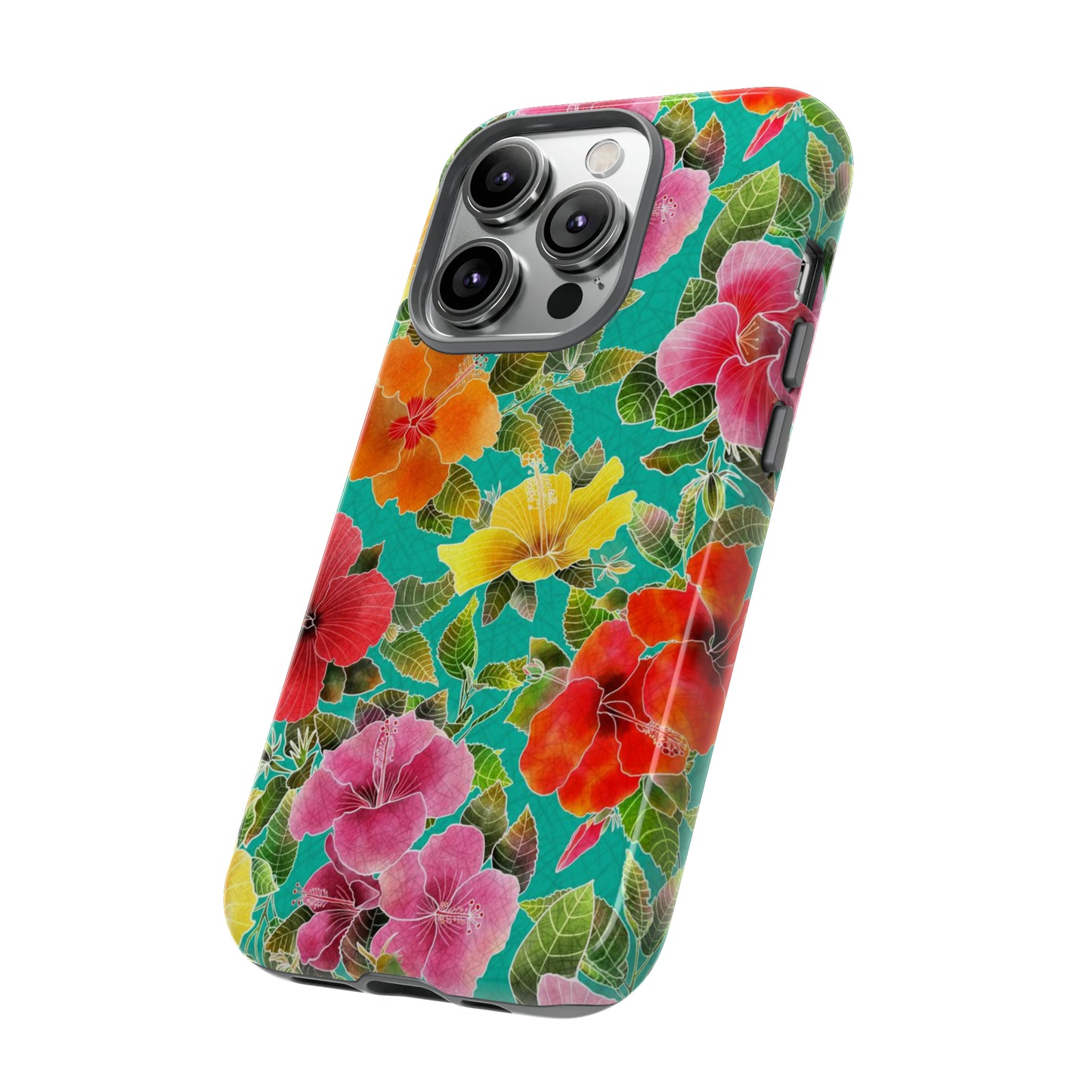 Introducing the Hibiscus Garden tough phone case, designed to keep your phone safe and stylish! This phone case features a beautiful batik-style design with red, yellow, orange, and pink hibiscus flowers painted on a turquoise background. The tough exterior is designed to withstand drops and impact, keeping your phone safe from scratches and cracks.