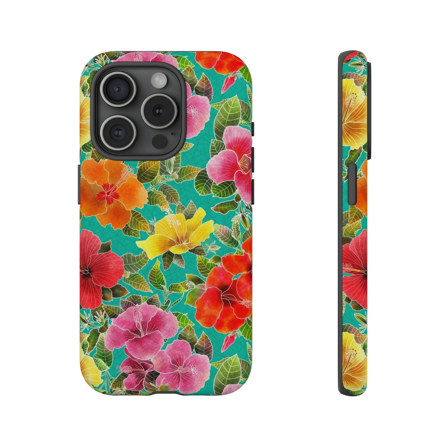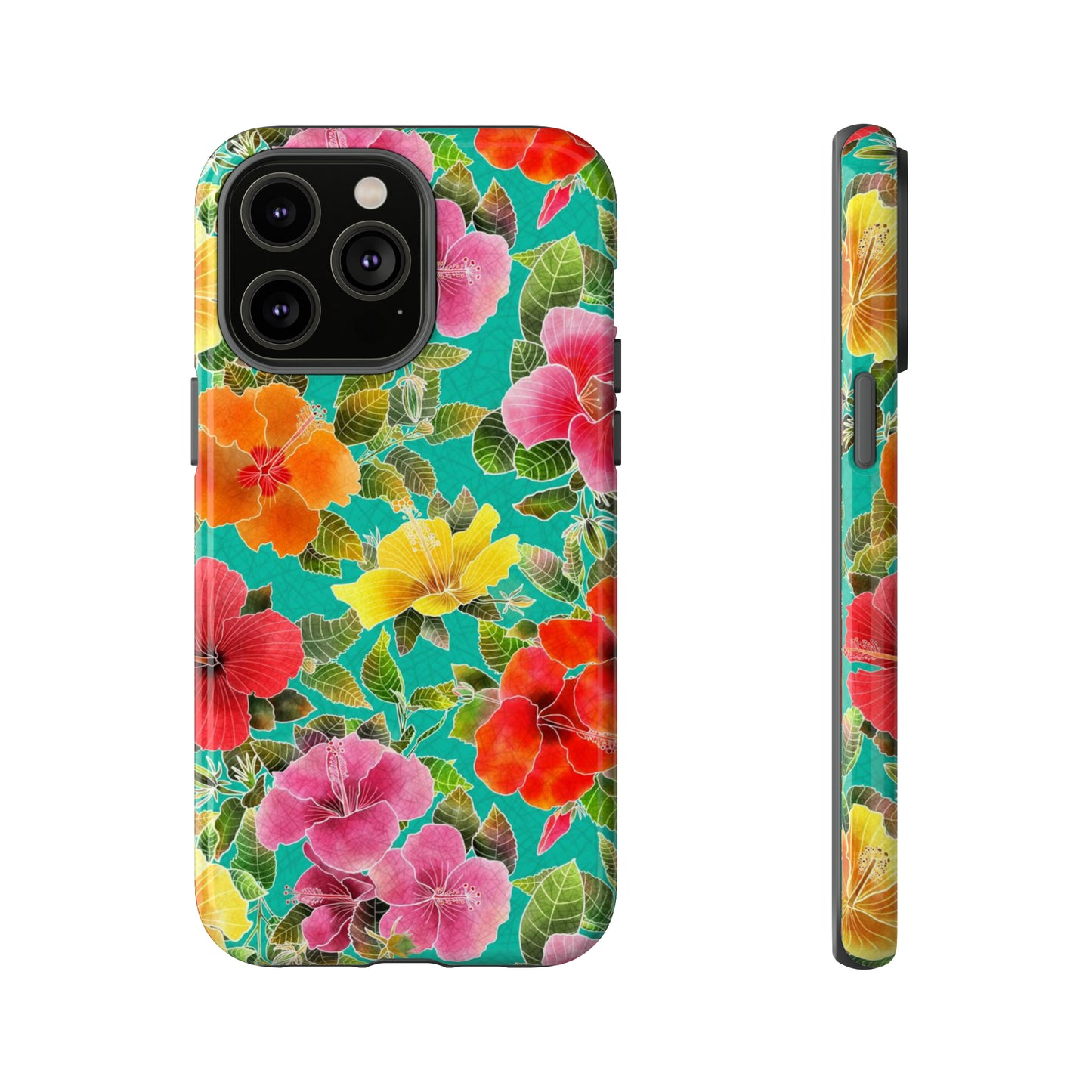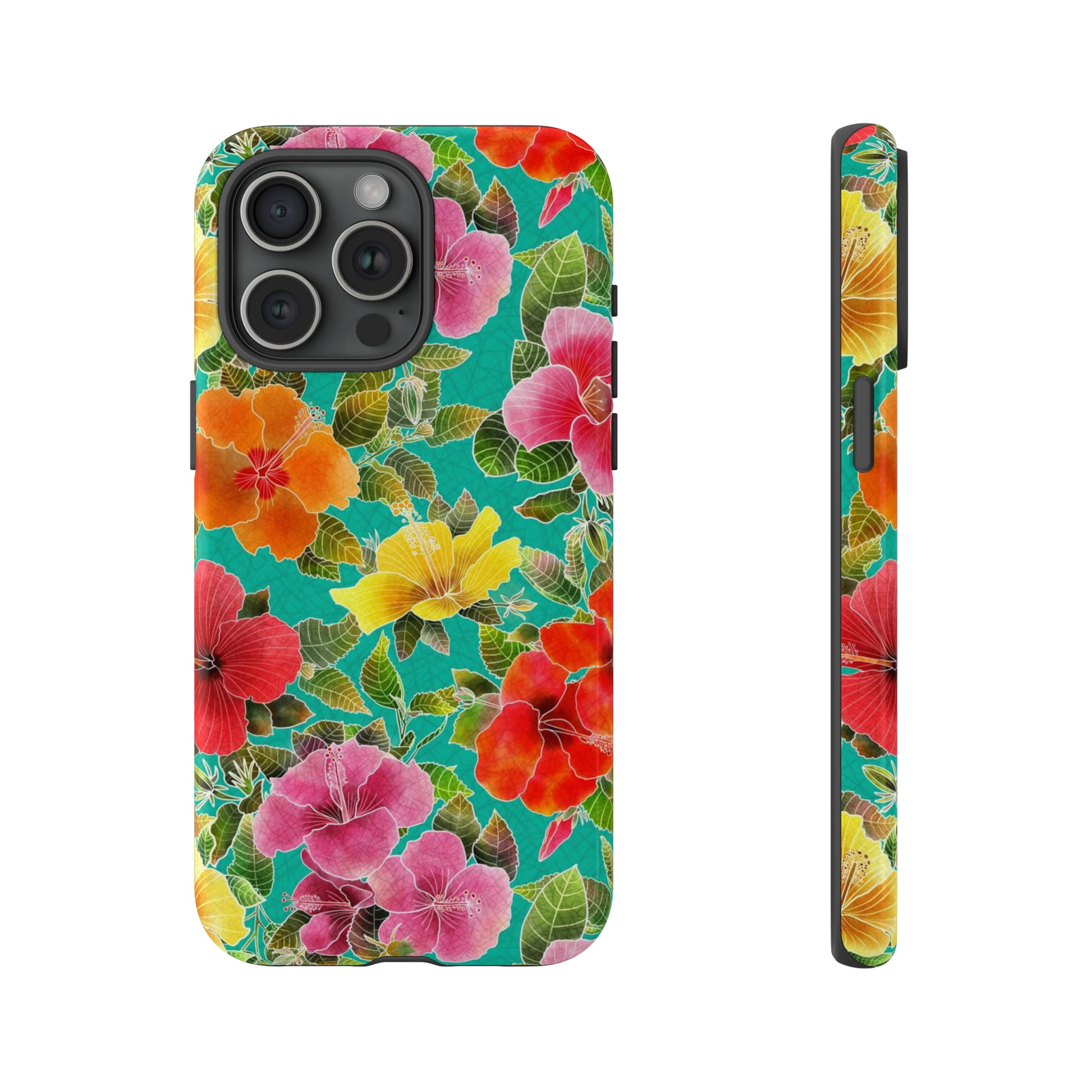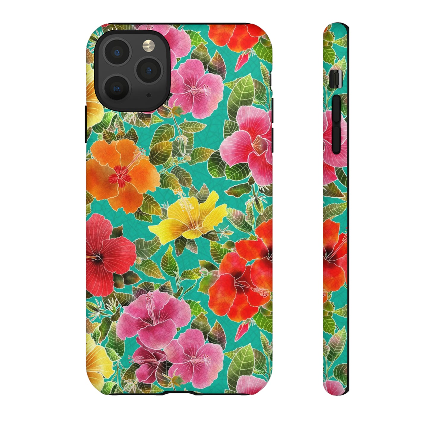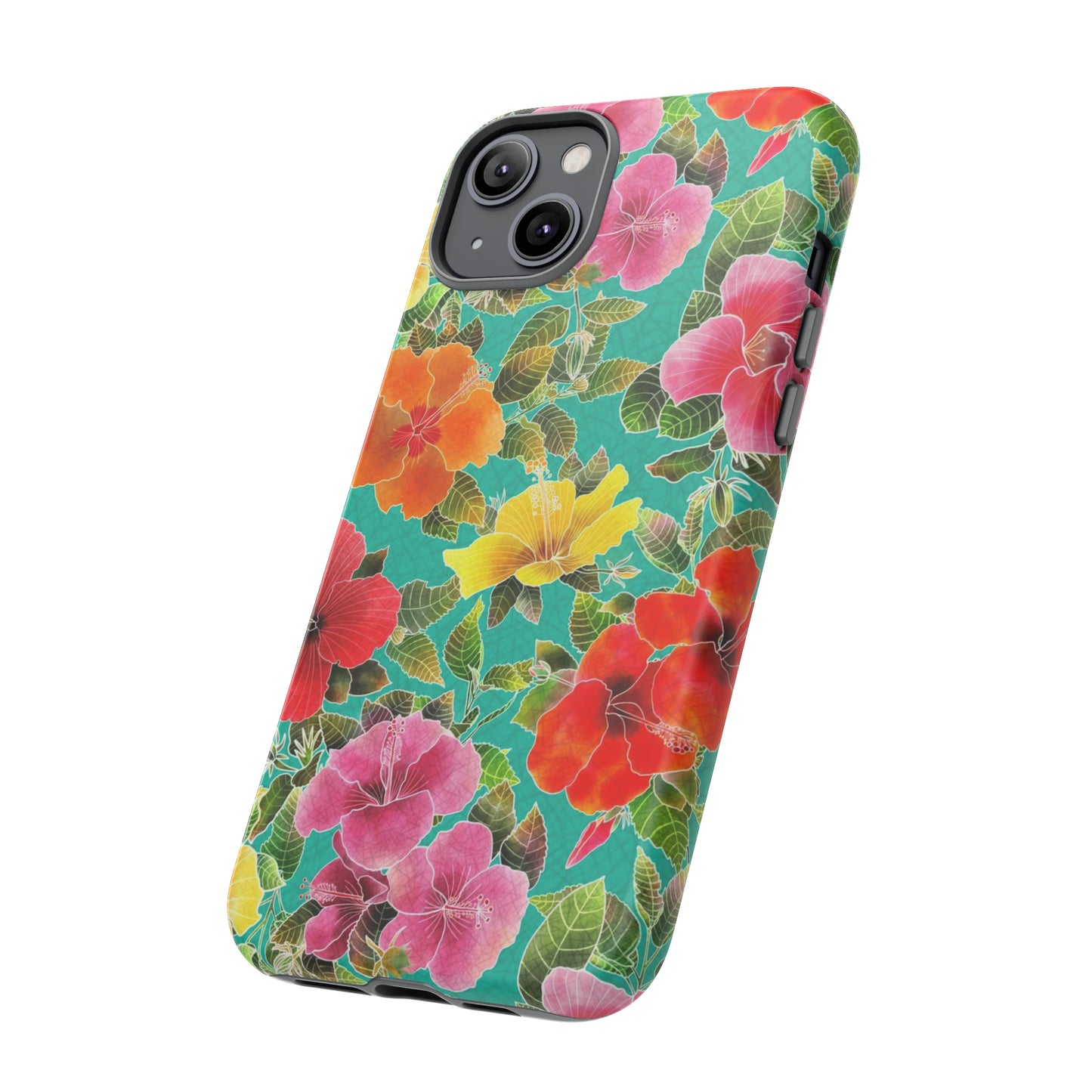 Introducing the Hibiscus Garden tough phone case, designed to keep your phone safe and stylish! This phone case features a beautiful batik-style design with red, yellow, orange, and pink hibiscus flowers painted on a turquoise background. The tough exterior is designed to withstand drops and impact, keeping your phone safe from scratches and cracks.