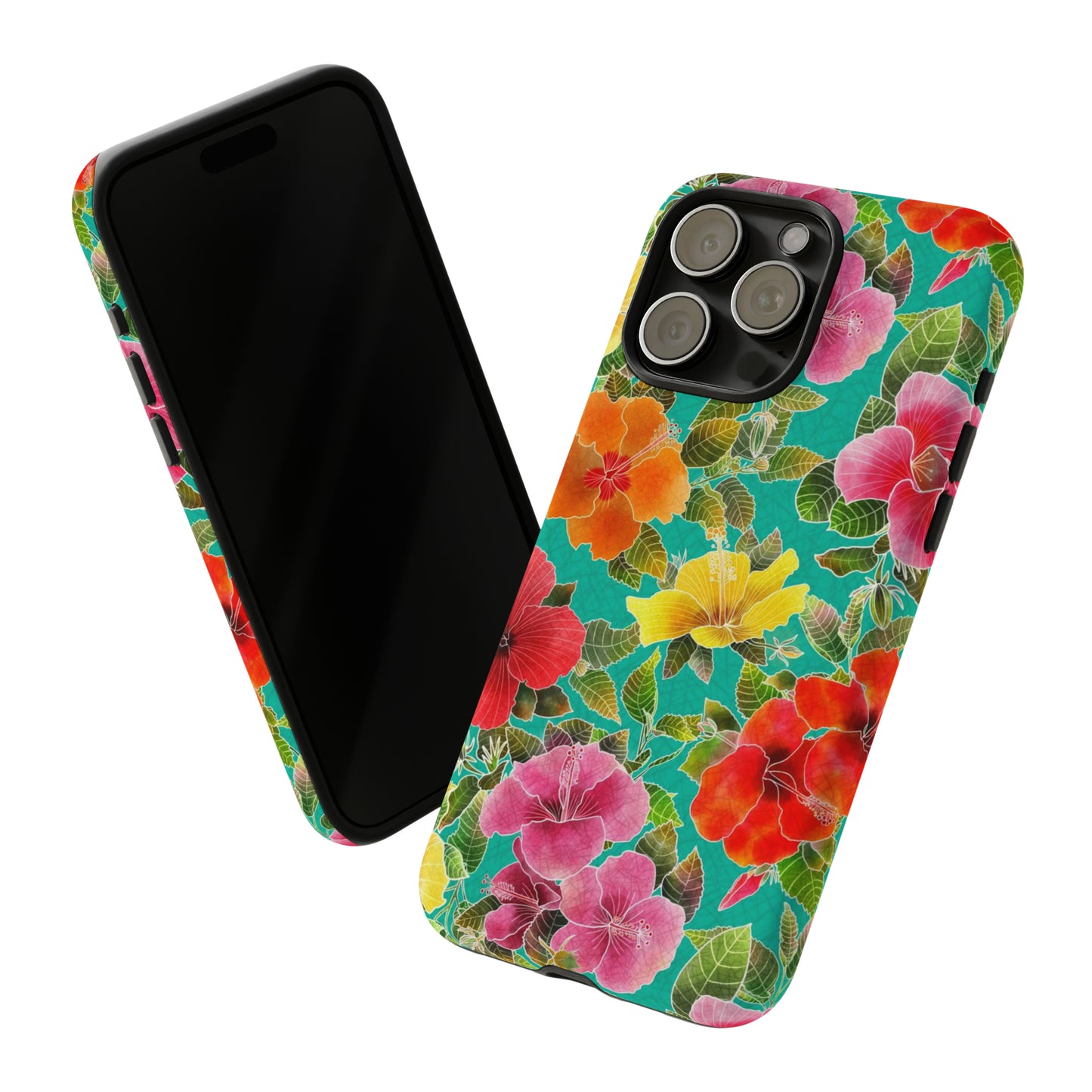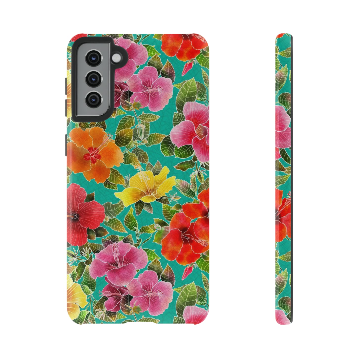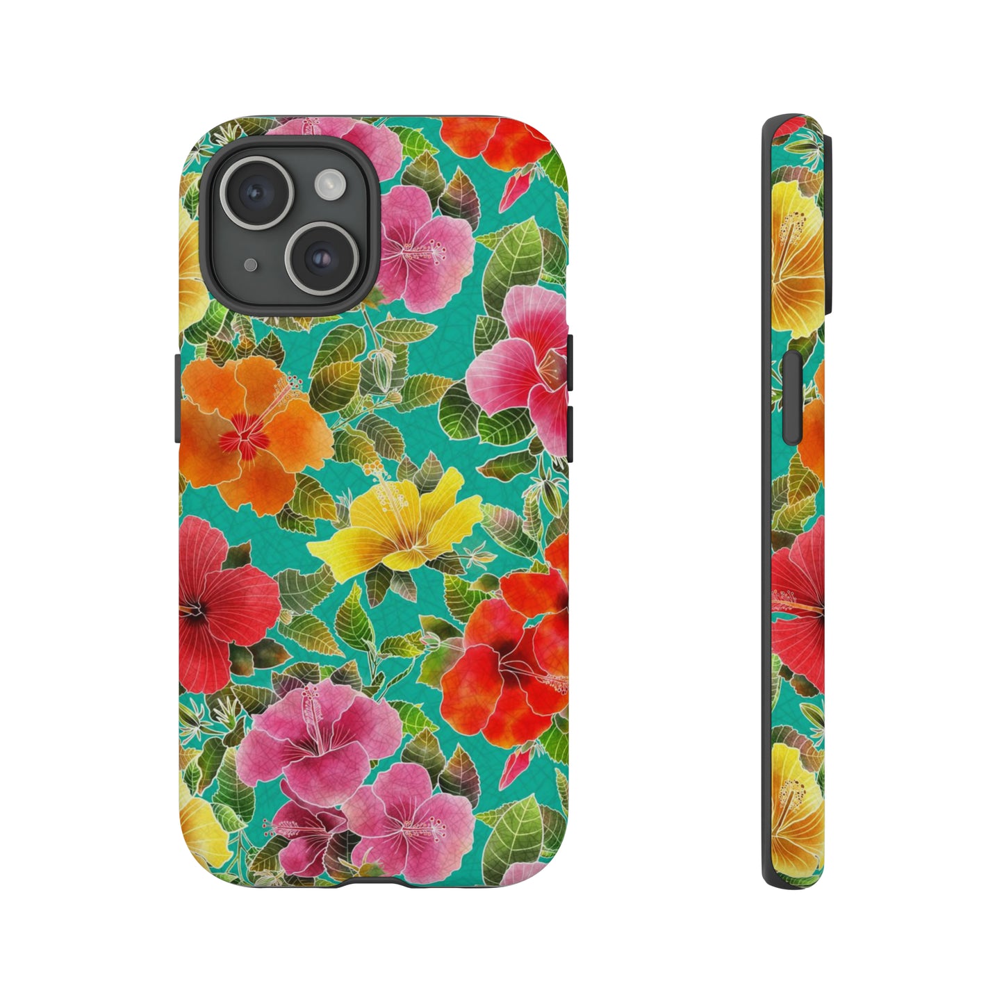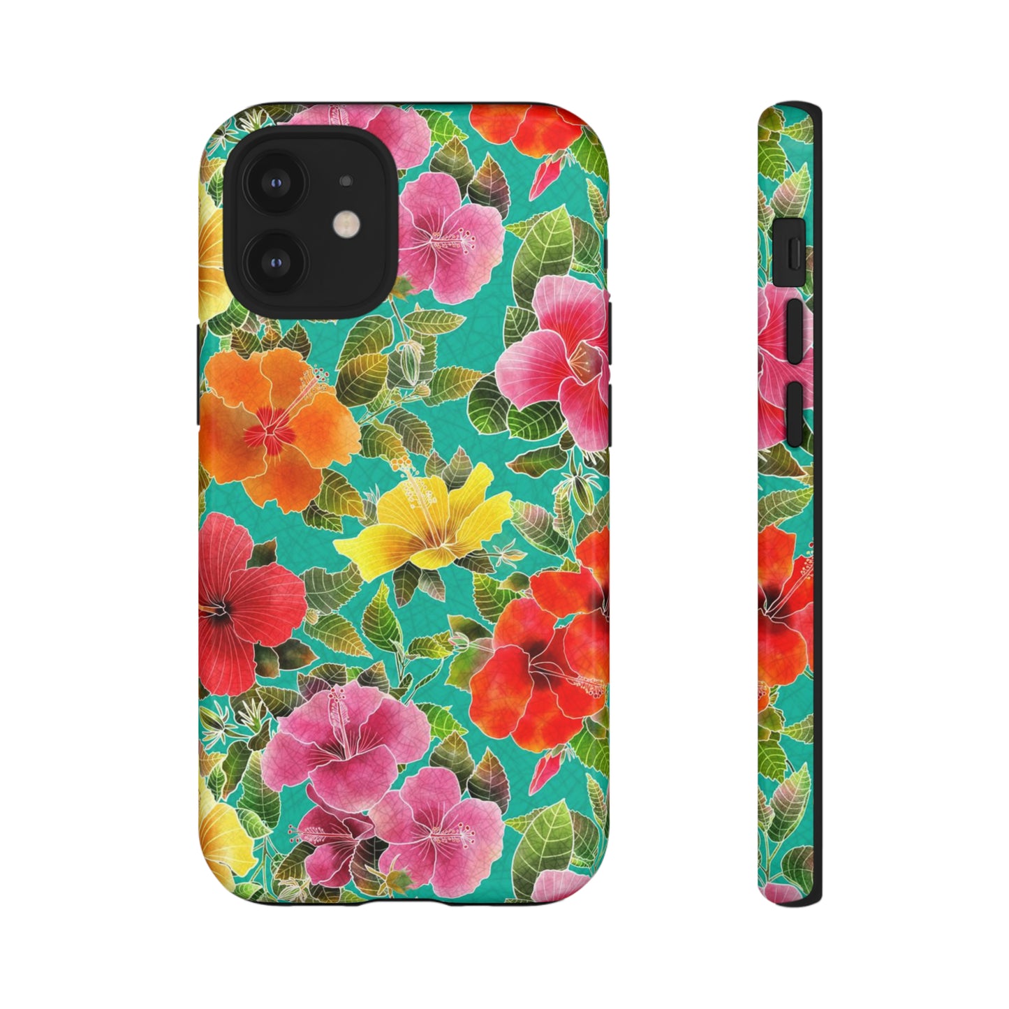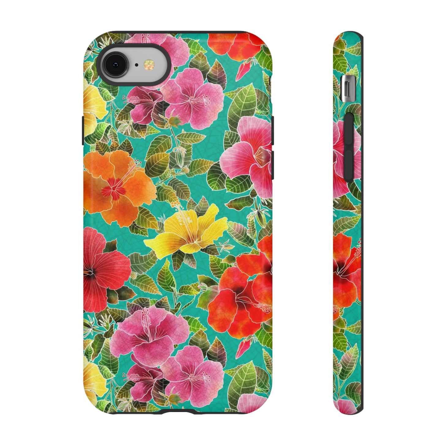 Introducing the Hibiscus Garden tough phone case, designed to keep your phone safe and stylish! This phone case features a beautiful batik-style design with red, yellow, orange, and pink hibiscus flowers painted on a turquoise background. The tough exterior is designed to withstand drops and impact, keeping your phone safe from scratches and cracks.