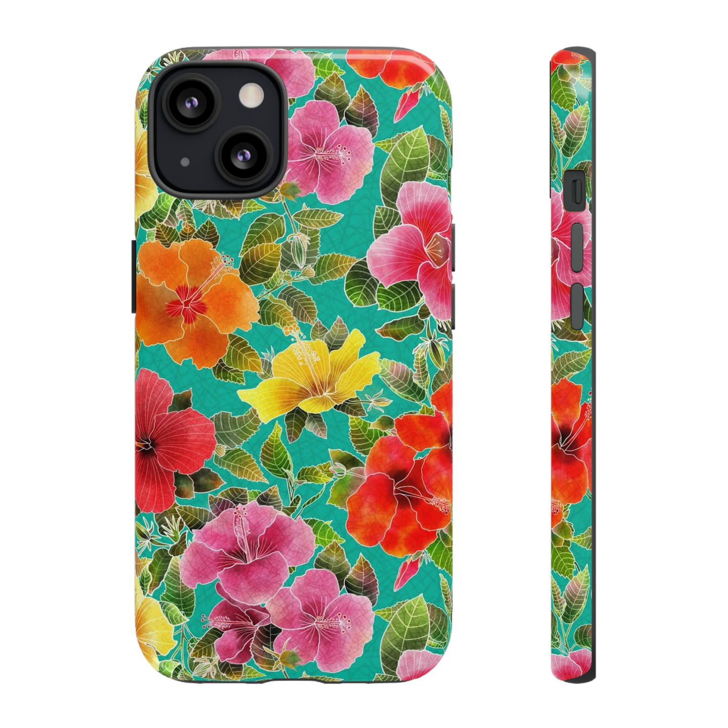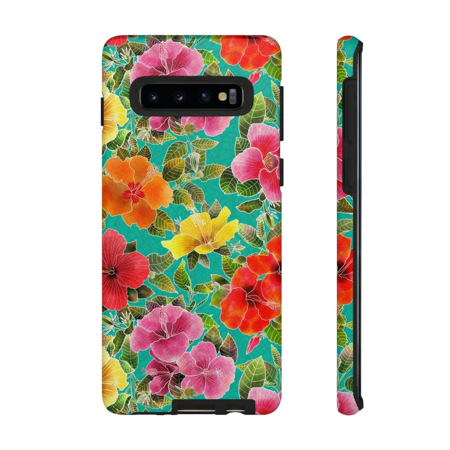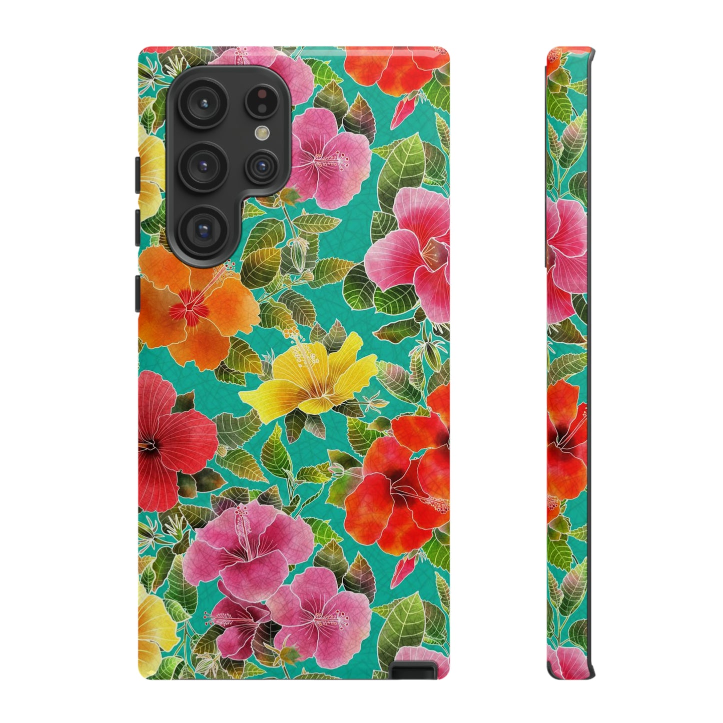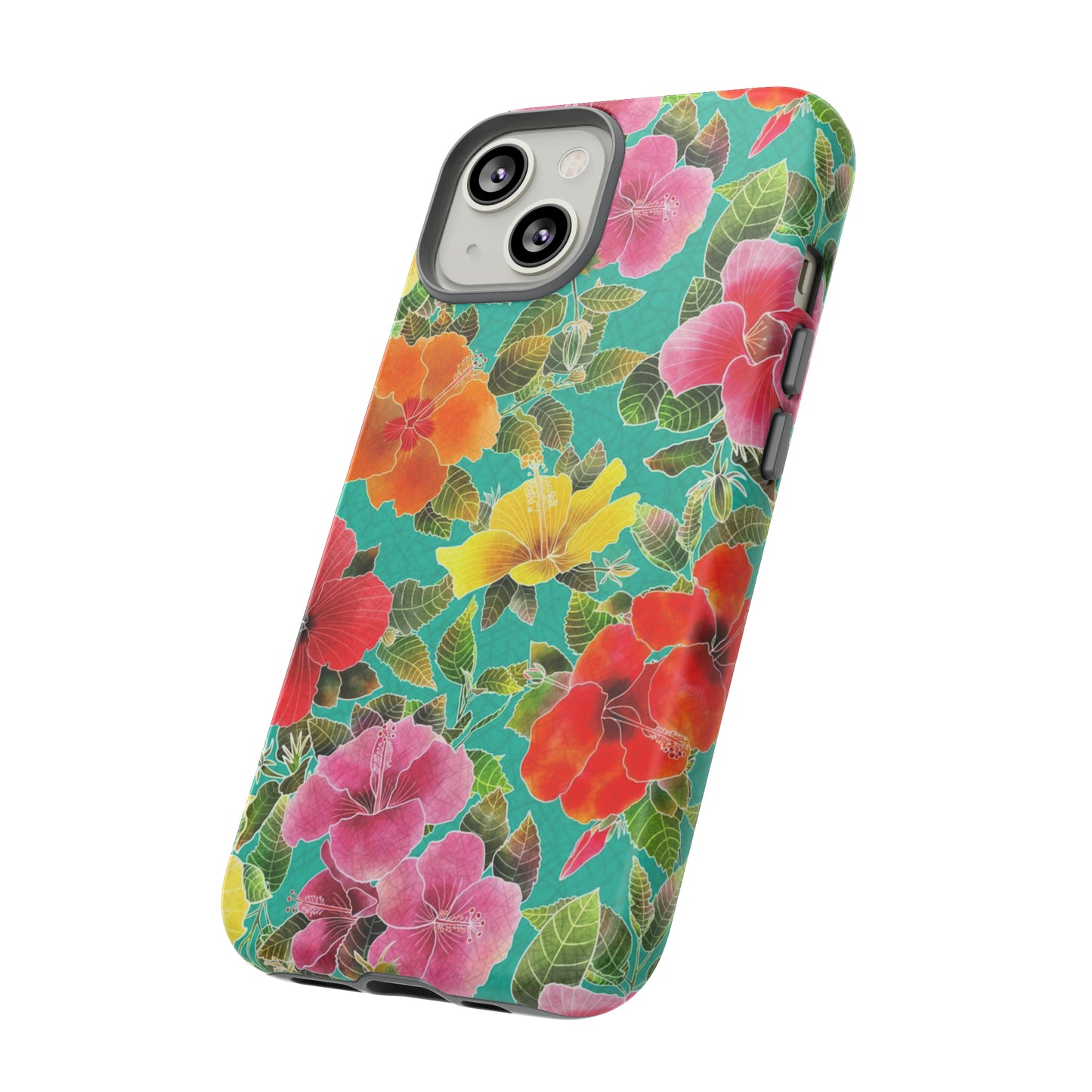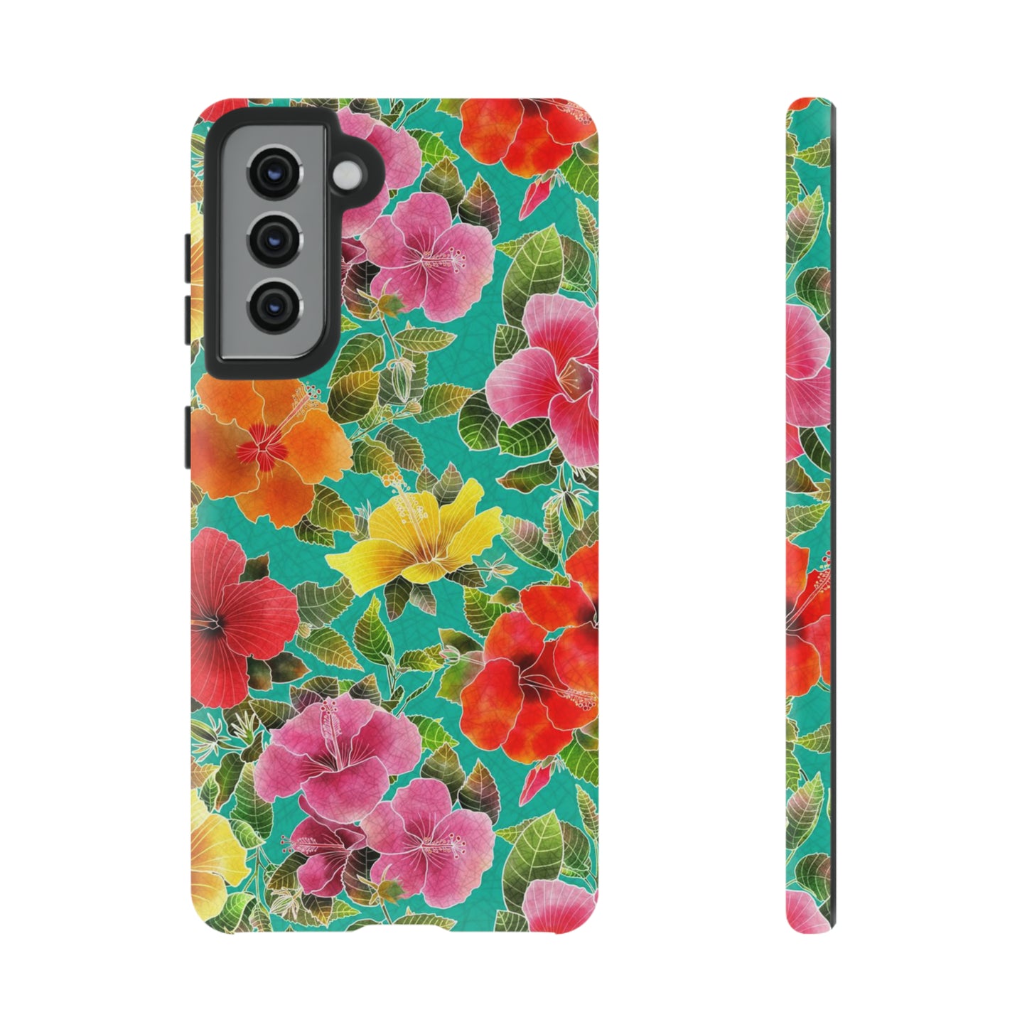 Introducing the Hibiscus Garden tough phone case, designed to keep your phone safe and stylish! This phone case features a beautiful batik-style design with red, yellow, orange, and pink hibiscus flowers painted on a turquoise background. The tough exterior is designed to withstand drops and impact, keeping your phone safe from scratches and cracks.