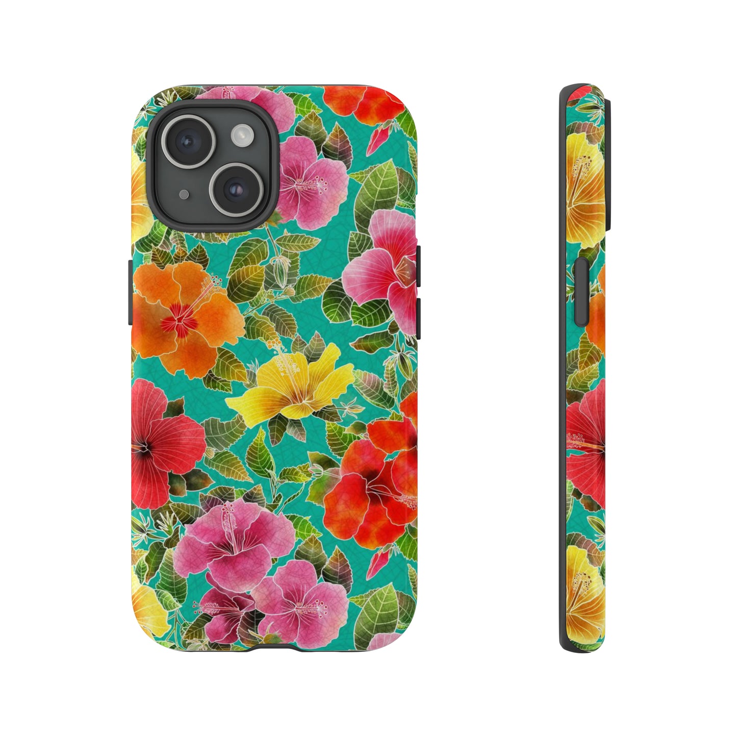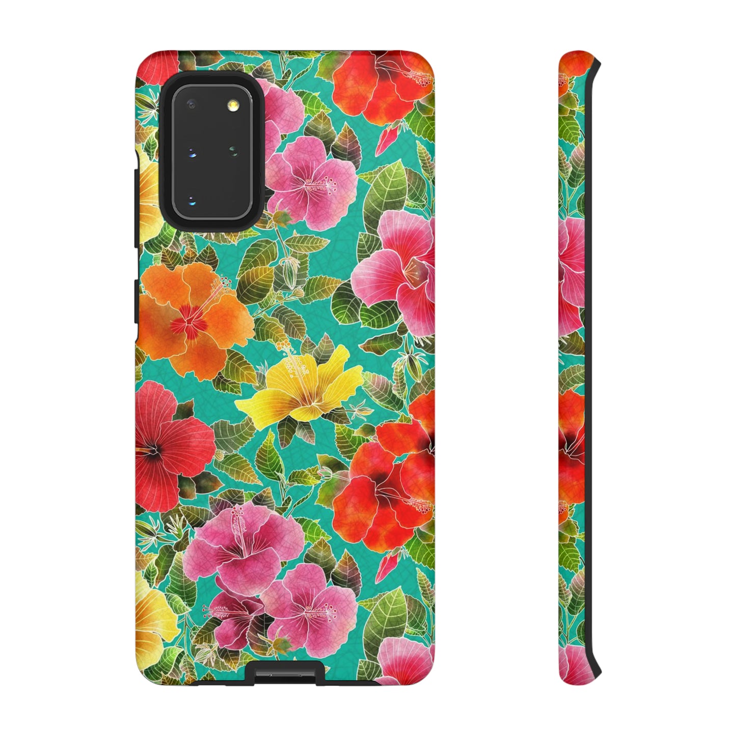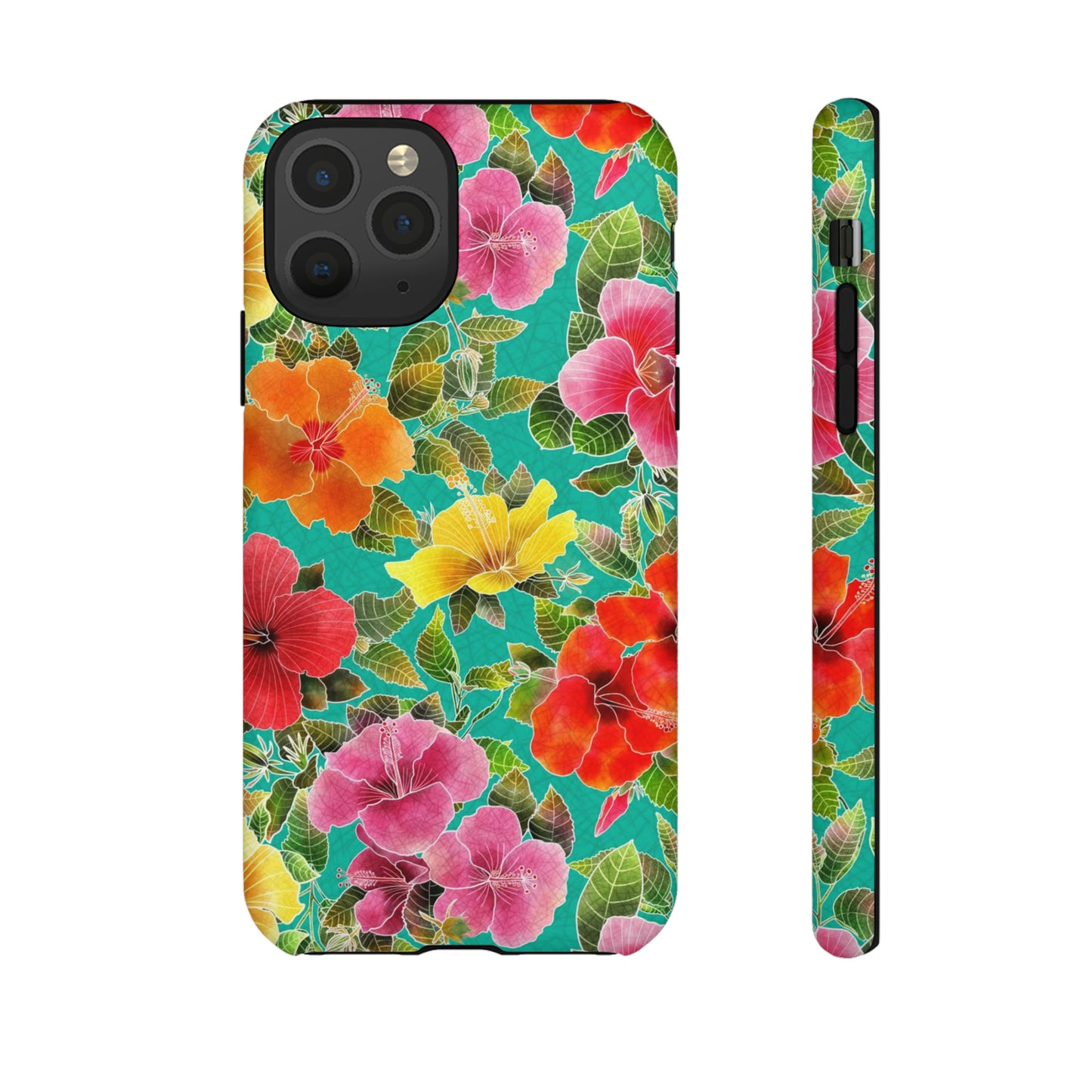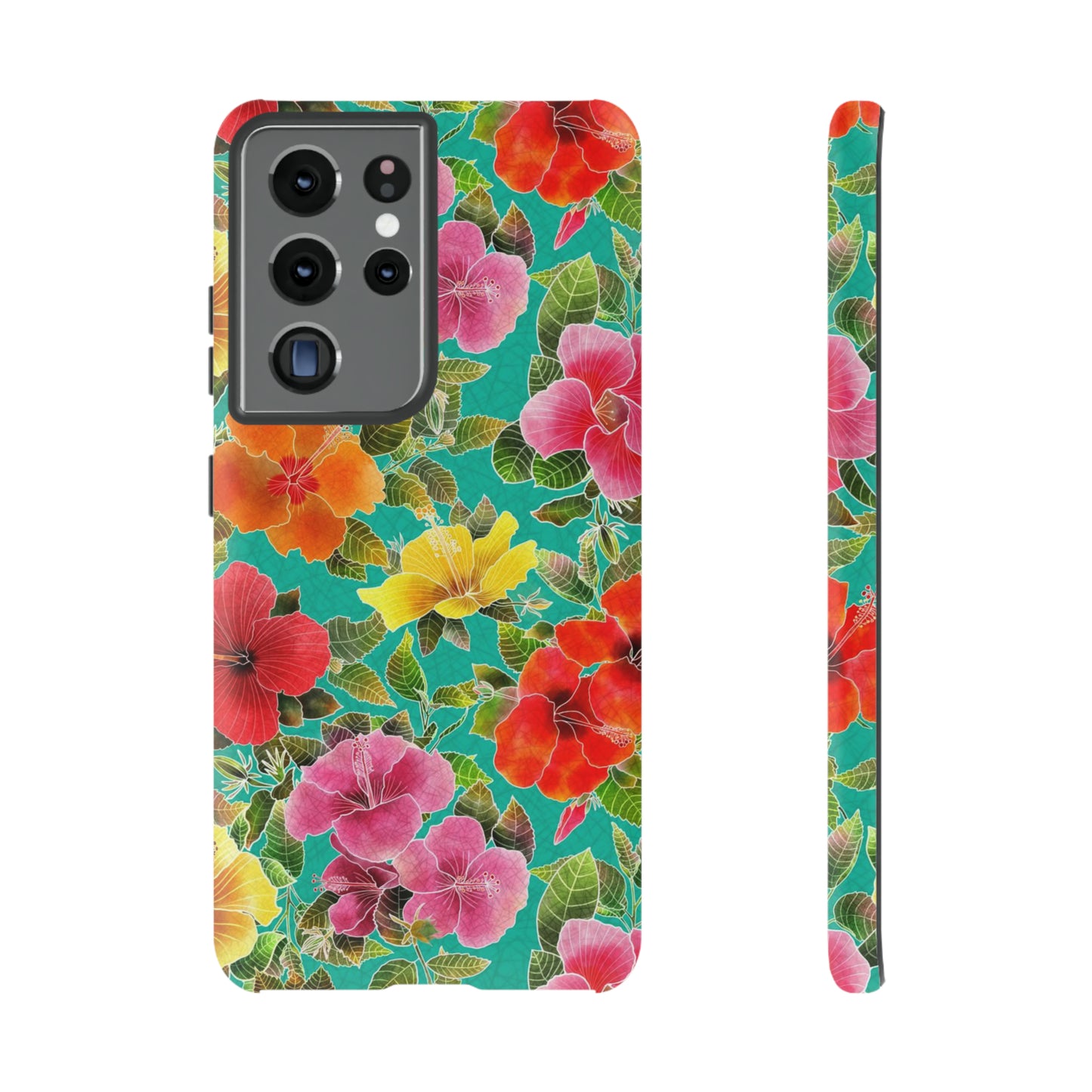 Introducing the Hibiscus Garden tough phone case, designed to keep your phone safe and stylish! This phone case features a beautiful batik-style design with red, yellow, orange, and pink hibiscus flowers painted on a turquoise background. The tough exterior is designed to withstand drops and impact, keeping your phone safe from scratches and cracks.