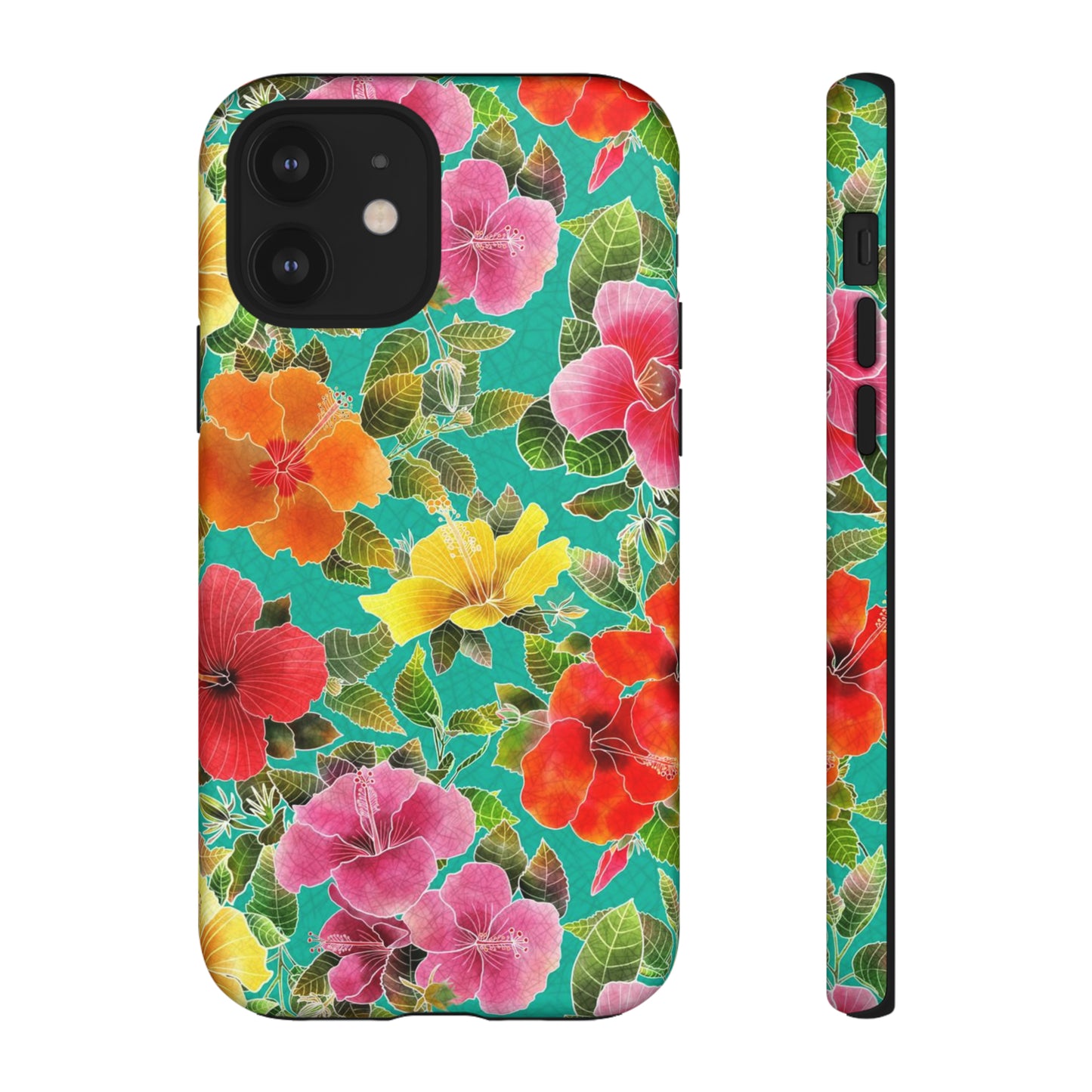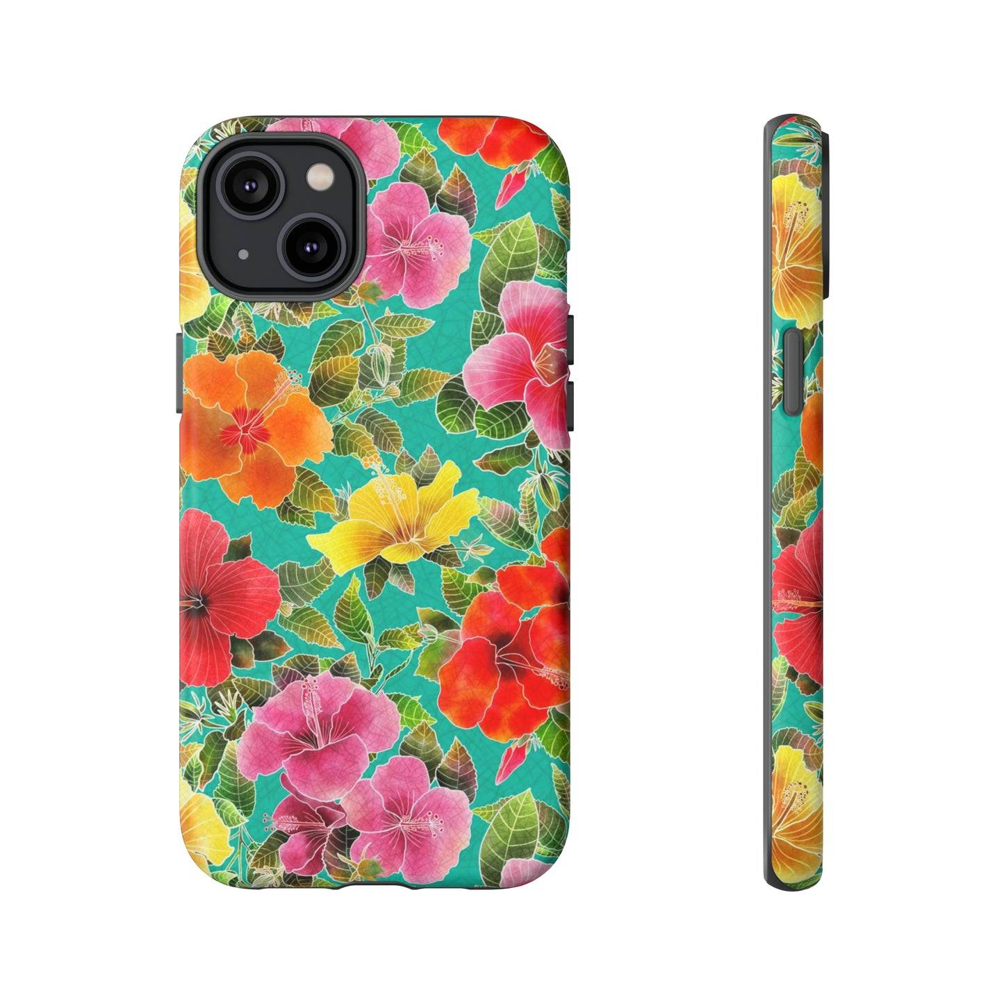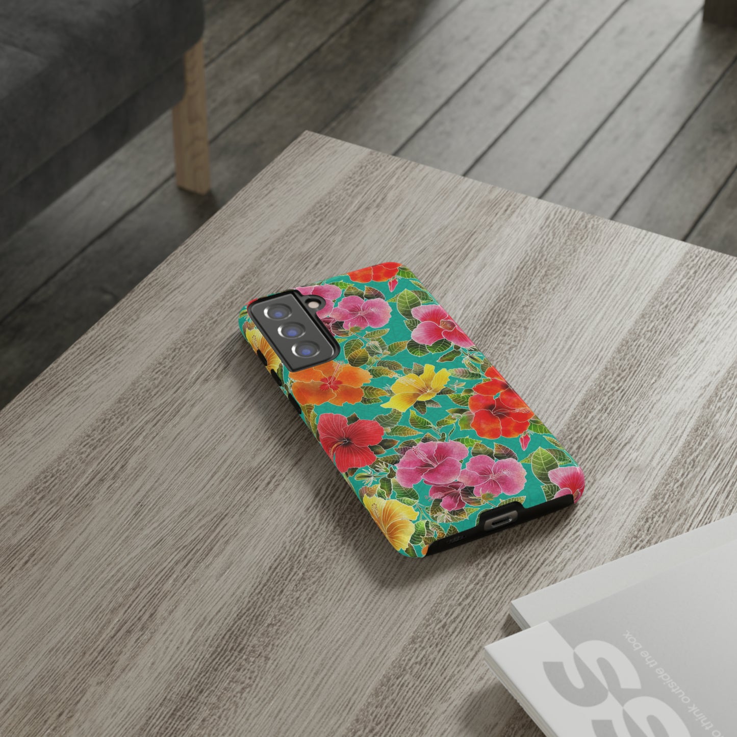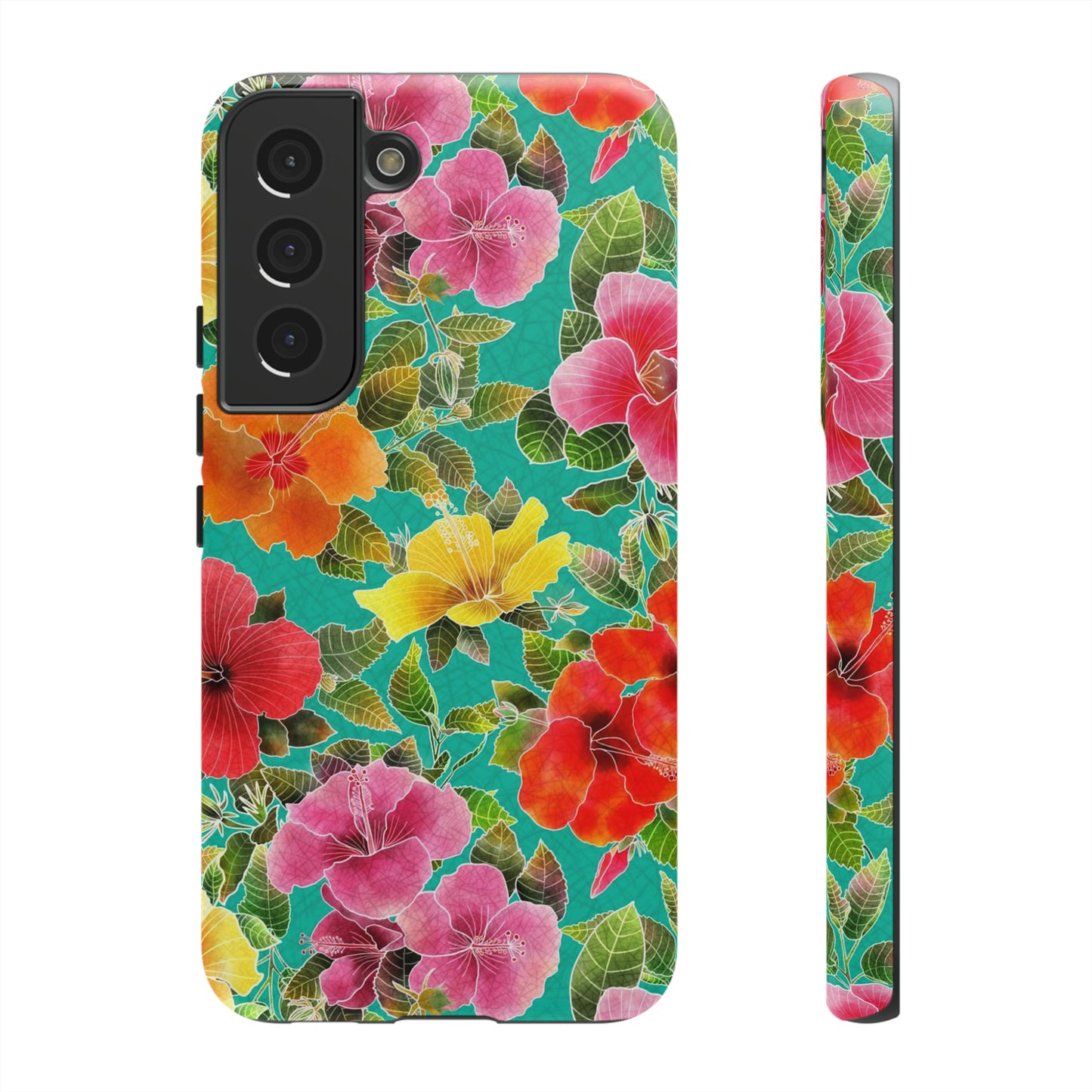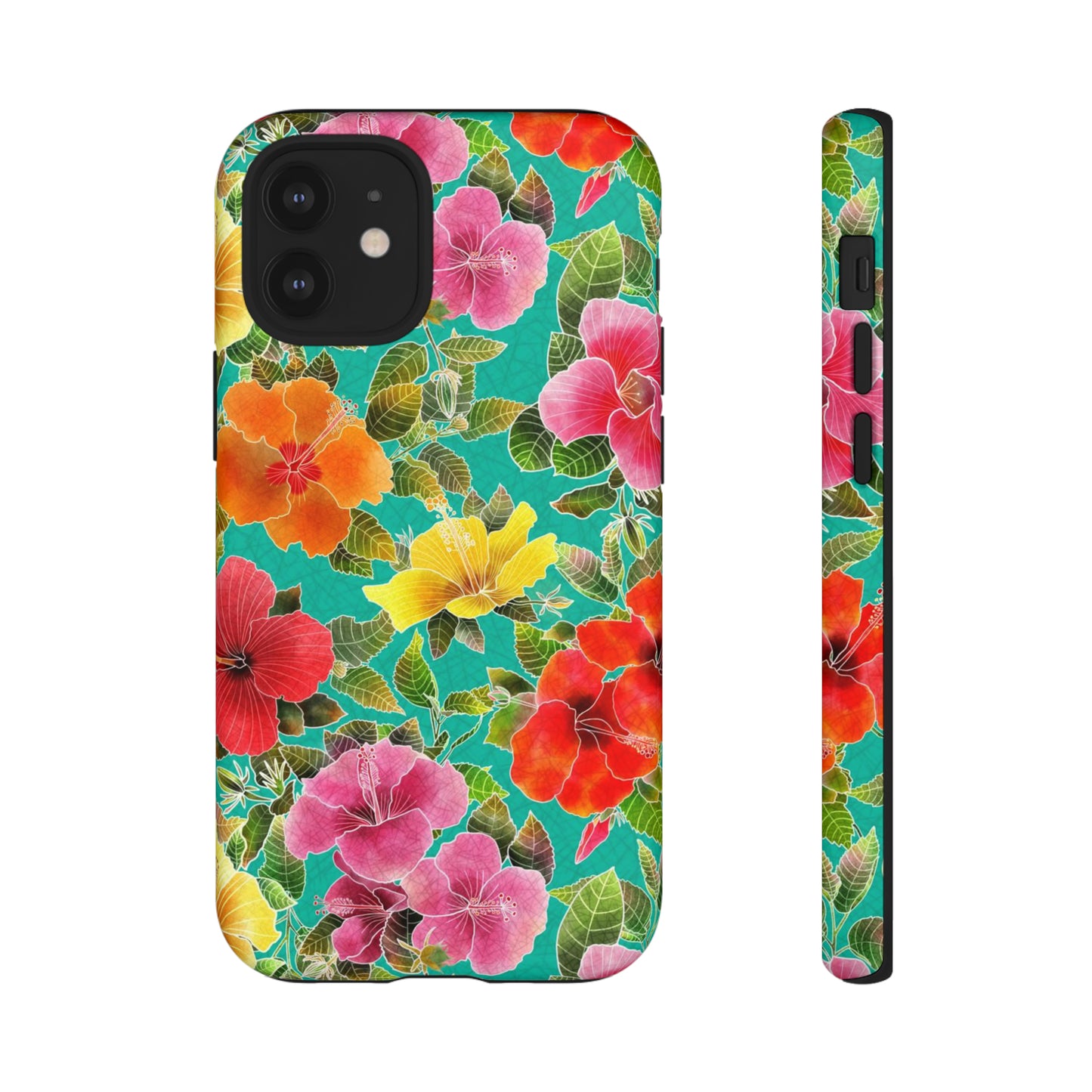 Introducing the Hibiscus Garden tough phone case, designed to keep your phone safe and stylish! This phone case features a beautiful batik-style design with red, yellow, orange, and pink hibiscus flowers painted on a turquoise background. The tough exterior is designed to withstand drops and impact, keeping your phone safe from scratches and cracks.