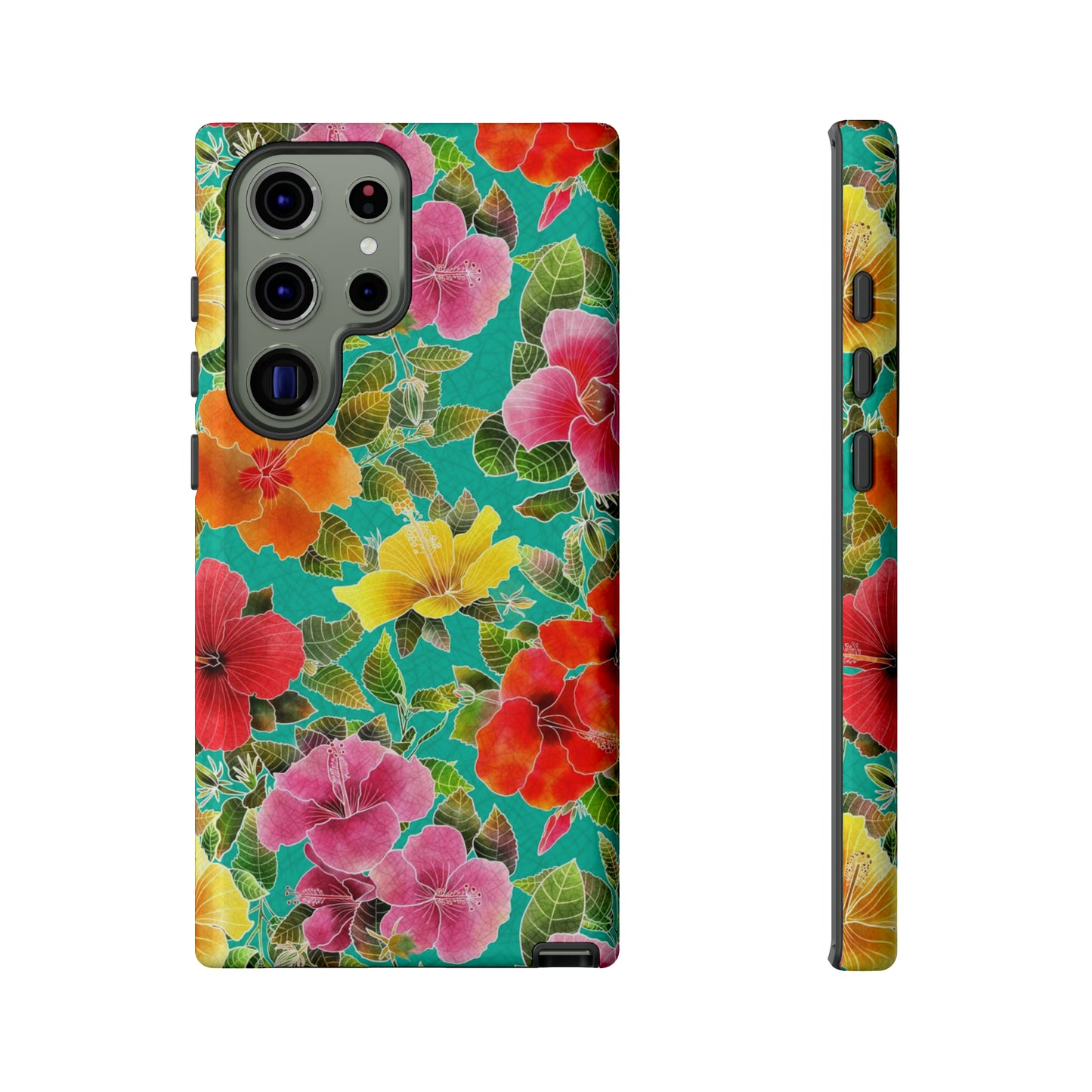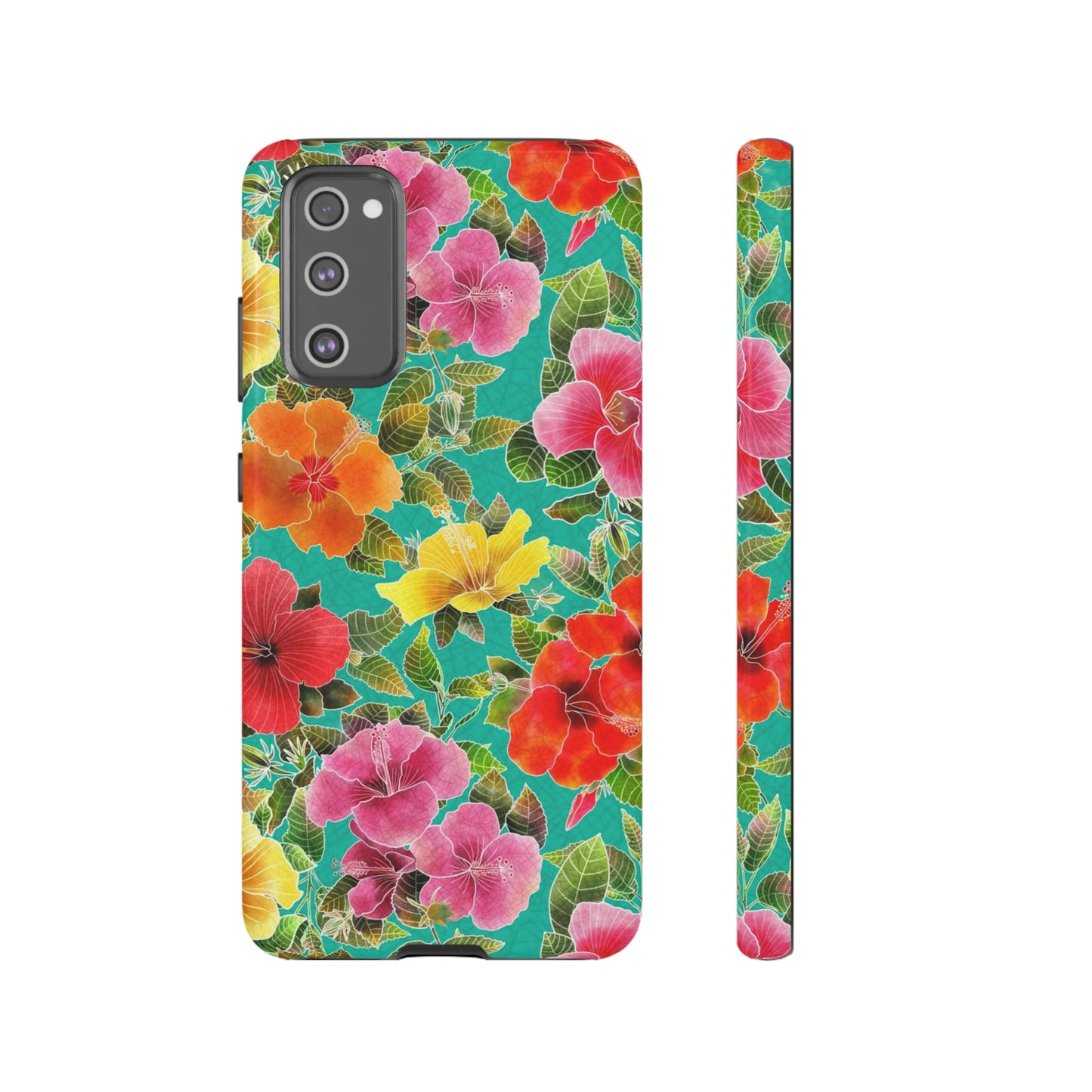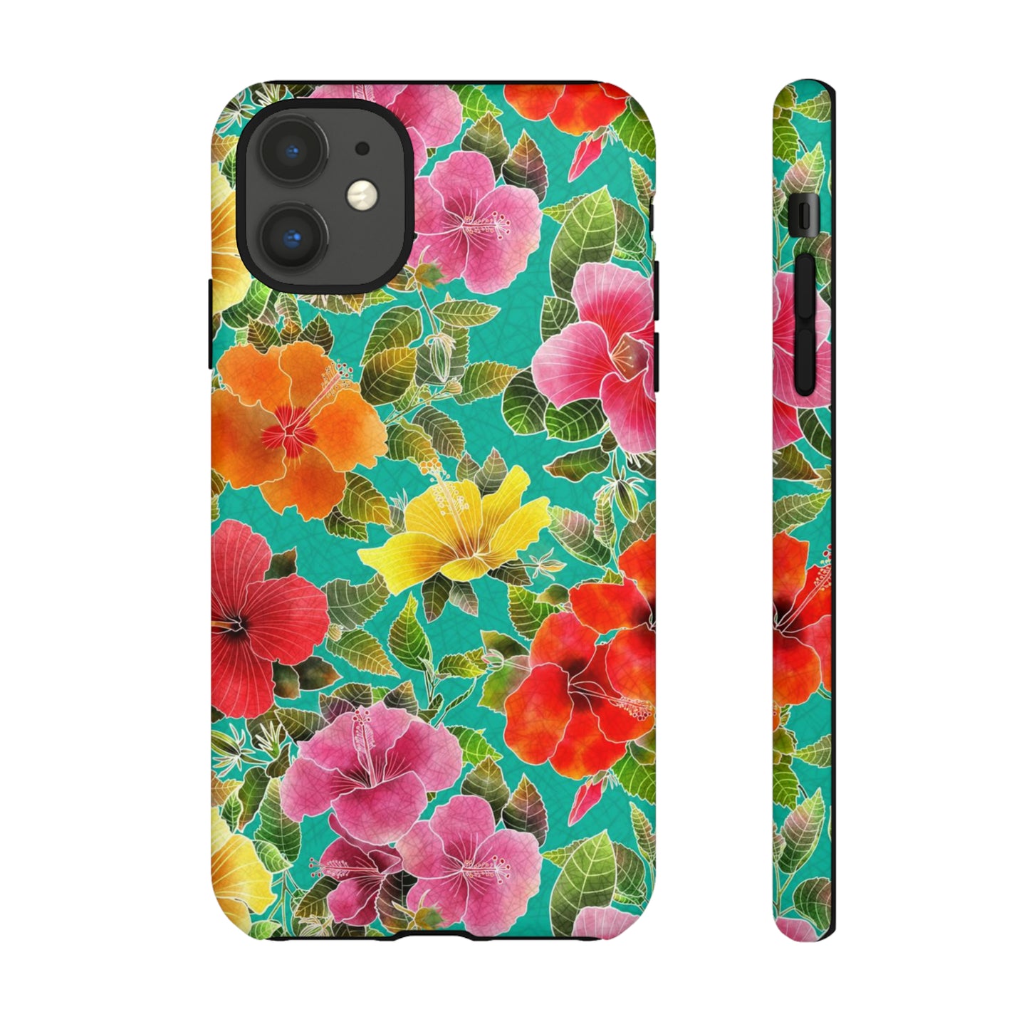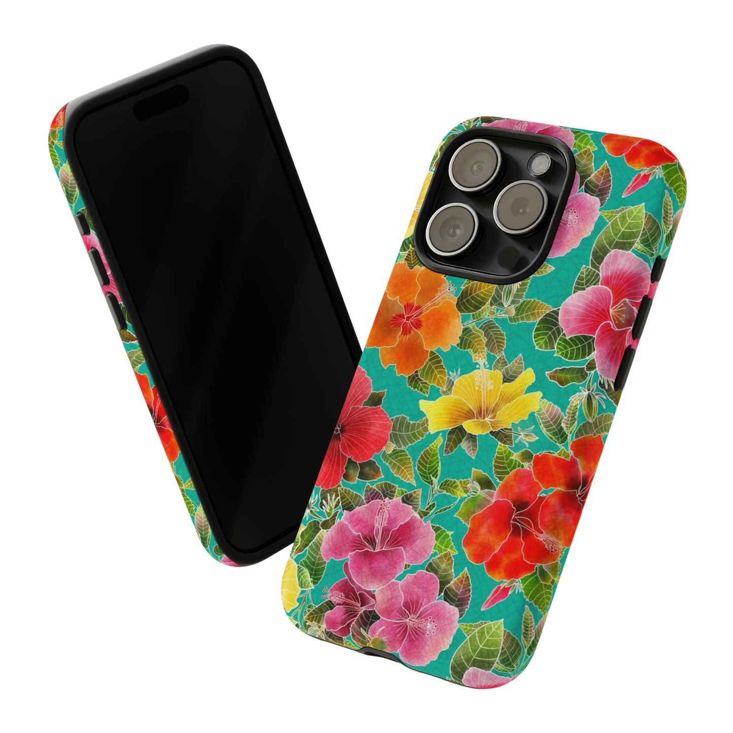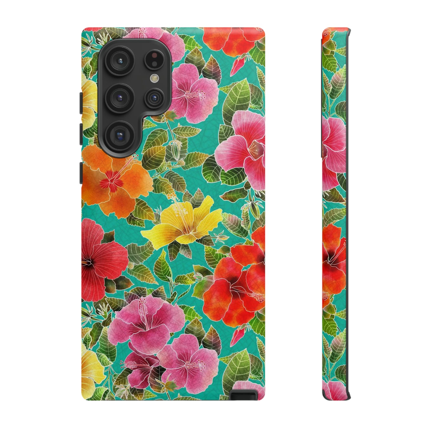 Introducing the Hibiscus Garden tough phone case, designed to keep your phone safe and stylish! This phone case features a beautiful batik-style design with red, yellow, orange, and pink hibiscus flowers painted on a turquoise background. The tough exterior is designed to withstand drops and impact, keeping your phone safe from scratches and cracks.