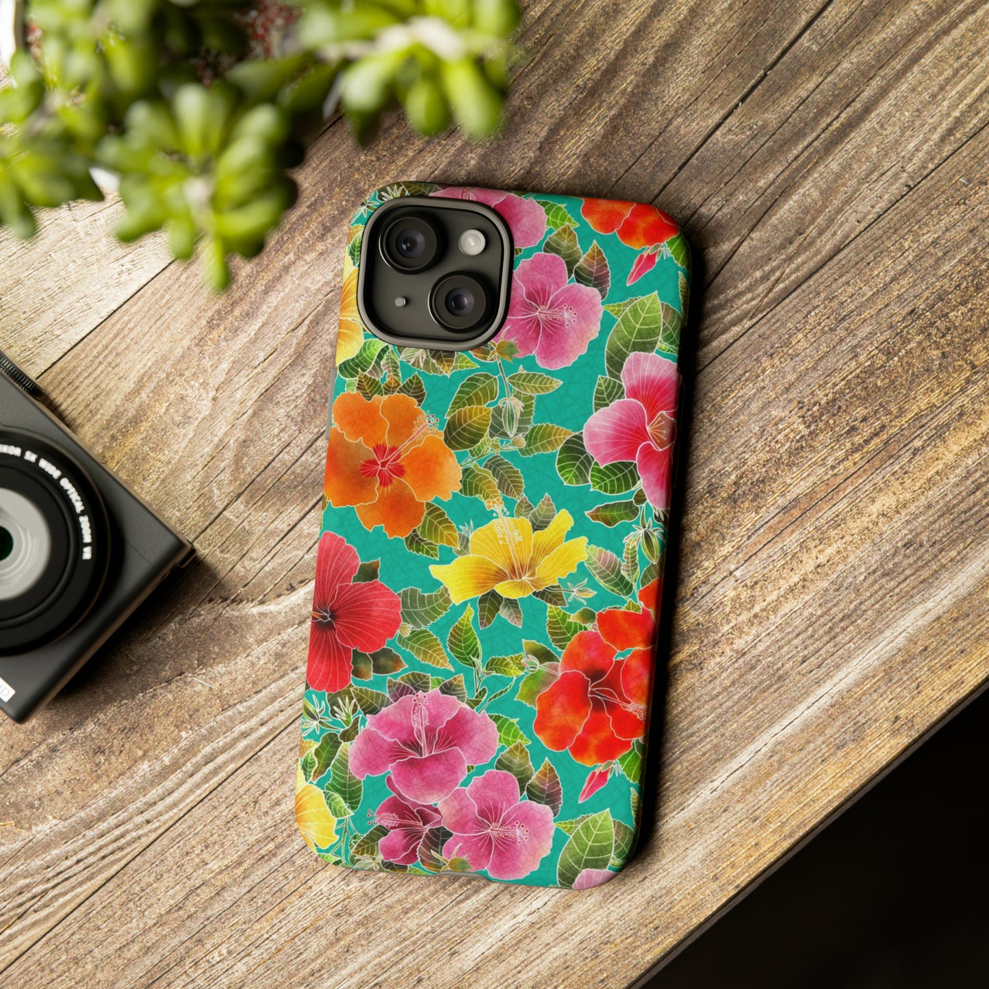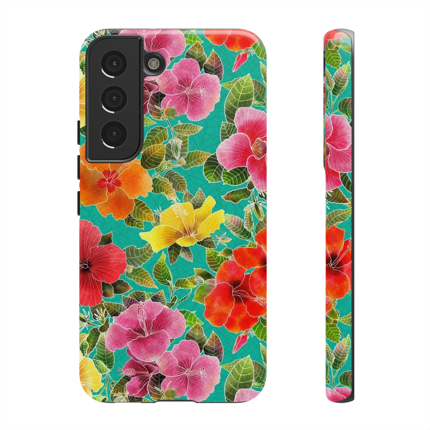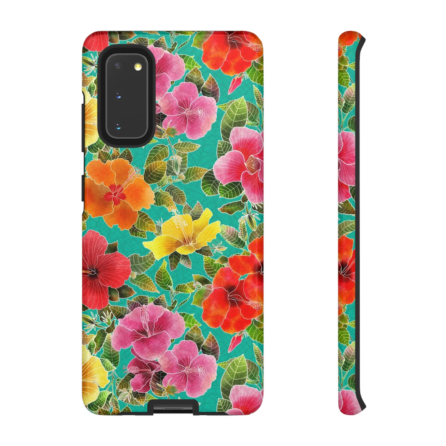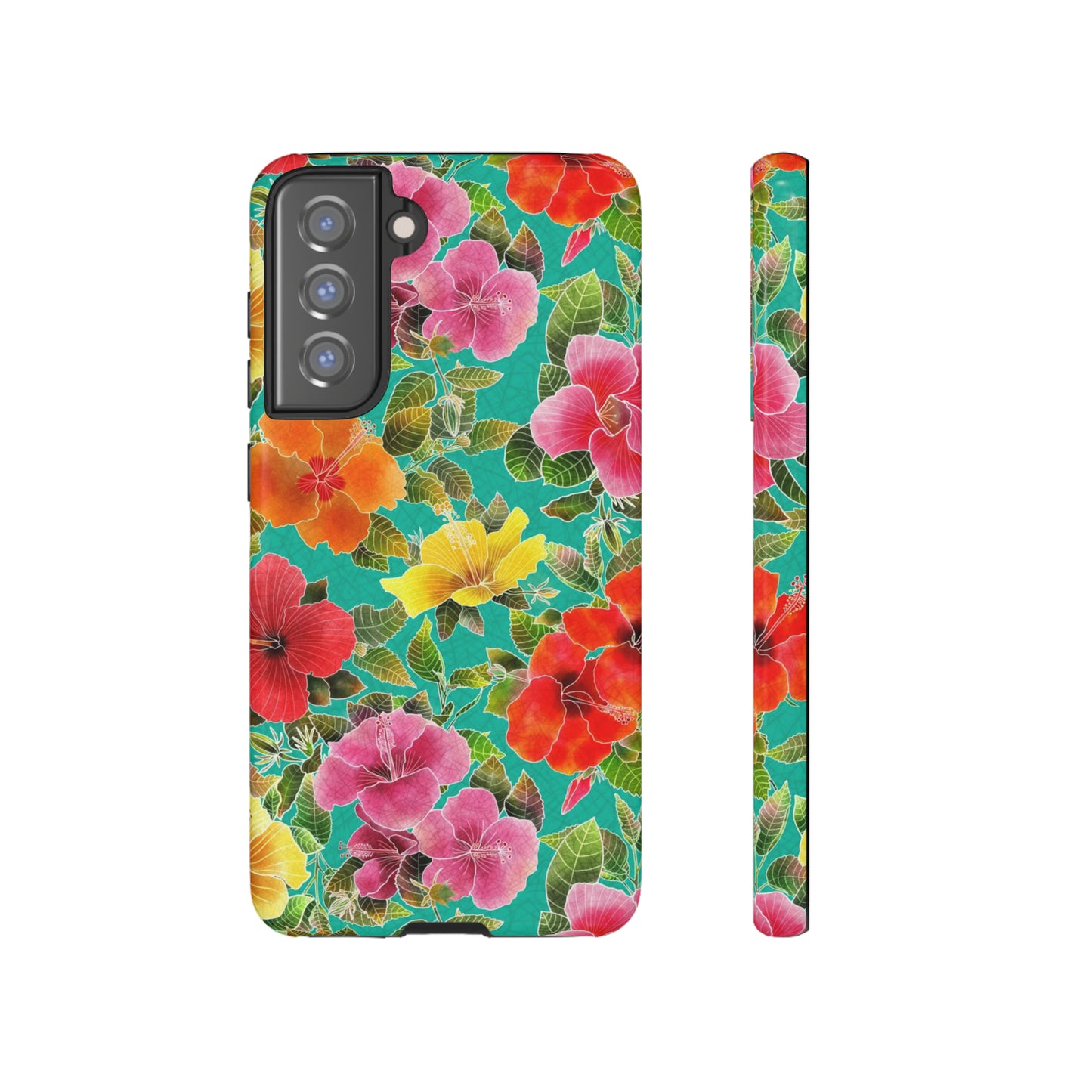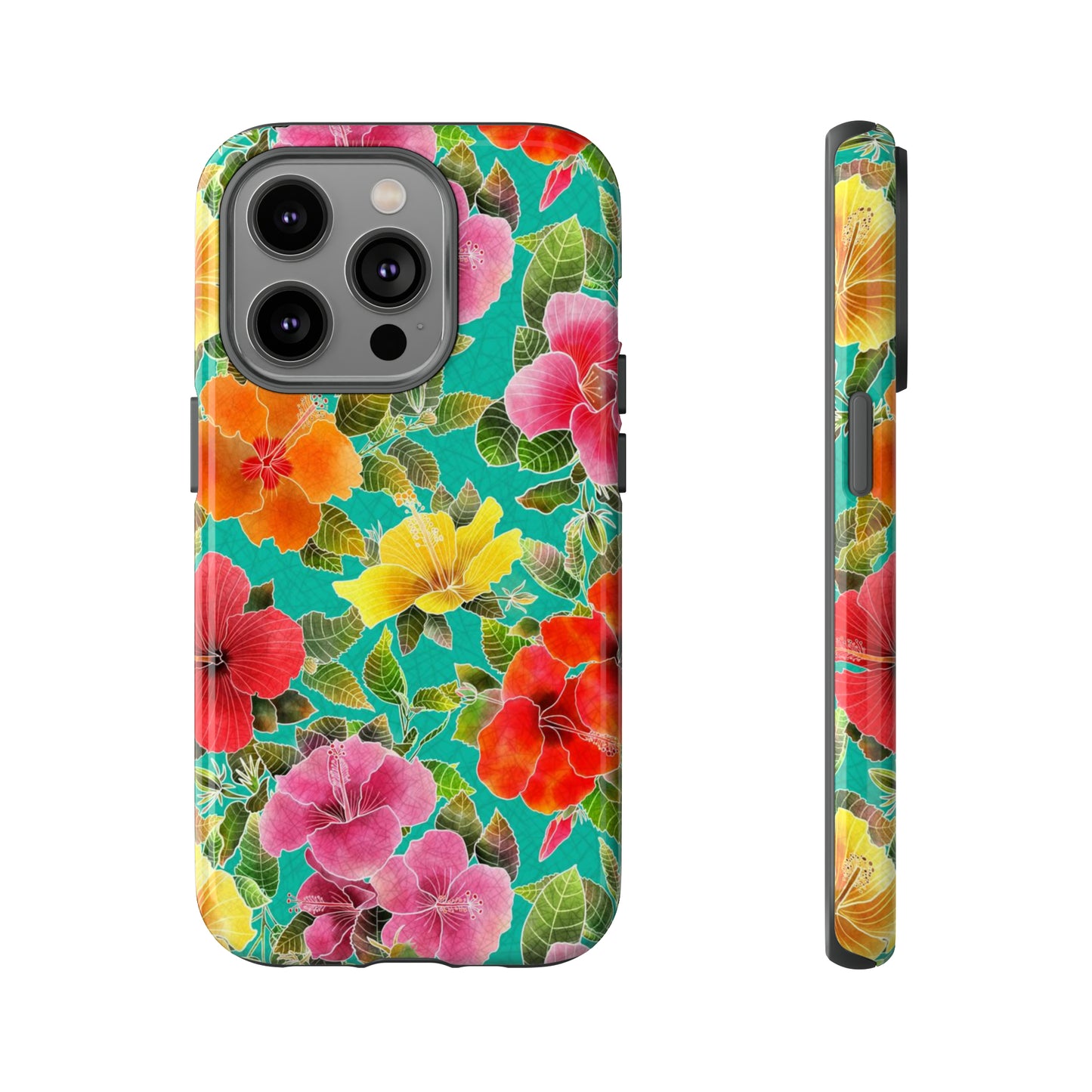 Introducing the Hibiscus Garden tough phone case, designed to keep your phone safe and stylish! This phone case features a beautiful batik-style design with red, yellow, orange, and pink hibiscus flowers painted on a turquoise background. The tough exterior is designed to withstand drops and impact, keeping your phone safe from scratches and cracks.