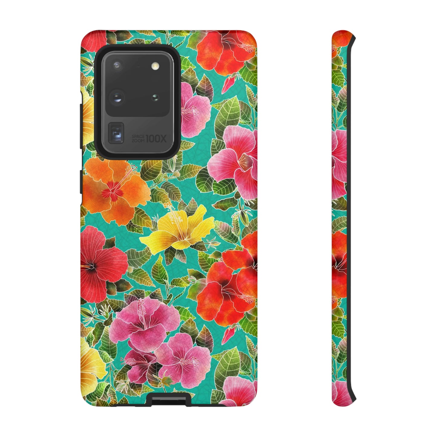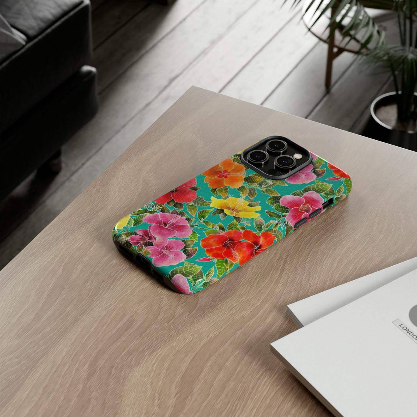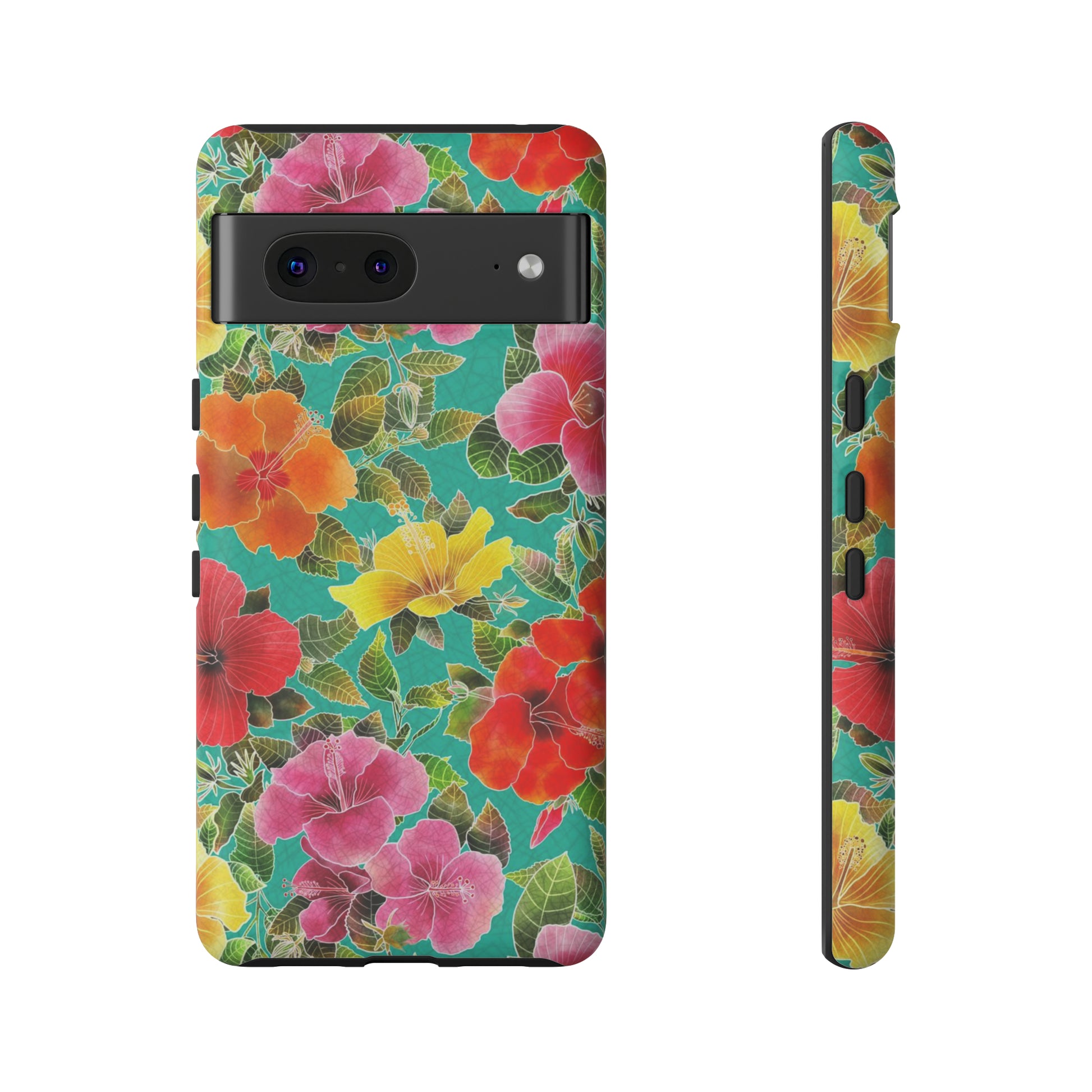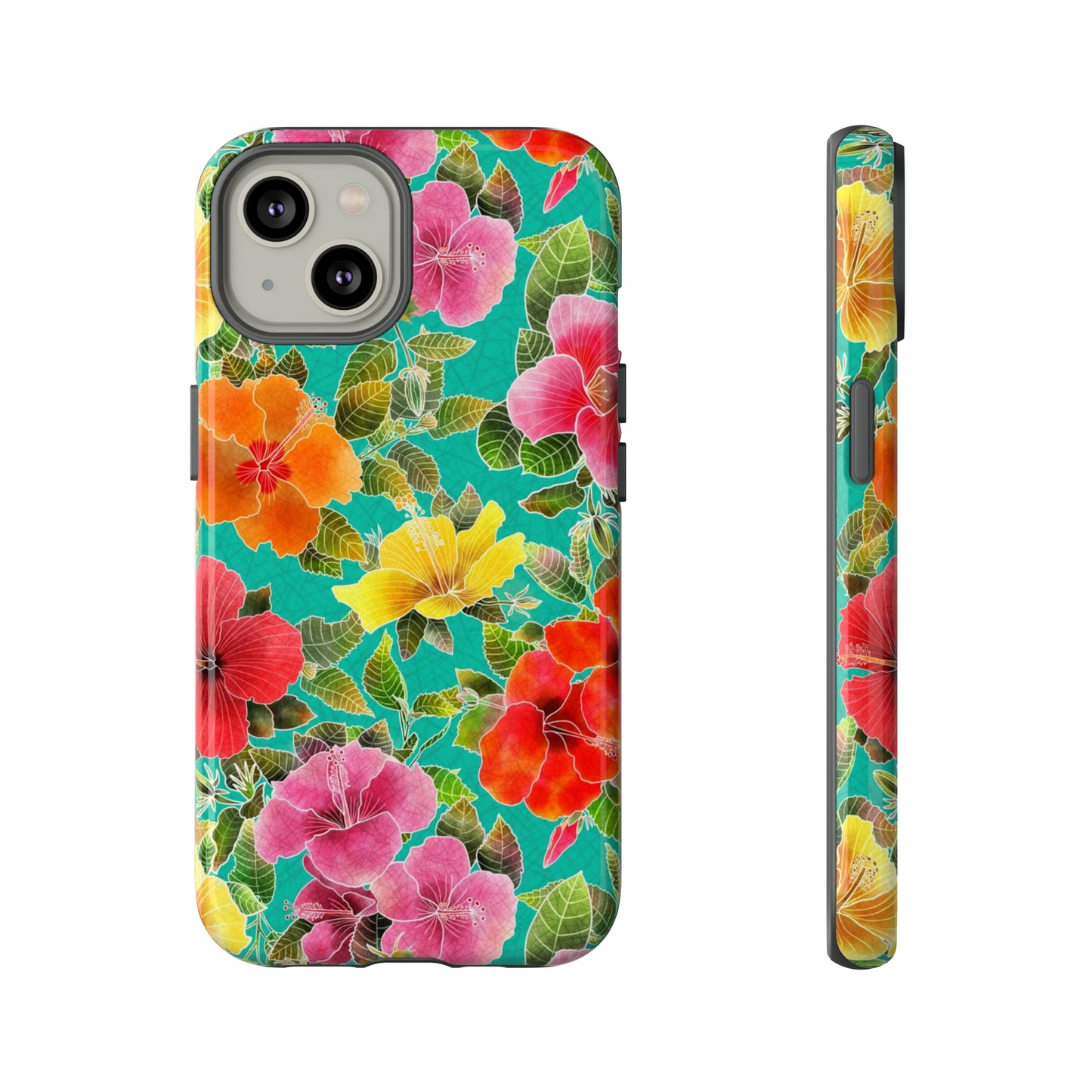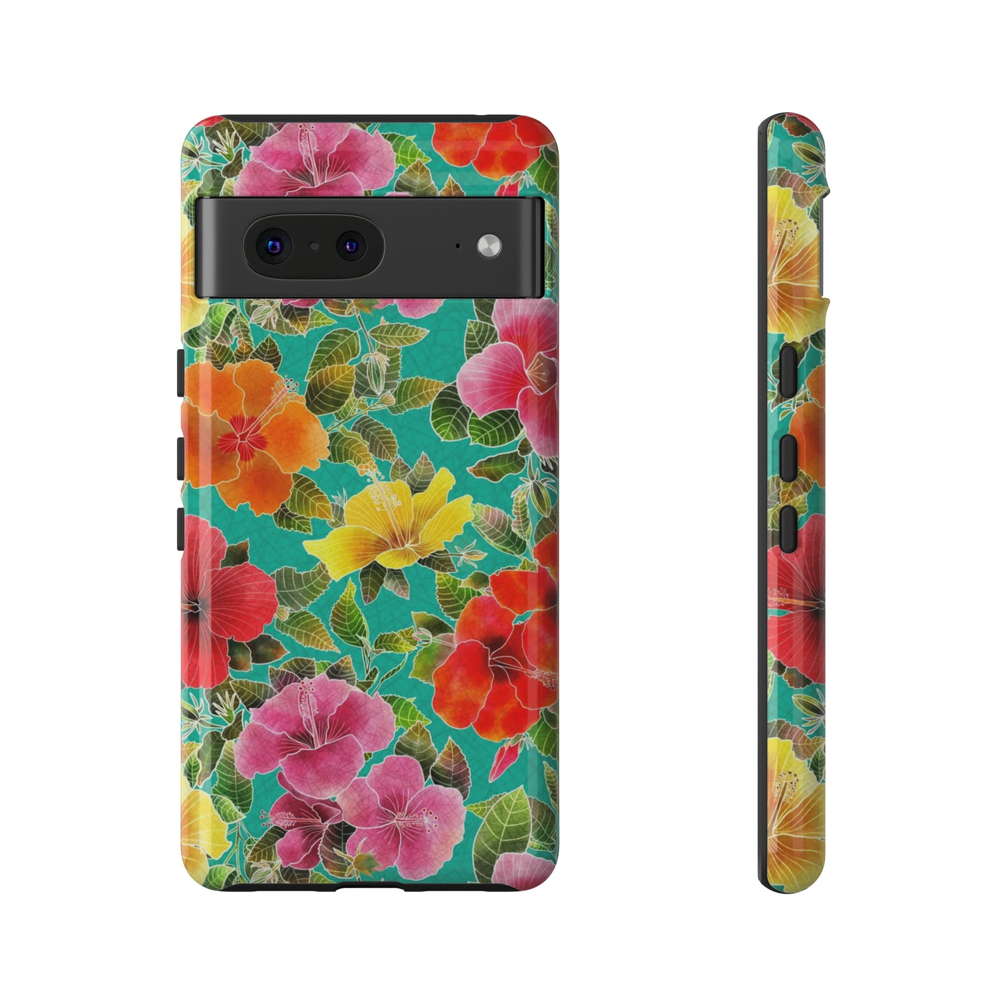 Introducing the Hibiscus Garden tough phone case, designed to keep your phone safe and stylish! This phone case features a beautiful batik-style design with red, yellow, orange, and pink hibiscus flowers painted on a turquoise background. The tough exterior is designed to withstand drops and impact, keeping your phone safe from scratches and cracks.