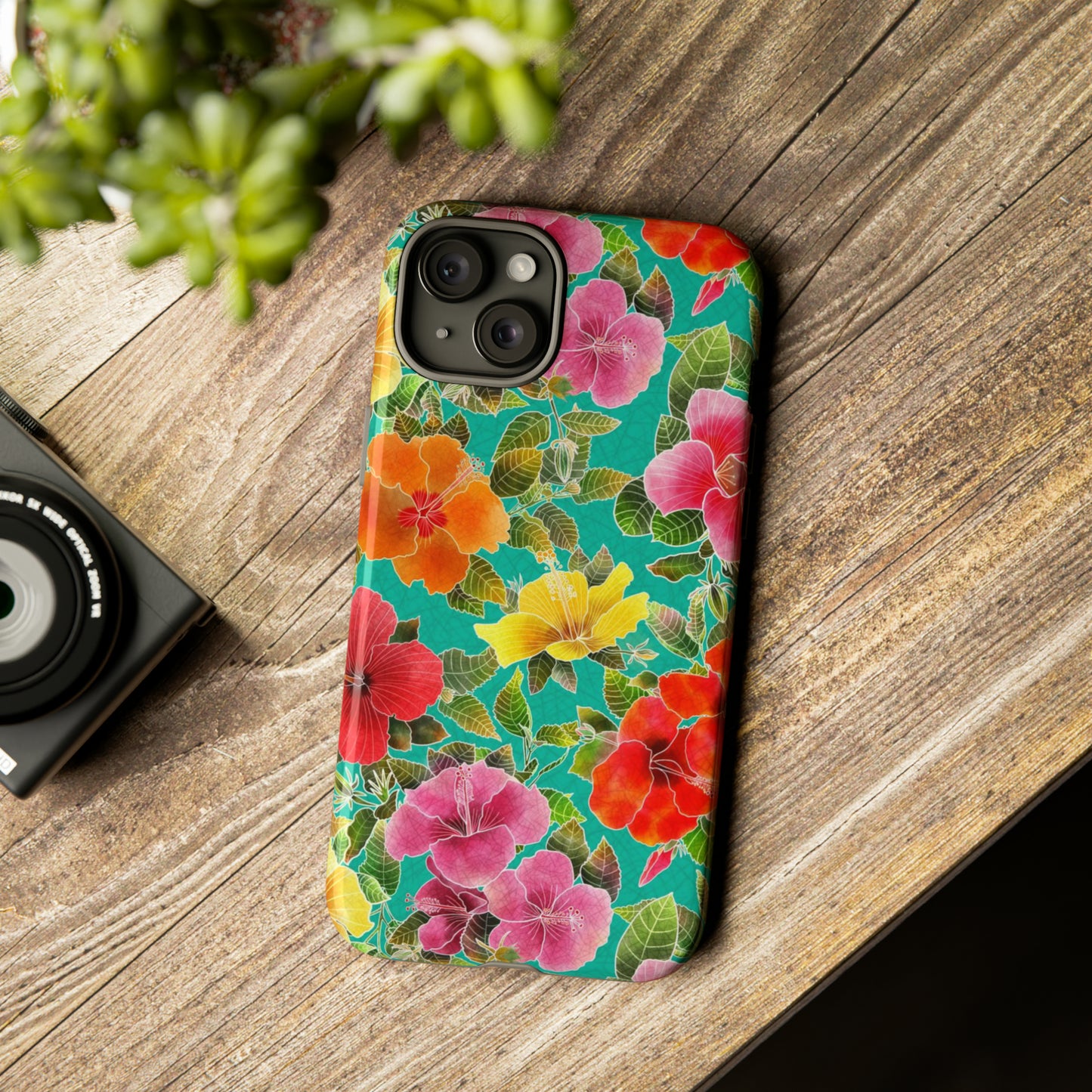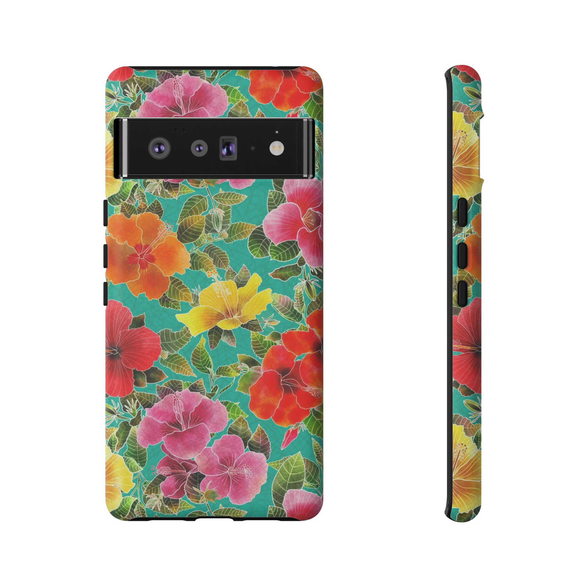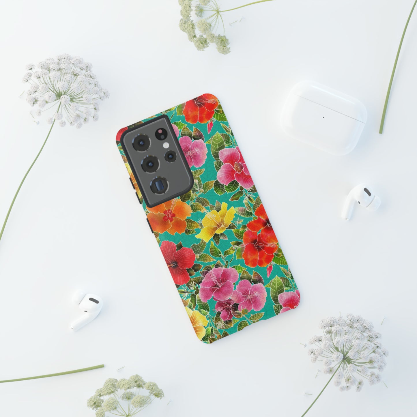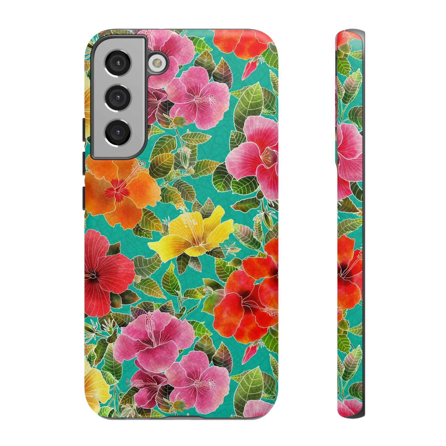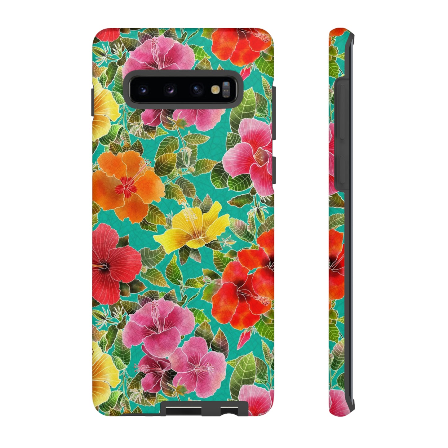 Introducing the Hibiscus Garden tough phone case, designed to keep your phone safe and stylish! This phone case features a beautiful batik-style design with red, yellow, orange, and pink hibiscus flowers painted on a turquoise background. The tough exterior is designed to withstand drops and impact, keeping your phone safe from scratches and cracks.