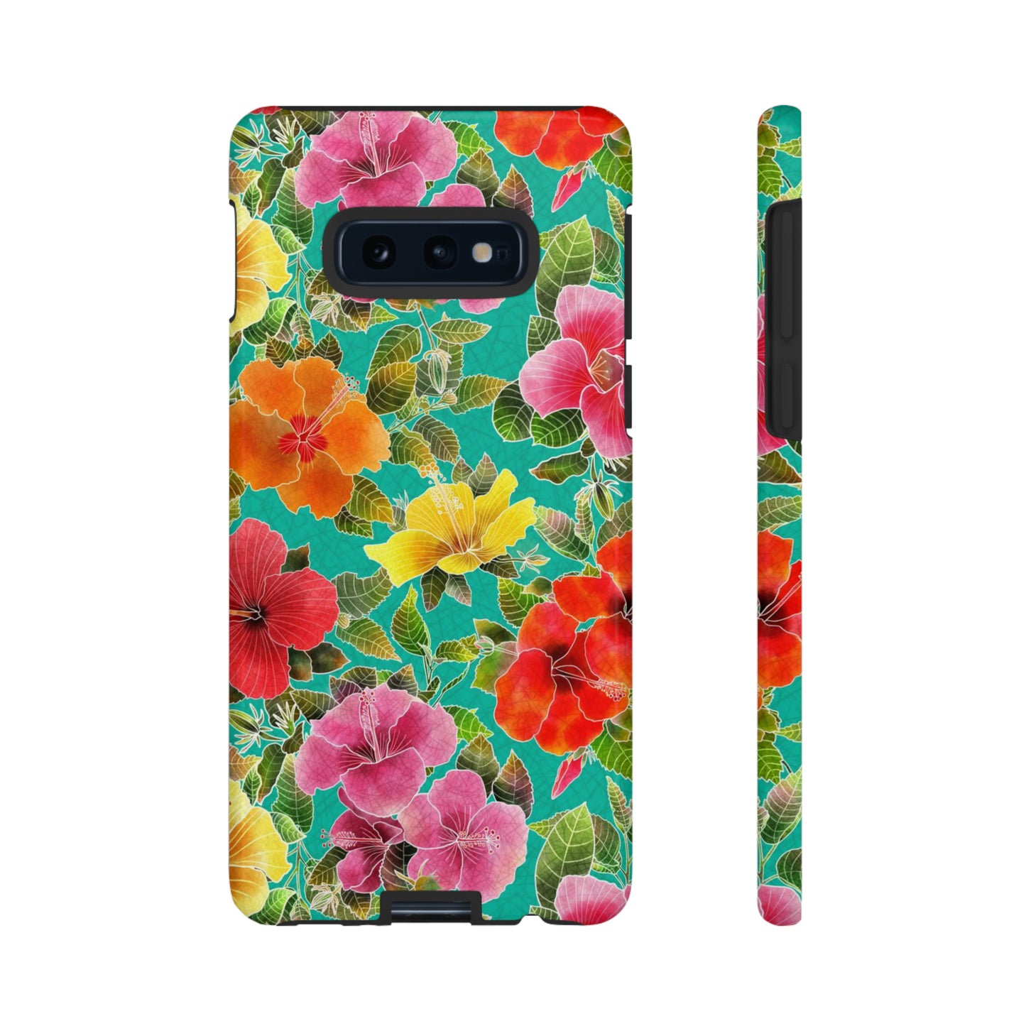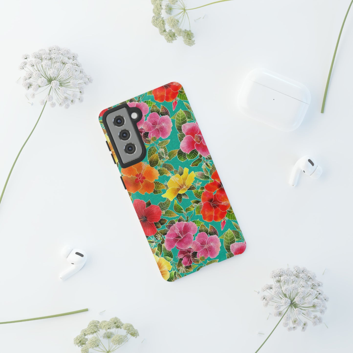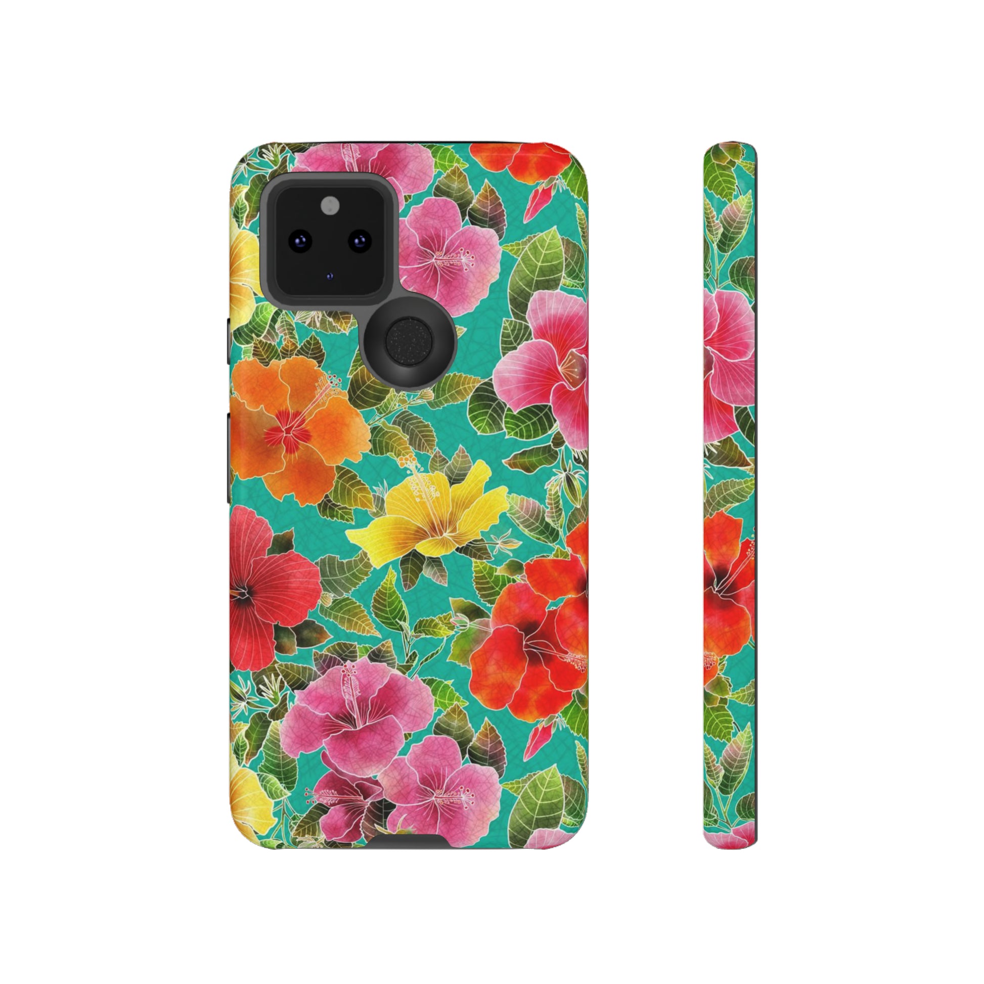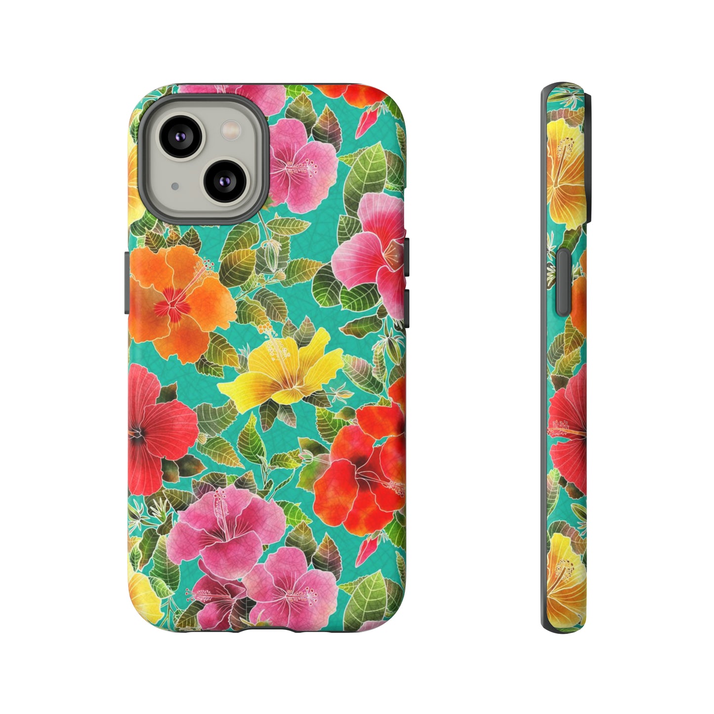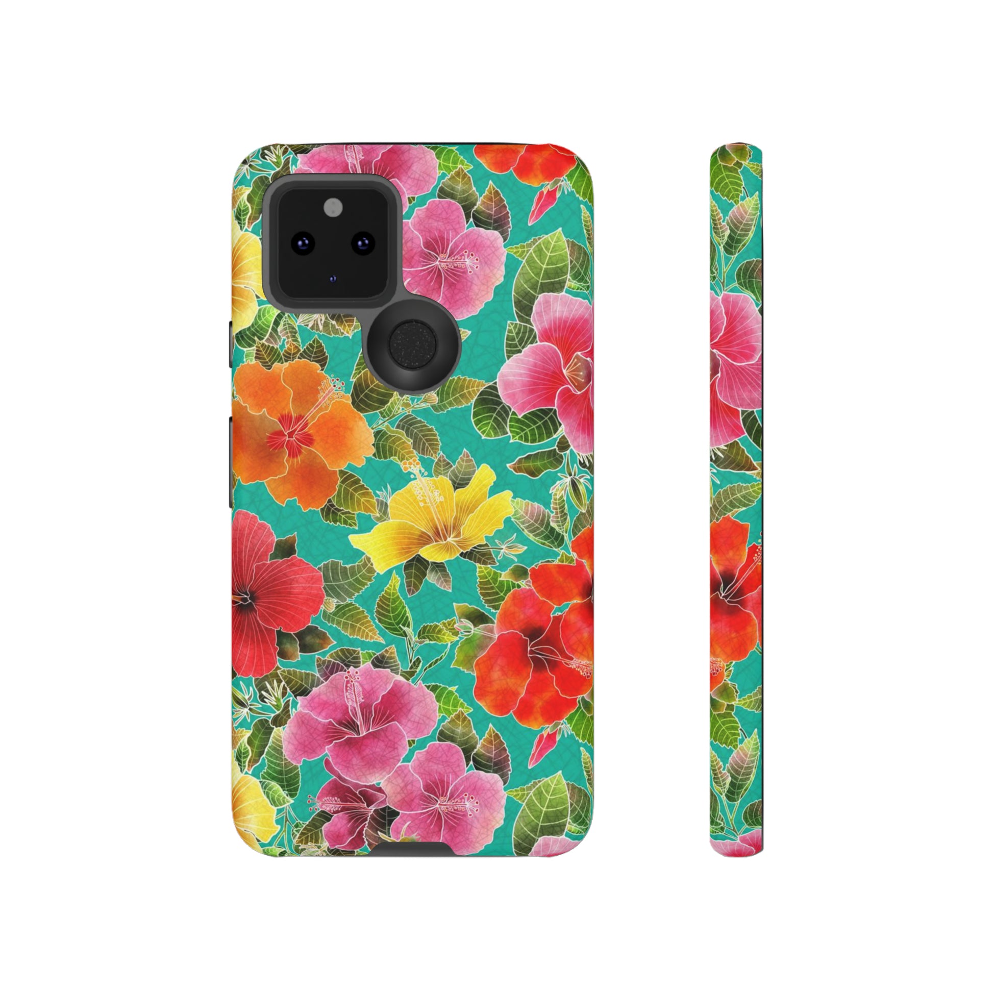 Introducing the Hibiscus Garden tough phone case, designed to keep your phone safe and stylish! This phone case features a beautiful batik-style design with red, yellow, orange, and pink hibiscus flowers painted on a turquoise background. The tough exterior is designed to withstand drops and impact, keeping your phone safe from scratches and cracks.