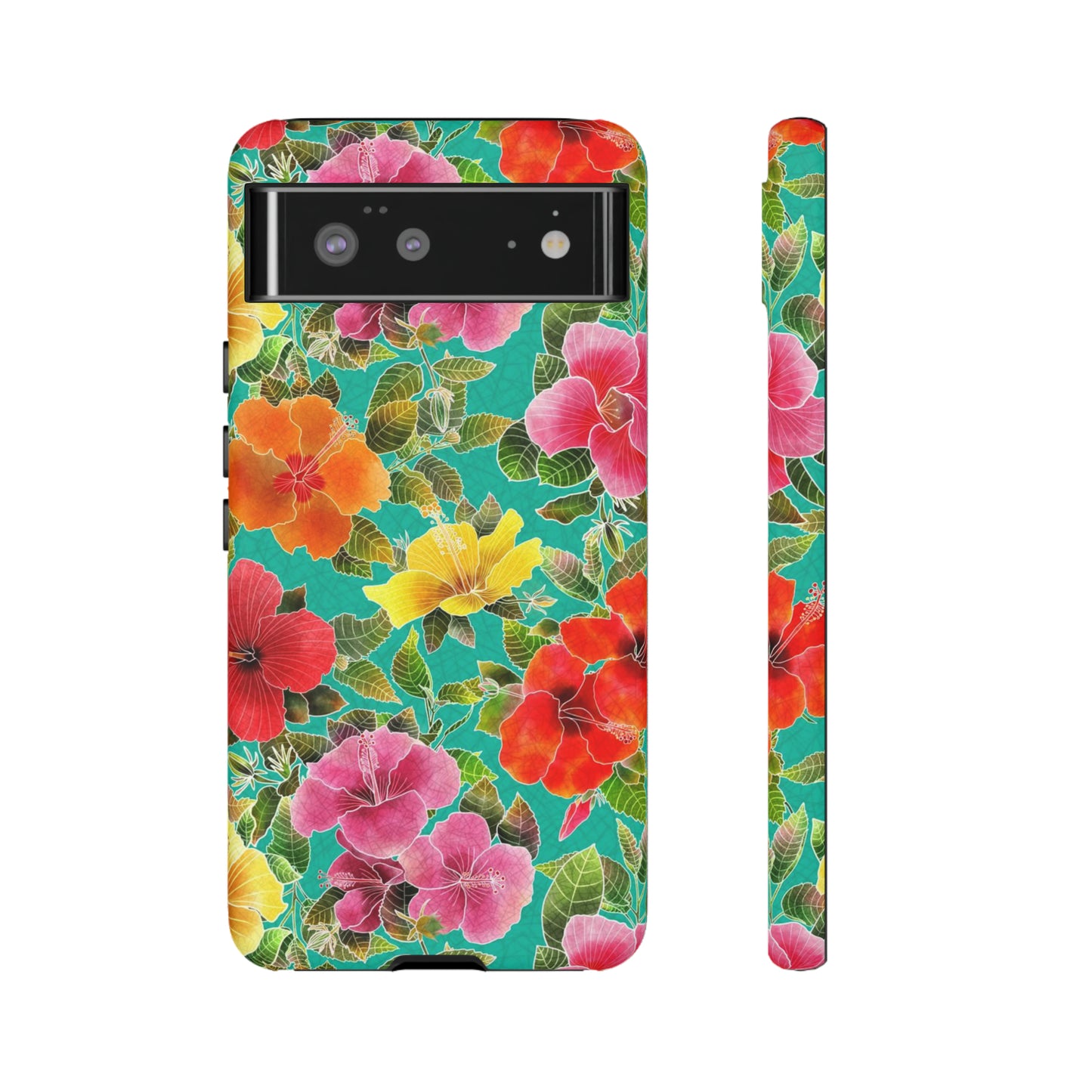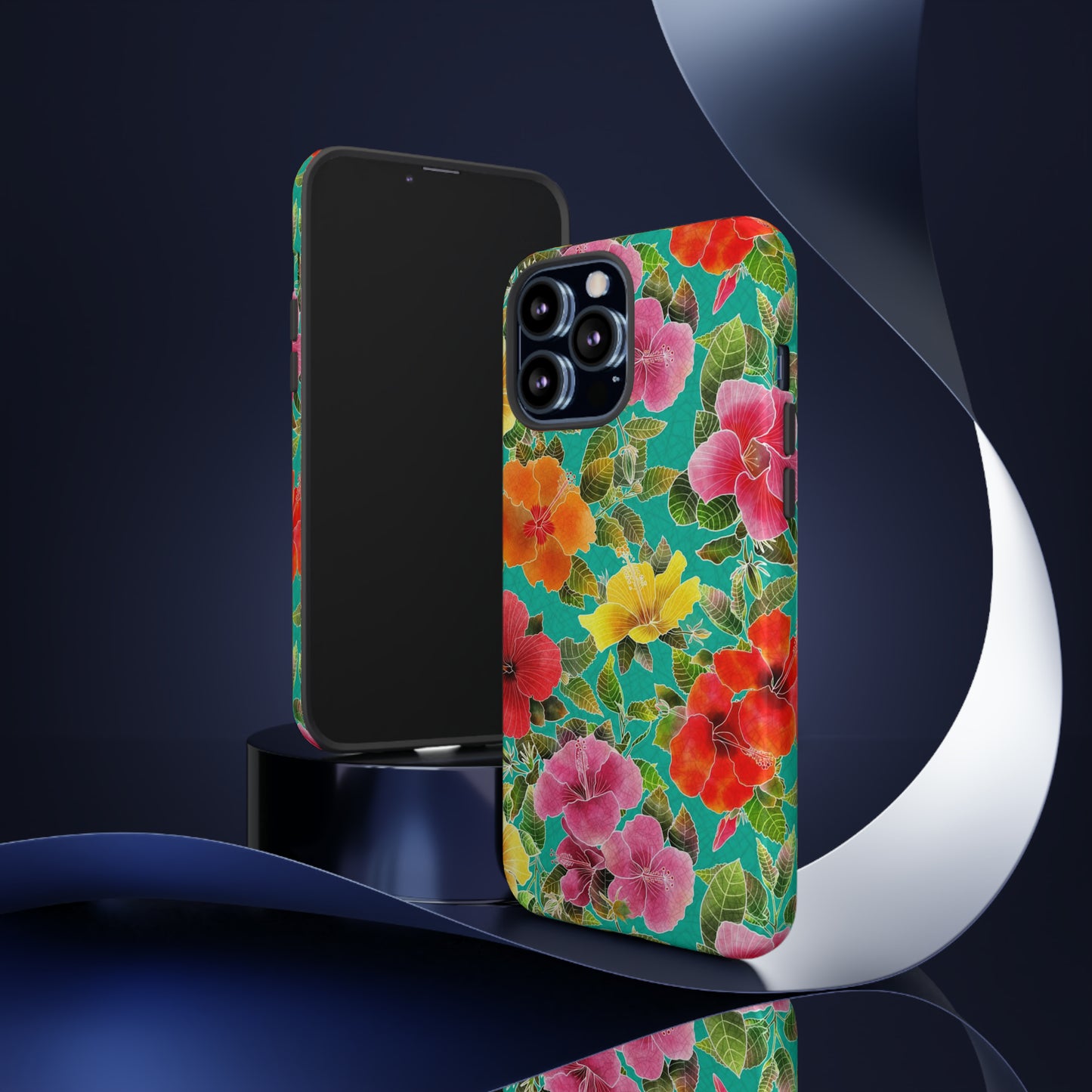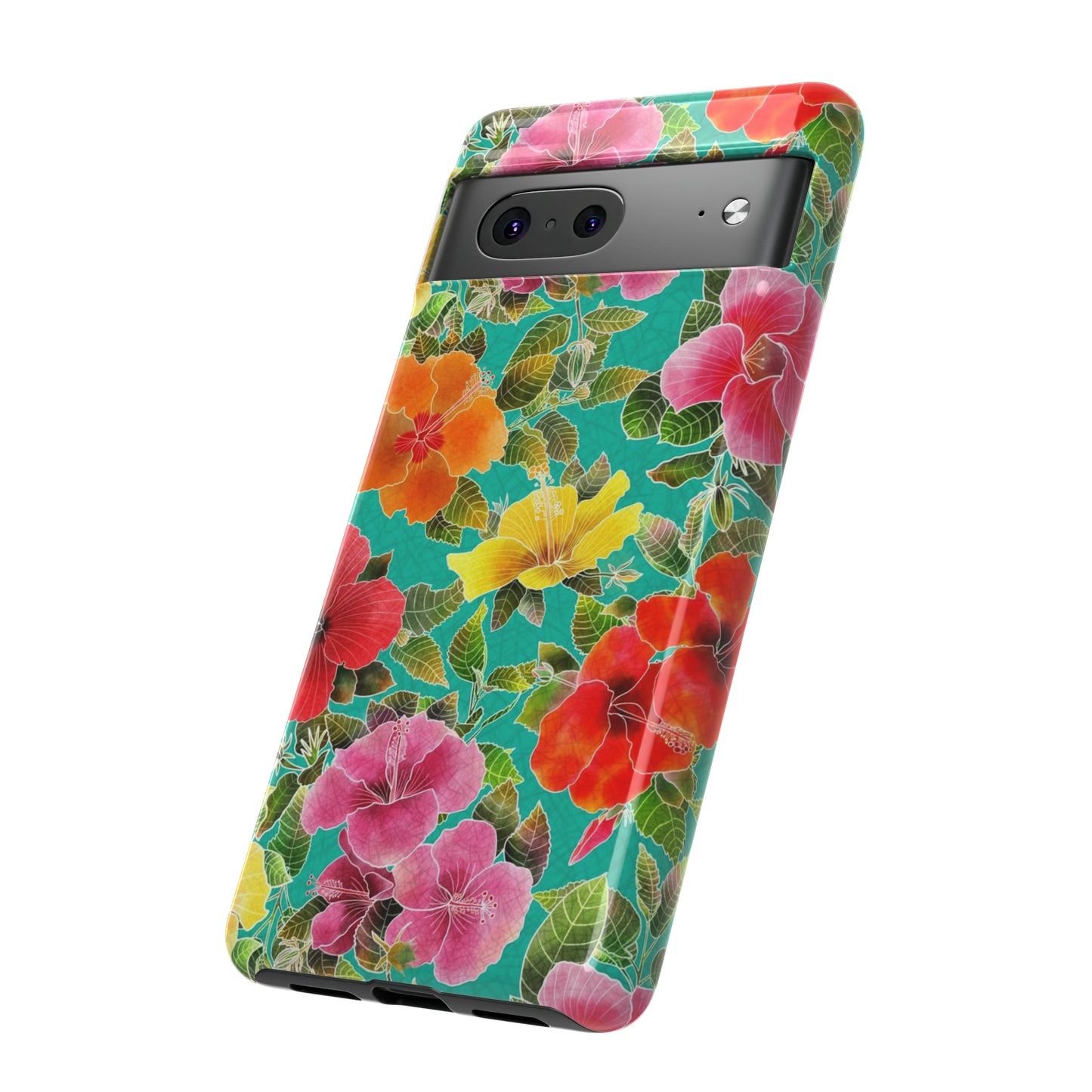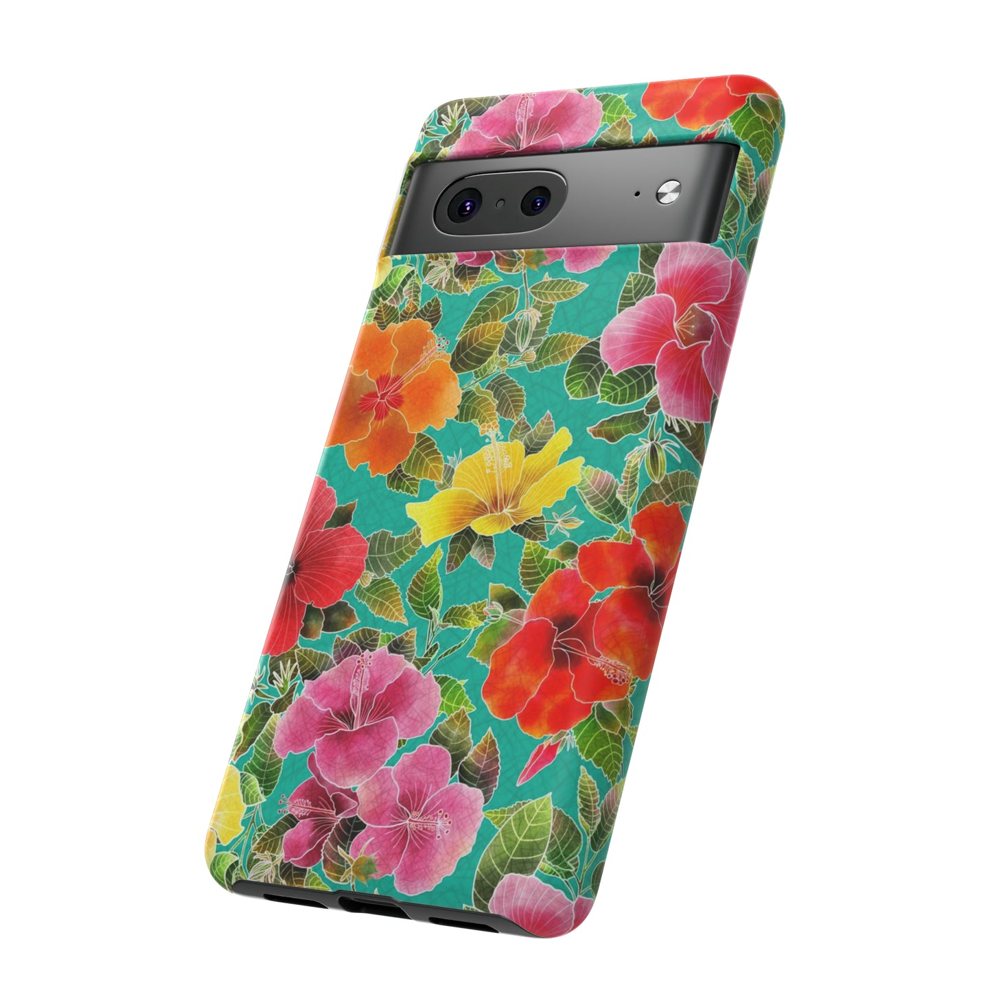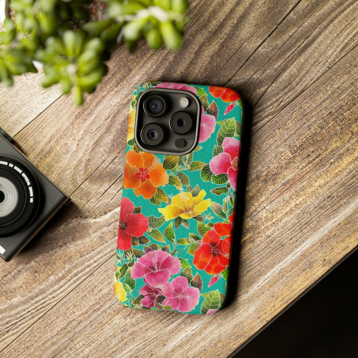 Introducing the Hibiscus Garden tough phone case, designed to keep your phone safe and stylish! This phone case features a beautiful batik-style design with red, yellow, orange, and pink hibiscus flowers painted on a turquoise background. The tough exterior is designed to withstand drops and impact, keeping your phone safe from scratches and cracks.