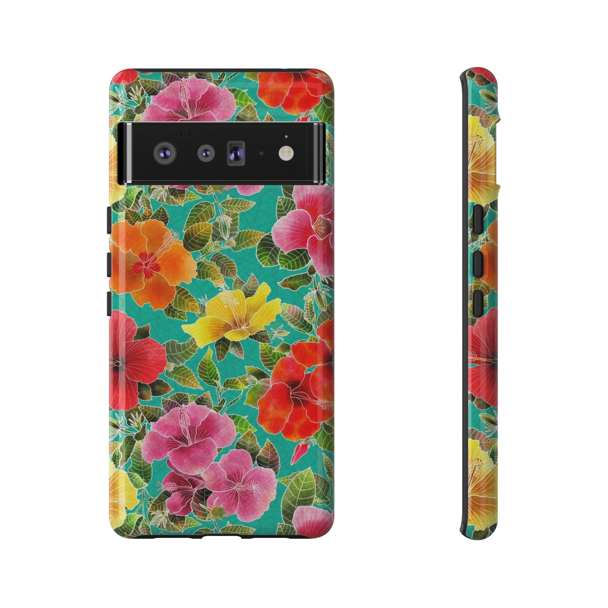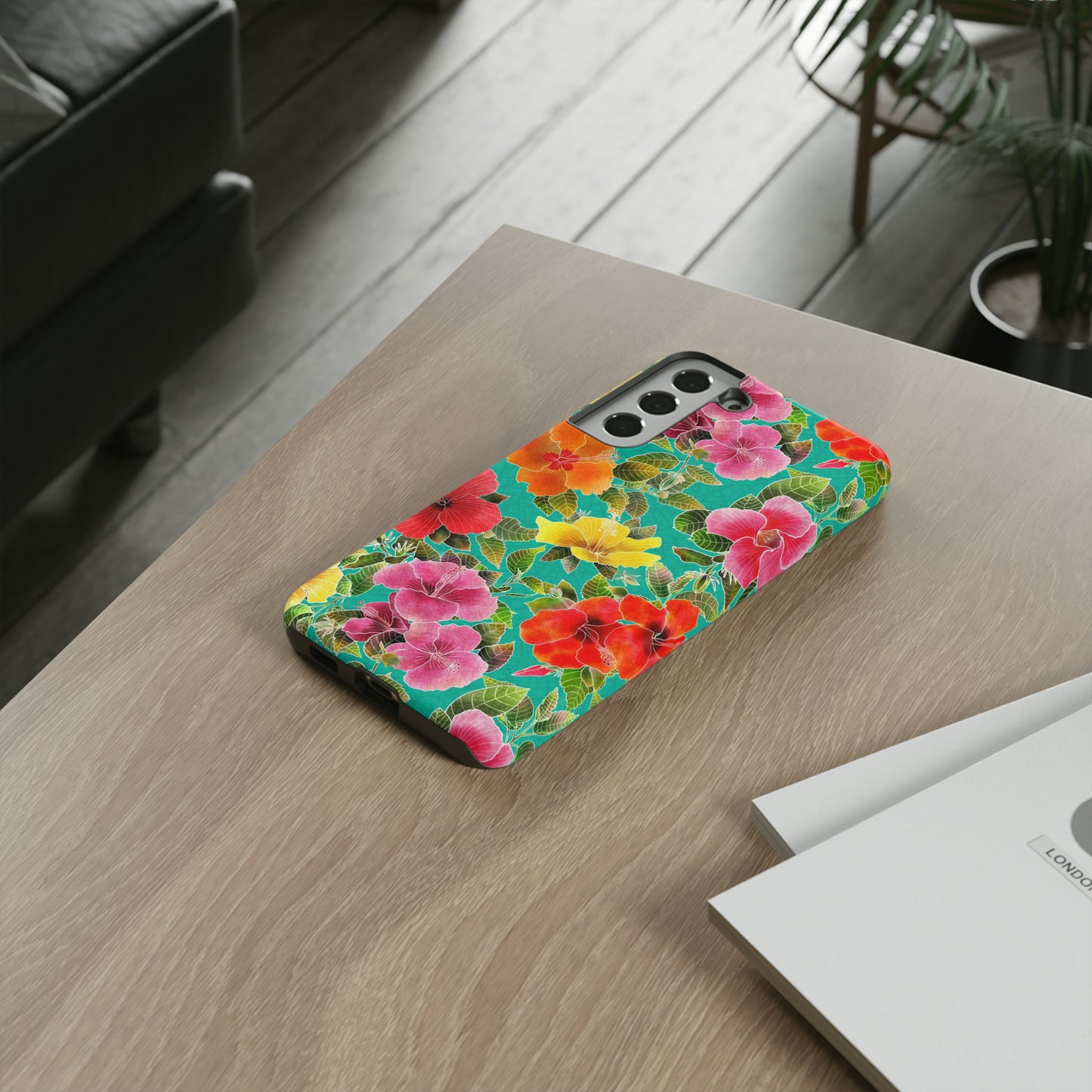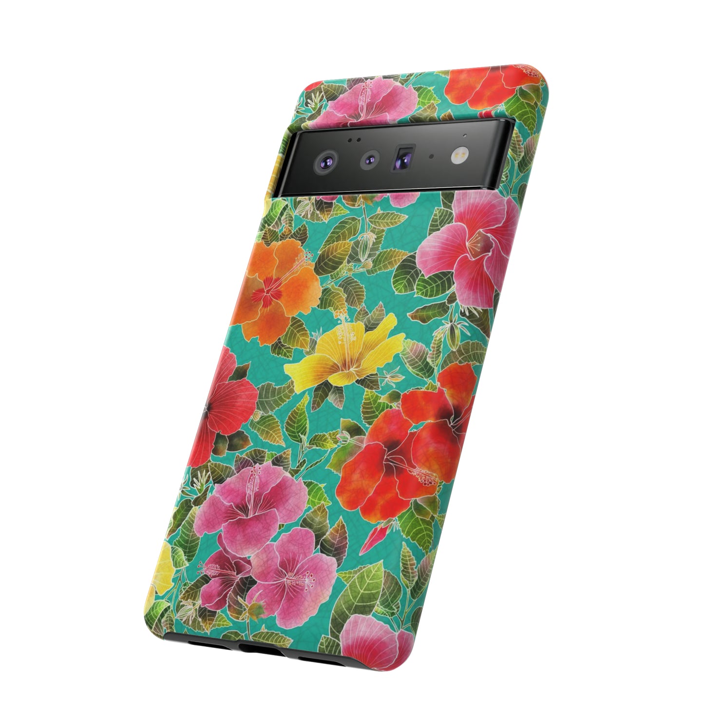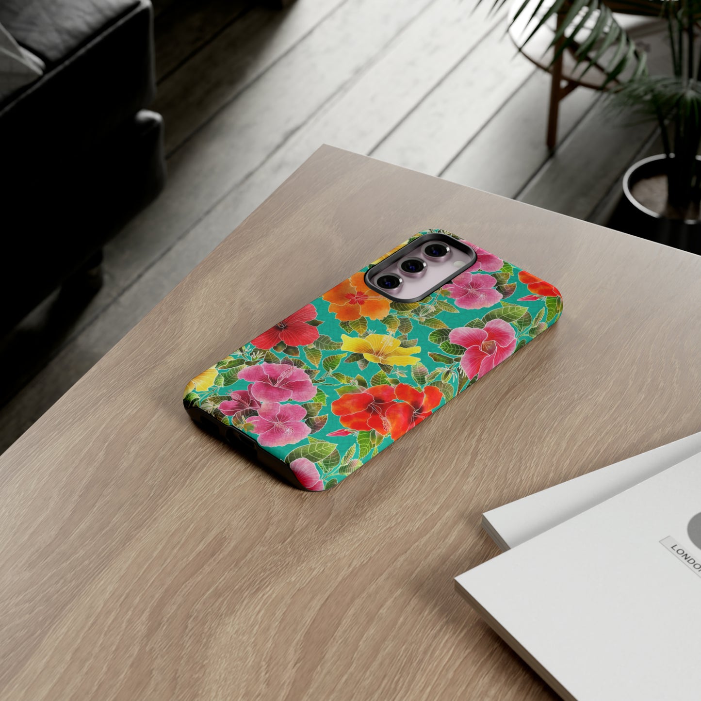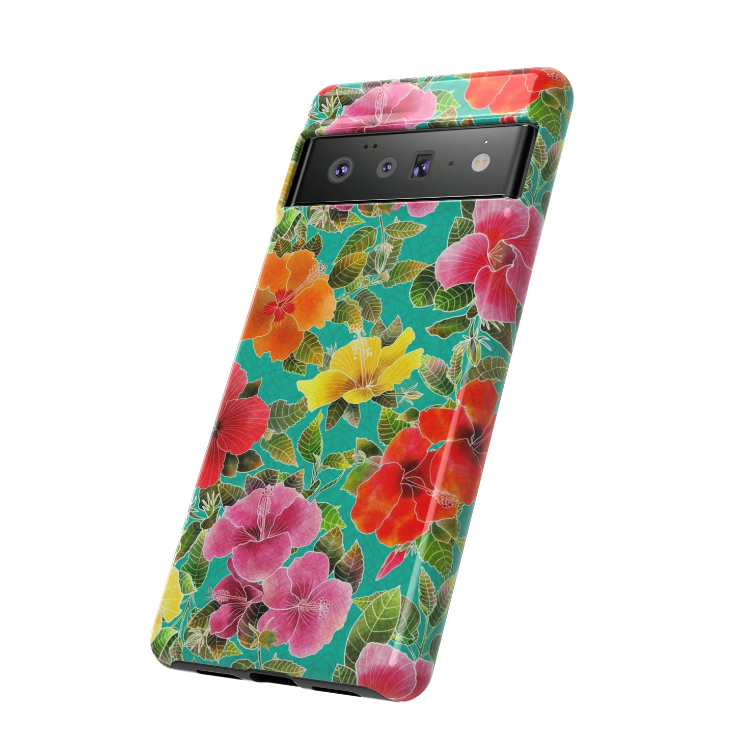 Introducing the Hibiscus Garden tough phone case, designed to keep your phone safe and stylish! This phone case features a beautiful batik-style design with red, yellow, orange, and pink hibiscus flowers painted on a turquoise background. The tough exterior is designed to withstand drops and impact, keeping your phone safe from scratches and cracks.