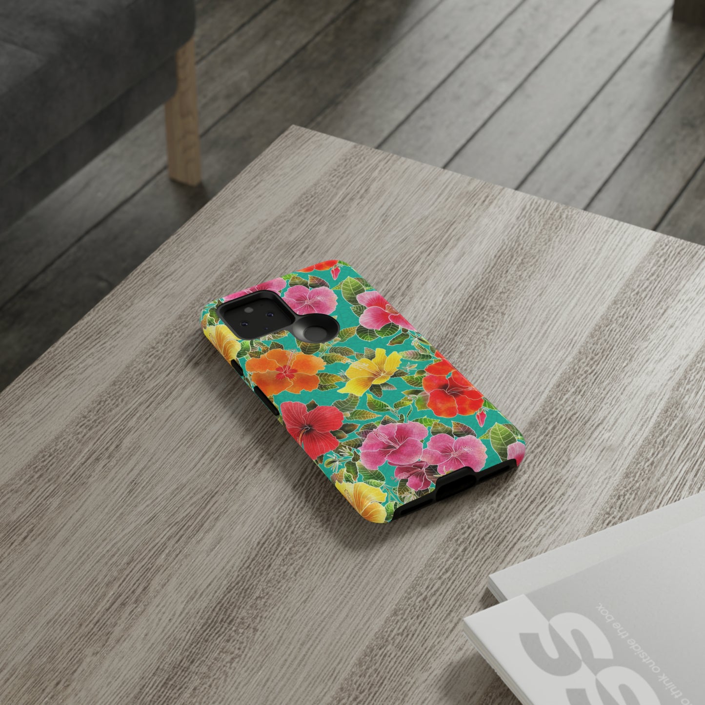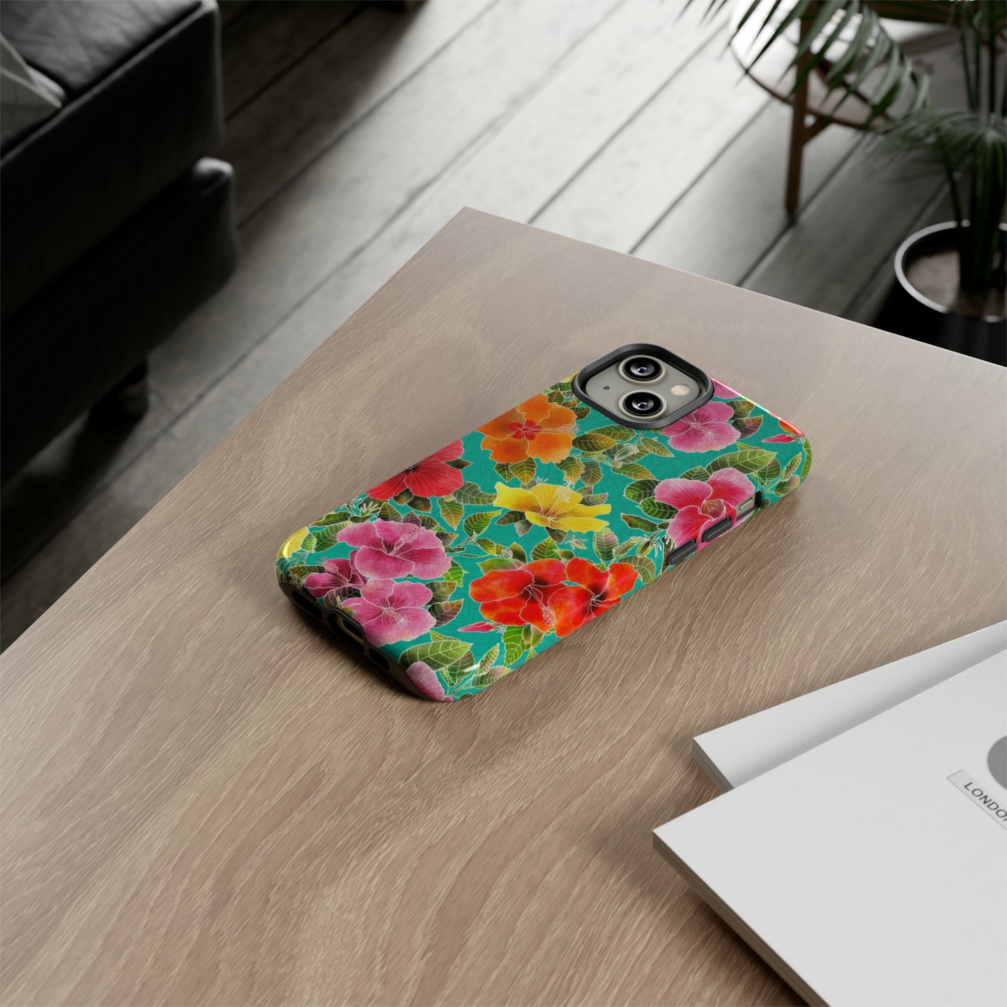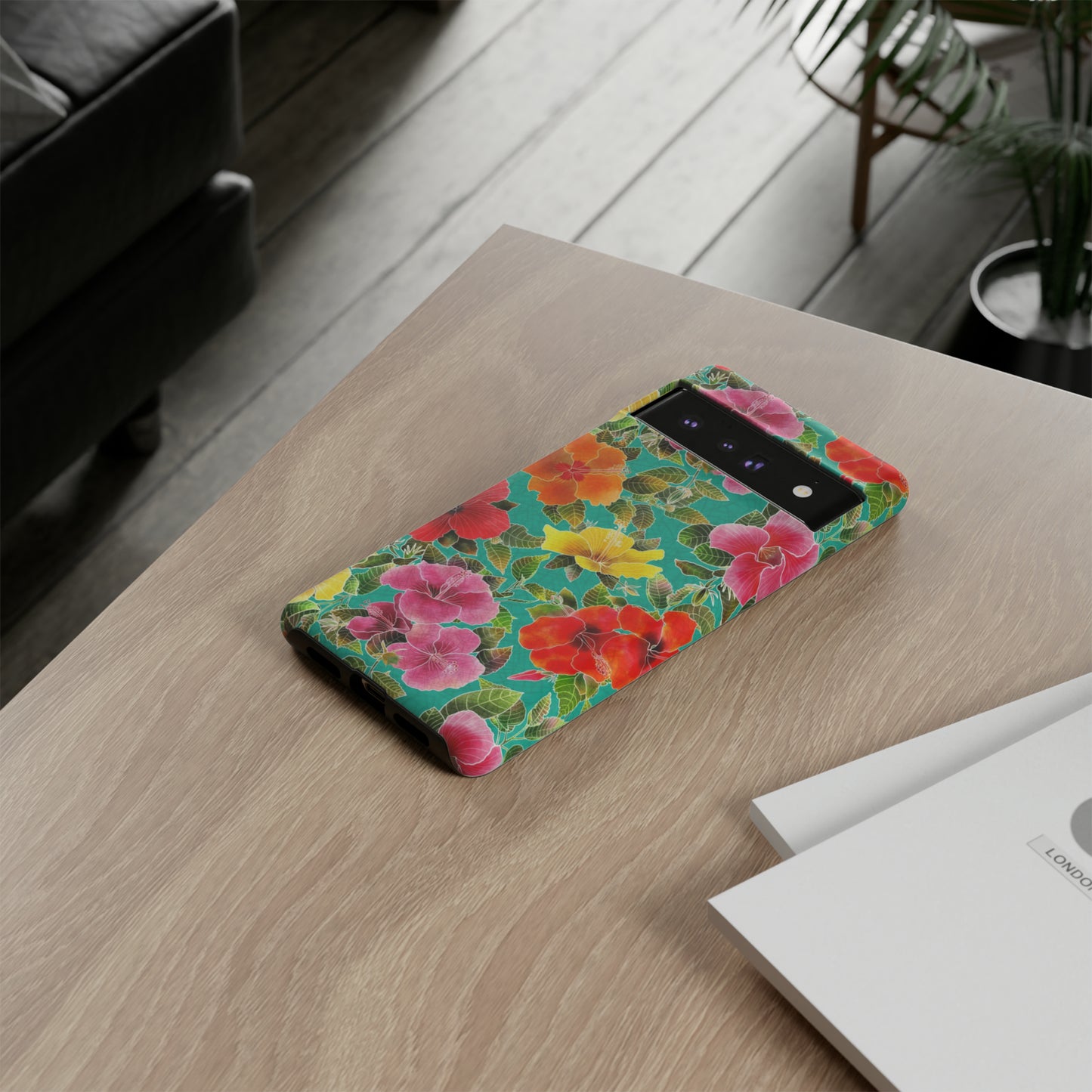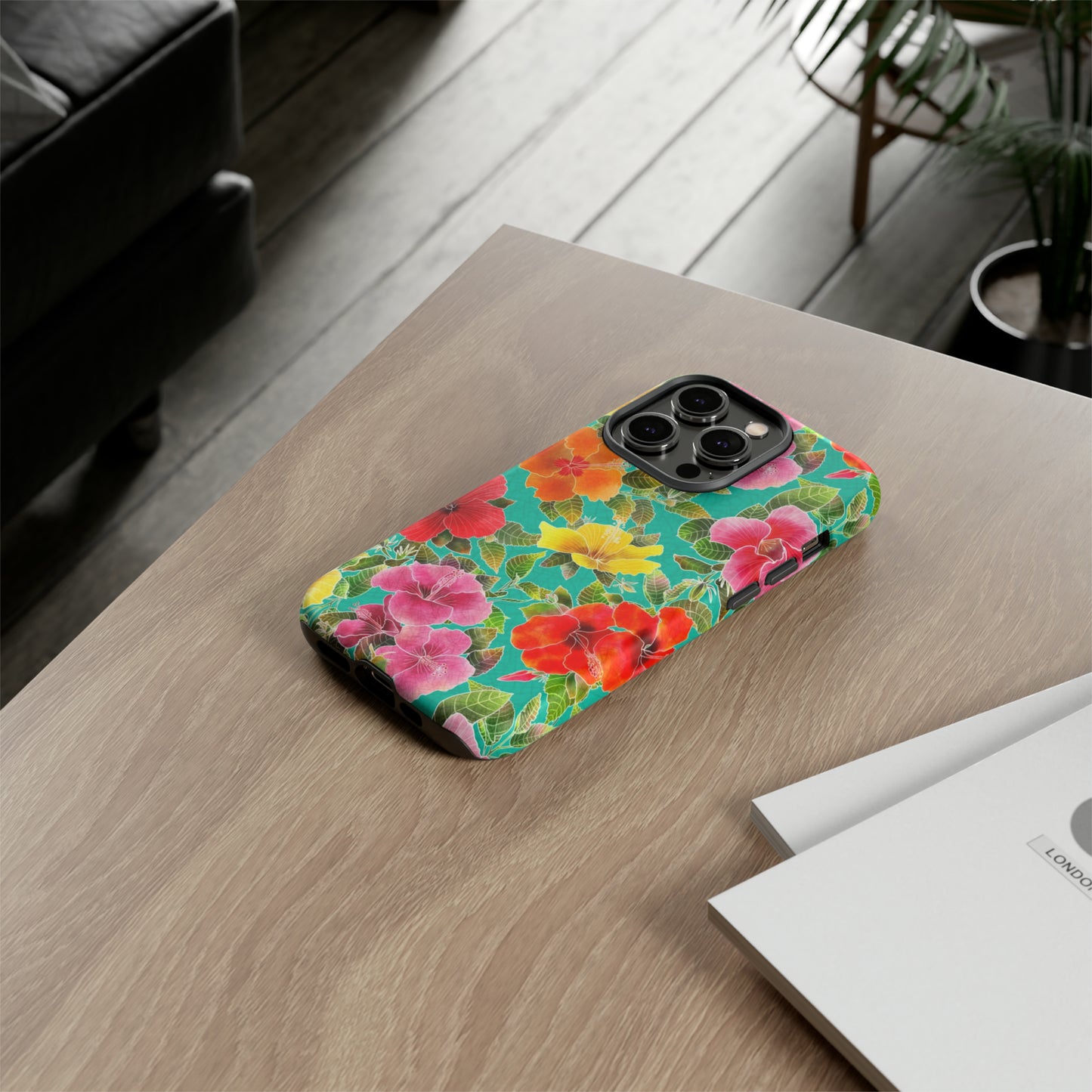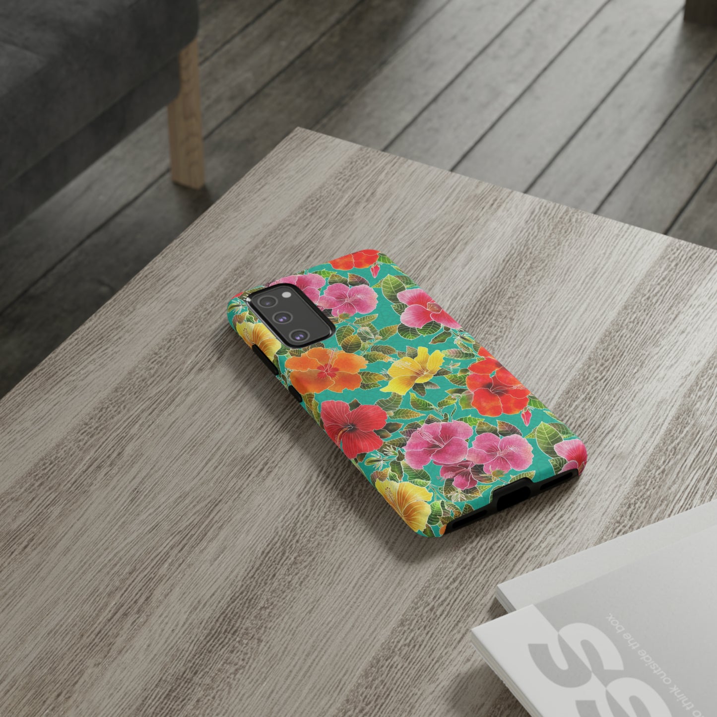 Introducing the Hibiscus Garden tough phone case, designed to keep your phone safe and stylish! This phone case features a beautiful batik-style design with red, yellow, orange, and pink hibiscus flowers painted on a turquoise background. The tough exterior is designed to withstand drops and impact, keeping your phone safe from scratches and cracks.