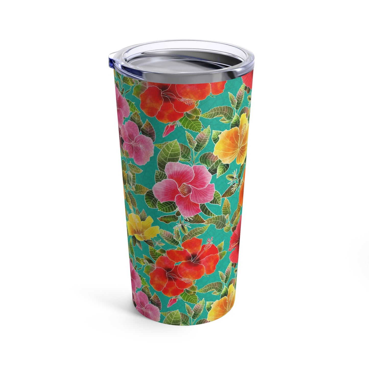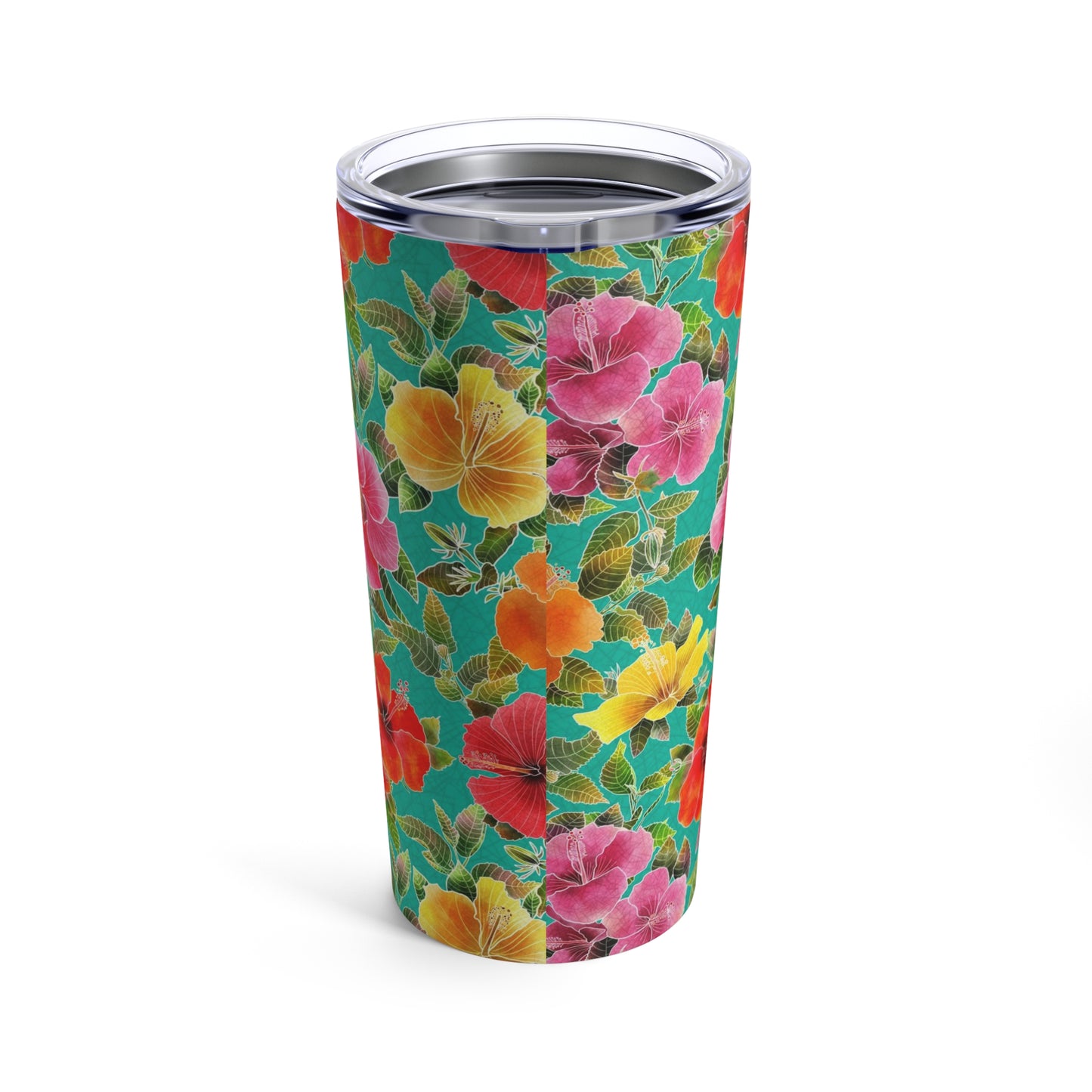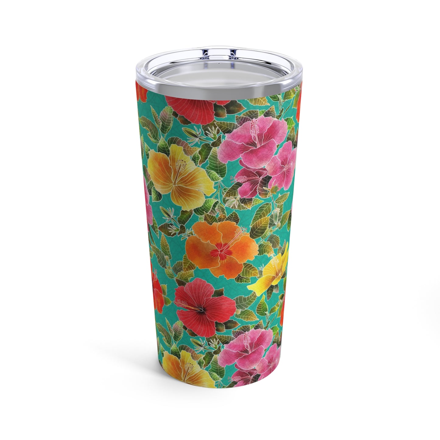 Introducing the 20 oz Hibiscus Garden Tumbler, featuring a stunning batik-style design of red, yellow, orange, and pink hibiscus flowers on a vibrant turquoise background. This tumbler is the perfect accessory for those who appreciate both style and practicality. The double-walled insulation keeps drinks at their desired temperature for hours, while the spill-proof lid ensures that you can enjoy your beverage on the go without any worries.