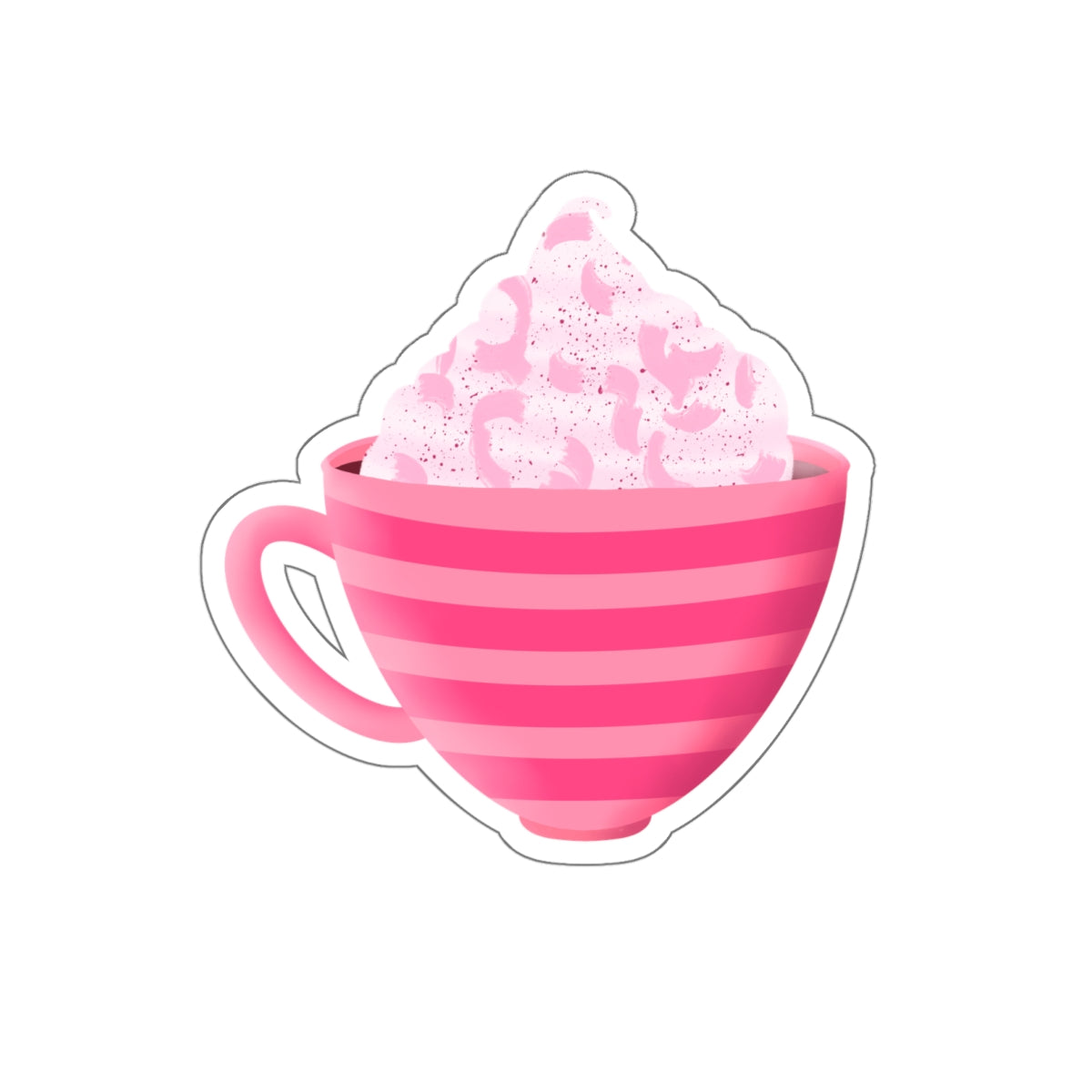 This charming die cut sticker showcases a pink-striped mug brimming with rich, creamy hot chocolate, crowned with a fluffy swirl of whipped cream and delicate pink chocolate shavings. A perfect blend of sweetness and warmth, this design adds a playful, cozy touch to your belongings, making it a must-have for those who love hot cocoa and all things pink.