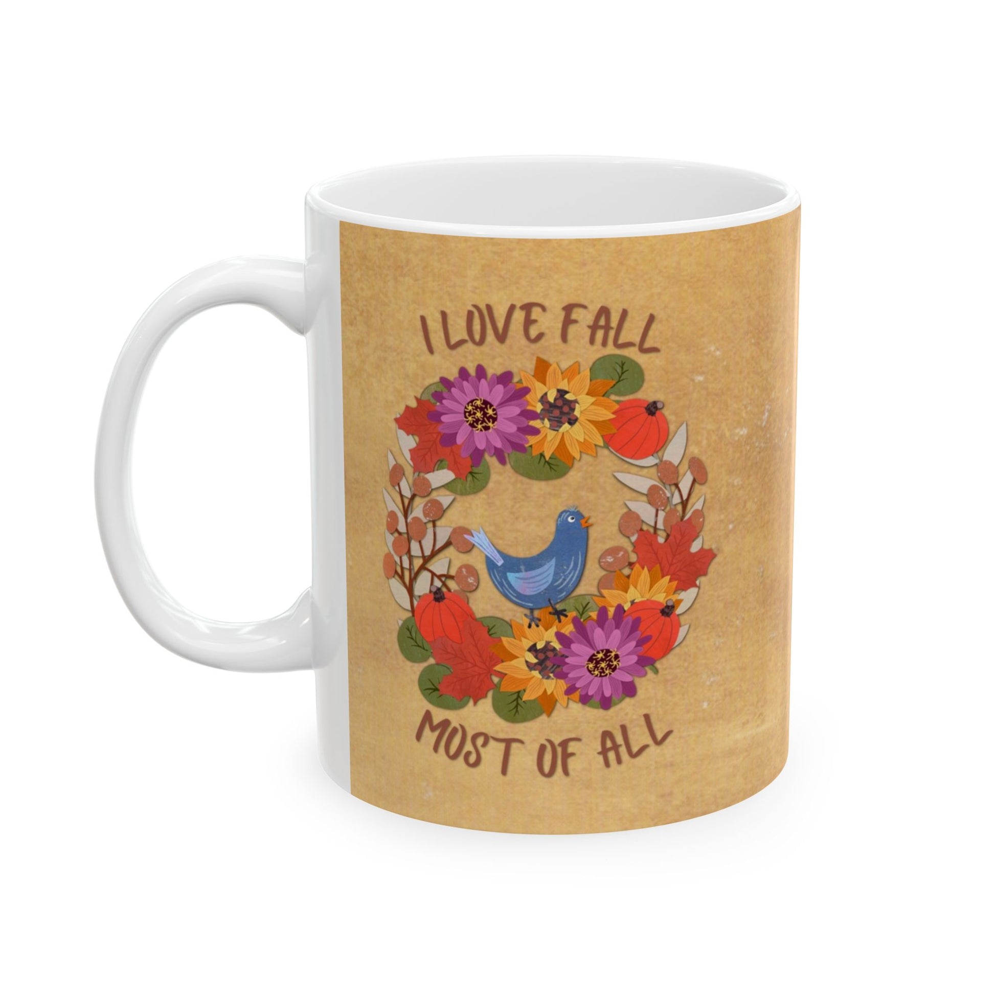 Cozy up this autumn with a warm cup of your favorite drink and this charming ceramic mug featuring my original fall-inspired illustration. The design showcases a detailed autumn wreath made of dried sunflowers, zinnias, eucalyptus, maple leaves, and seed pods, accented with tiny pumpkins for a touch of rustic harvest beauty. A cheerful bluebird perches at the base of the wreath, surrounded by the quote “I love fall most of all” set against a glowing golden yellow textured background.