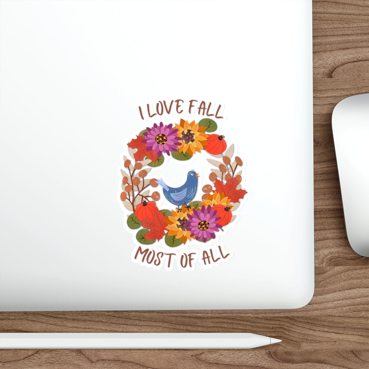 Add a touch of cozy autumn charm to your favorite surfaces with this die-cut sticker featuring my original illustration of a fall wreath filled with dried flowers, leaves, and tiny pumpkins. The wreath includes beautifully detailed sunflowers, zinnias, eucalyptus, maple leaves, and seed pods, all arranged in warm, rustic tones that capture the beauty of the season. At the bottom center, a cheerful bluebird perches happily among the leaves. The quote “I love fall most of all” rests at the heart of the design, set on a glowing golden yellow textured background that radiates warmth.