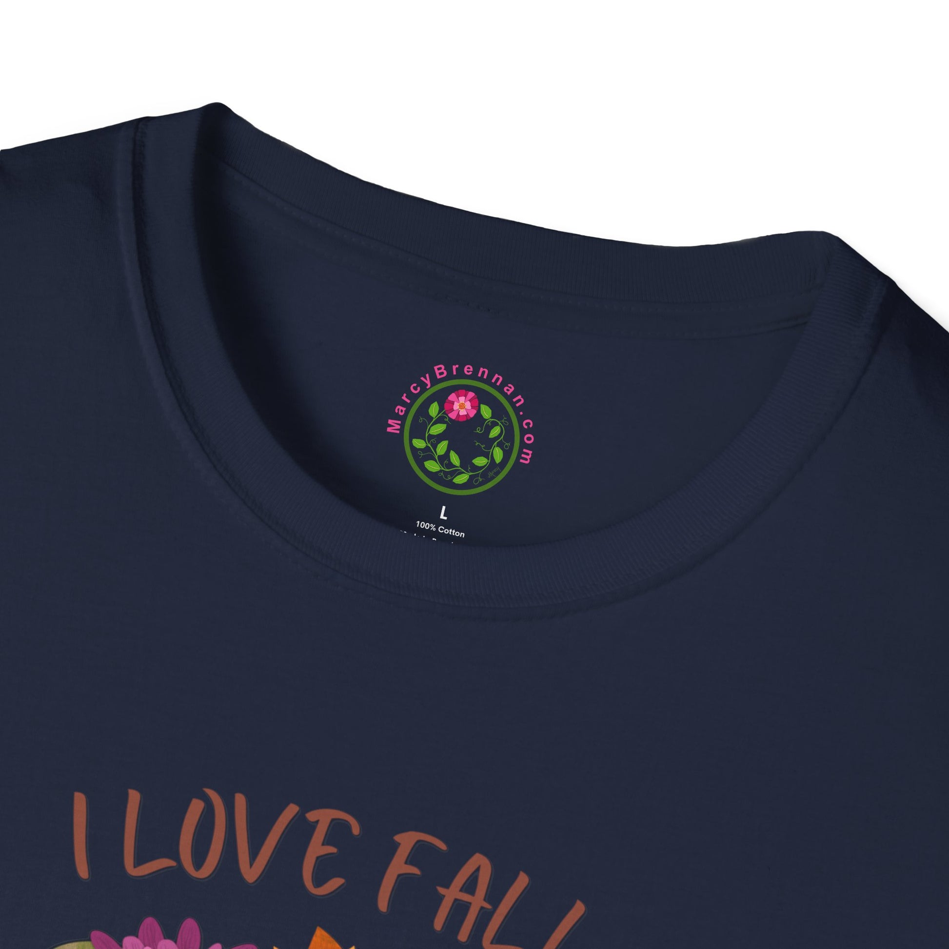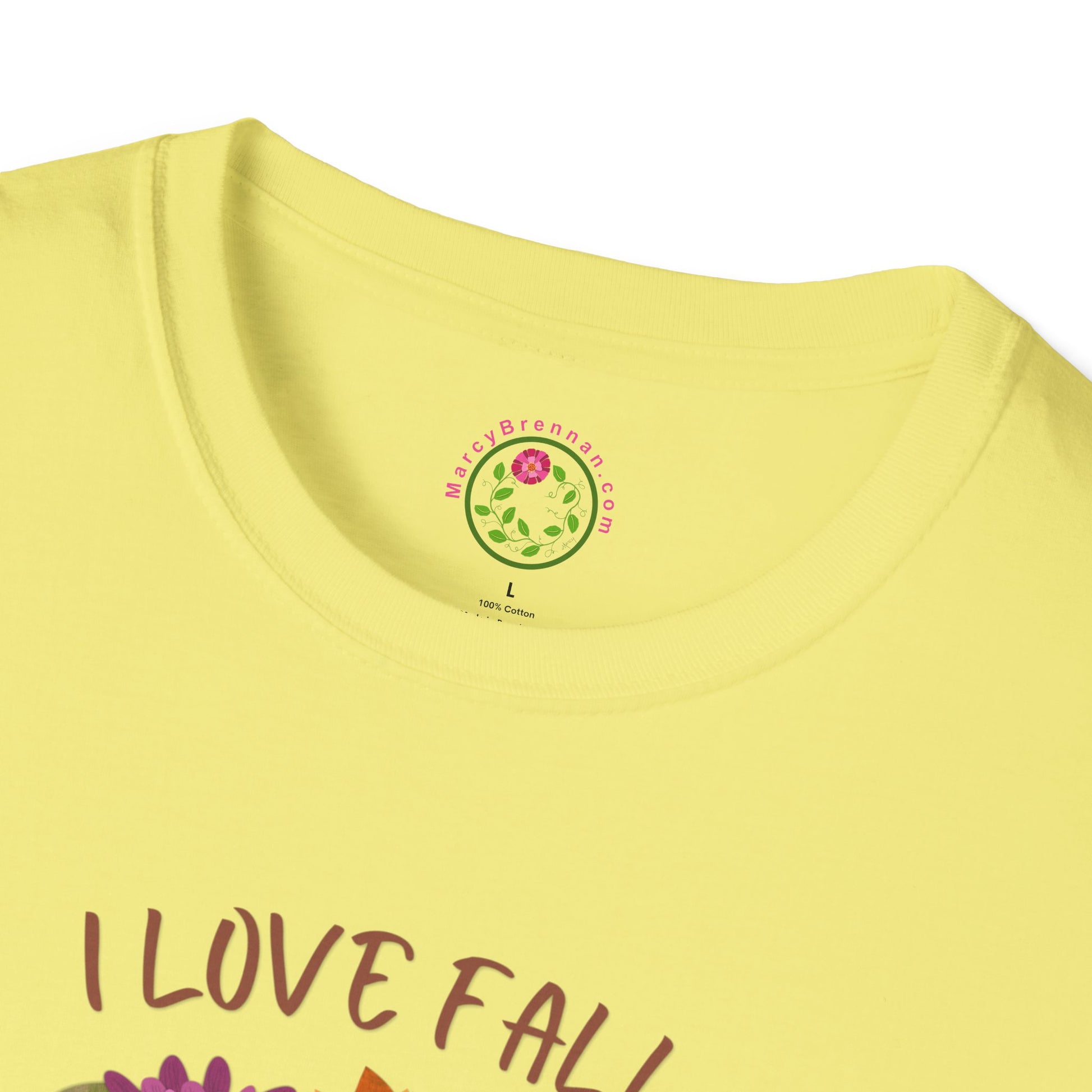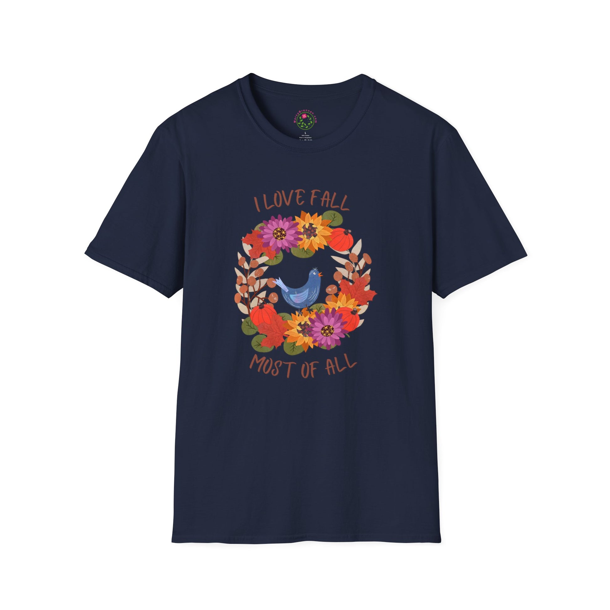 Celebrate cozy autumn days in comfort and style with this softstyle t-shirt featuring an original fall-inspired illustration. The design showcases a beautifully detailed autumn wreath filled with dried sunflowers, zinnias, eucalyptus, maple leaves, and seed pods — accented with little pumpkins for a rustic harvest touch. A cheerful bluebird perches at the bottom center, adding a sweet, seasonal charm. The quote “I love fall most of all” rests at the heart of the design, surrounded by the warmth of a golden yellow textured background.