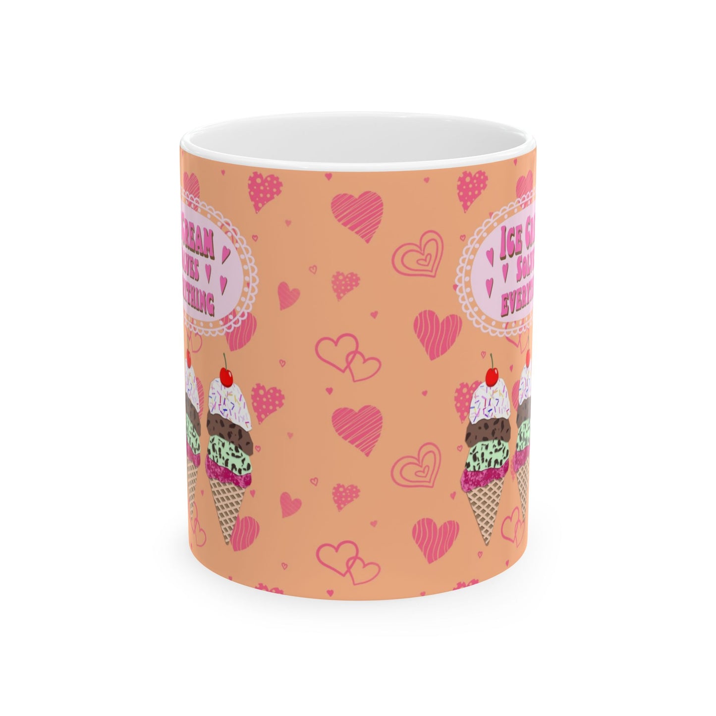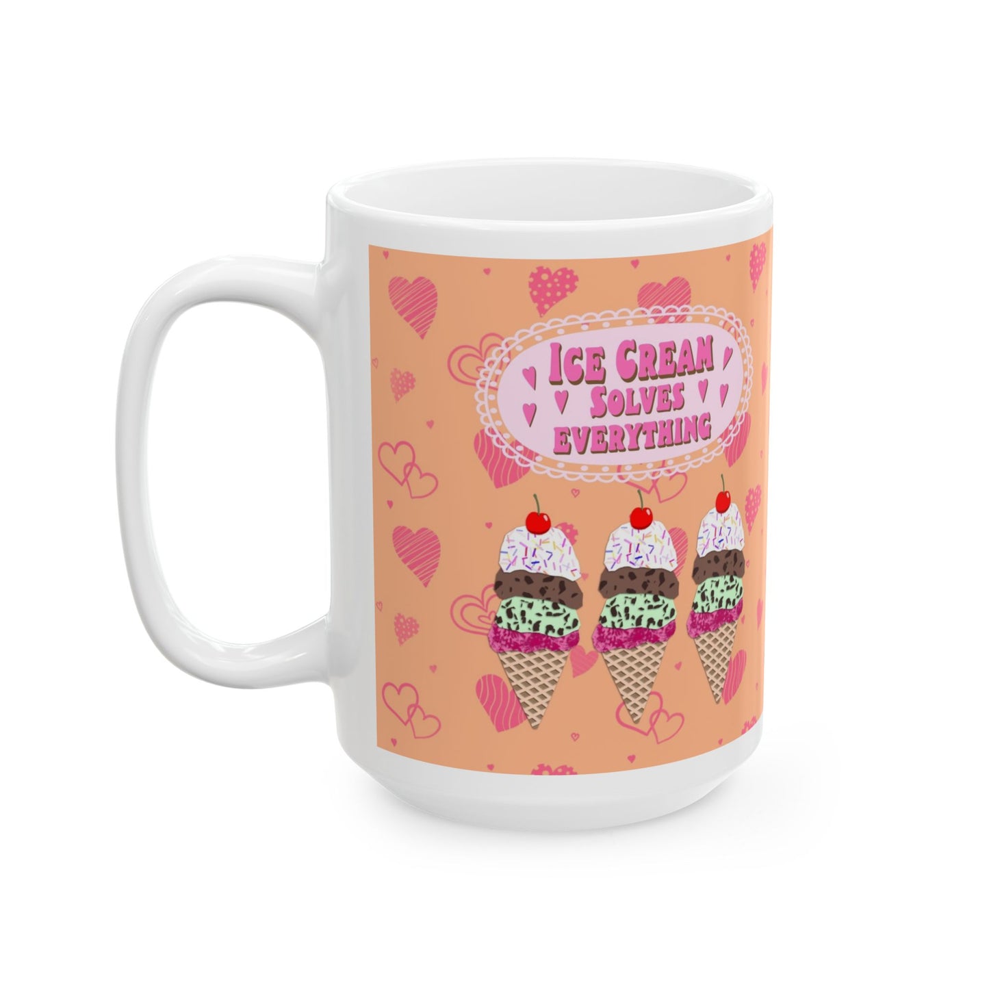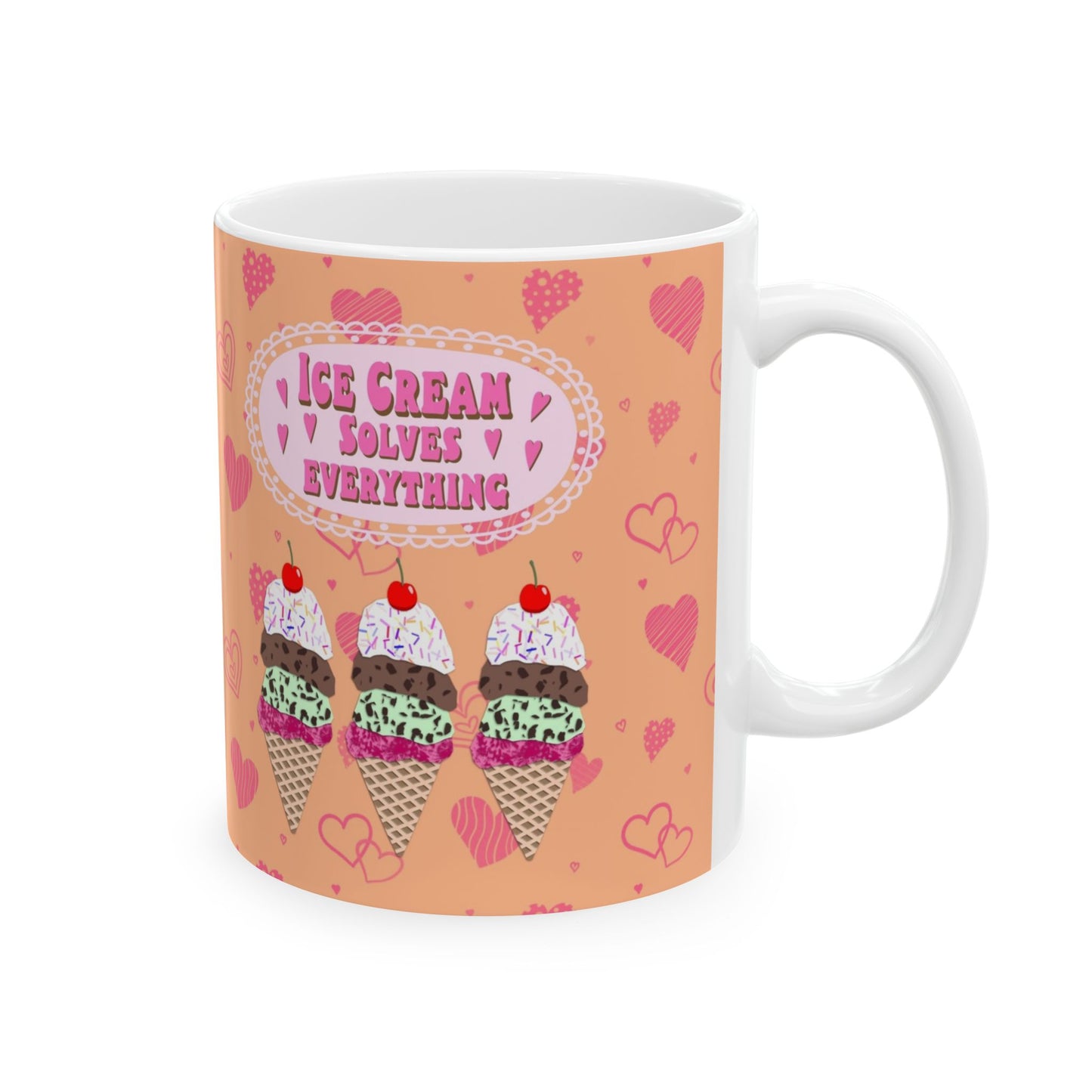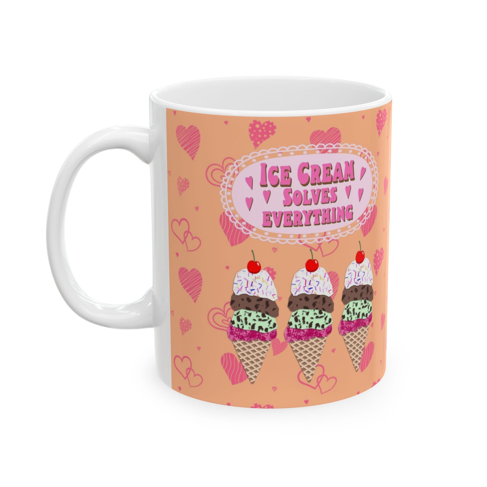 Start your day with a scoop of joy! This ceramic mug features my Ice Cream Solves Everything collage design—an irresistible digital cut paper style illustration that’s as cheerful as your favorite frozen treat. The design includes three colorful ice cream cones—strawberry, chocolate chip mint, and chocolate—each piled high with whipped cream, rainbow sprinkles, and a cherry on top. The uplifting quote shines in hot pink bubble lettering, framed by a sweet pale pink scalloped edge. All of this happiness is set against a bold orange background sprinkled with playful hot pink hearts in all shapes and sizes. Available in both 11 oz and 15 oz sizes, this mug is perfect for coffee, tea, hot cocoa, or a scoop of something sweet.