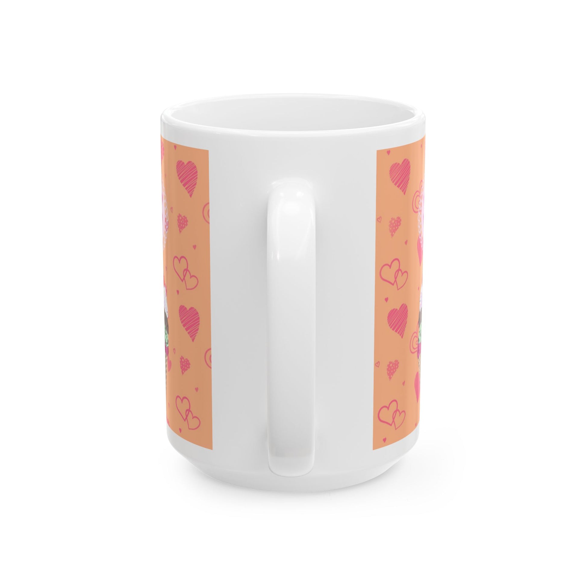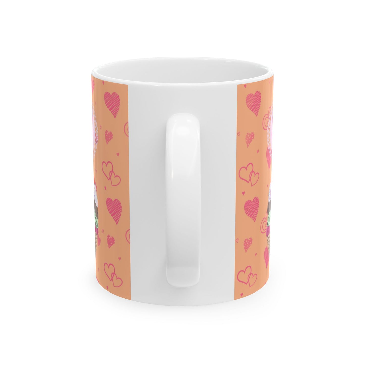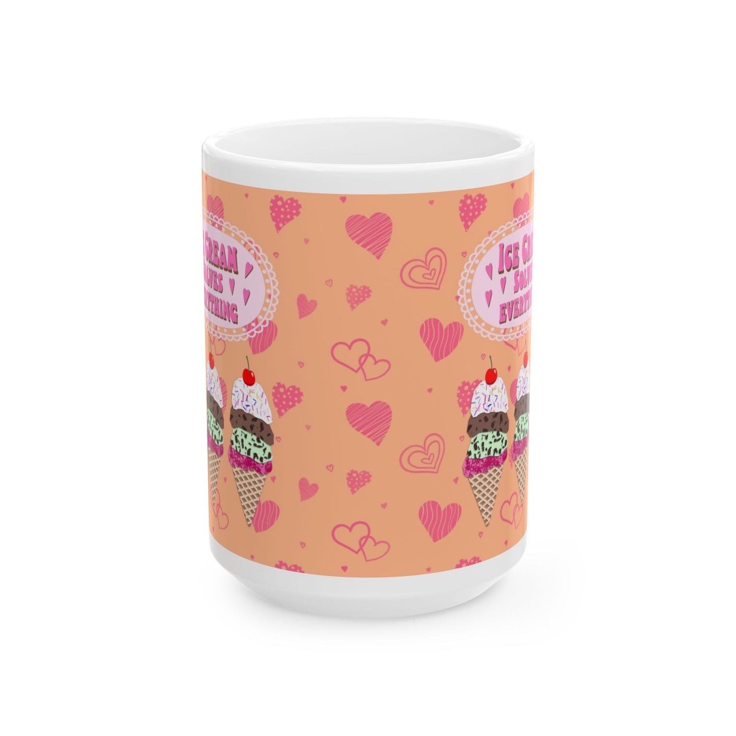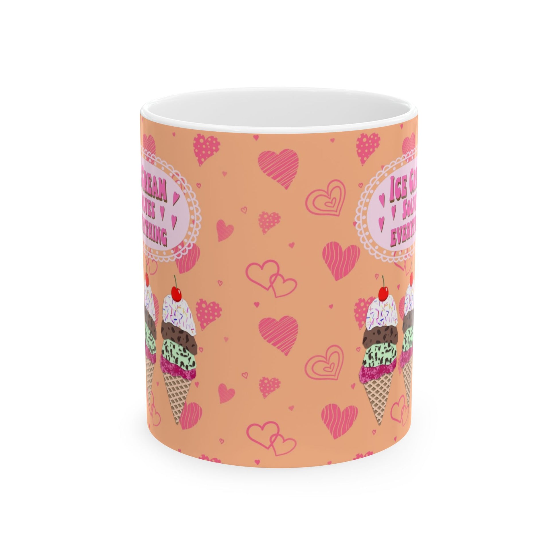 Start your day with a scoop of joy! This ceramic mug features my Ice Cream Solves Everything collage design—an irresistible digital cut paper style illustration that’s as cheerful as your favorite frozen treat. The design includes three colorful ice cream cones—strawberry, chocolate chip mint, and chocolate—each piled high with whipped cream, rainbow sprinkles, and a cherry on top. The uplifting quote shines in hot pink bubble lettering, framed by a sweet pale pink scalloped edge. All of this happiness is set against a bold orange background sprinkled with playful hot pink hearts in all shapes and sizes. Available in both 11 oz and 15 oz sizes, this mug is perfect for coffee, tea, hot cocoa, or a scoop of something sweet.