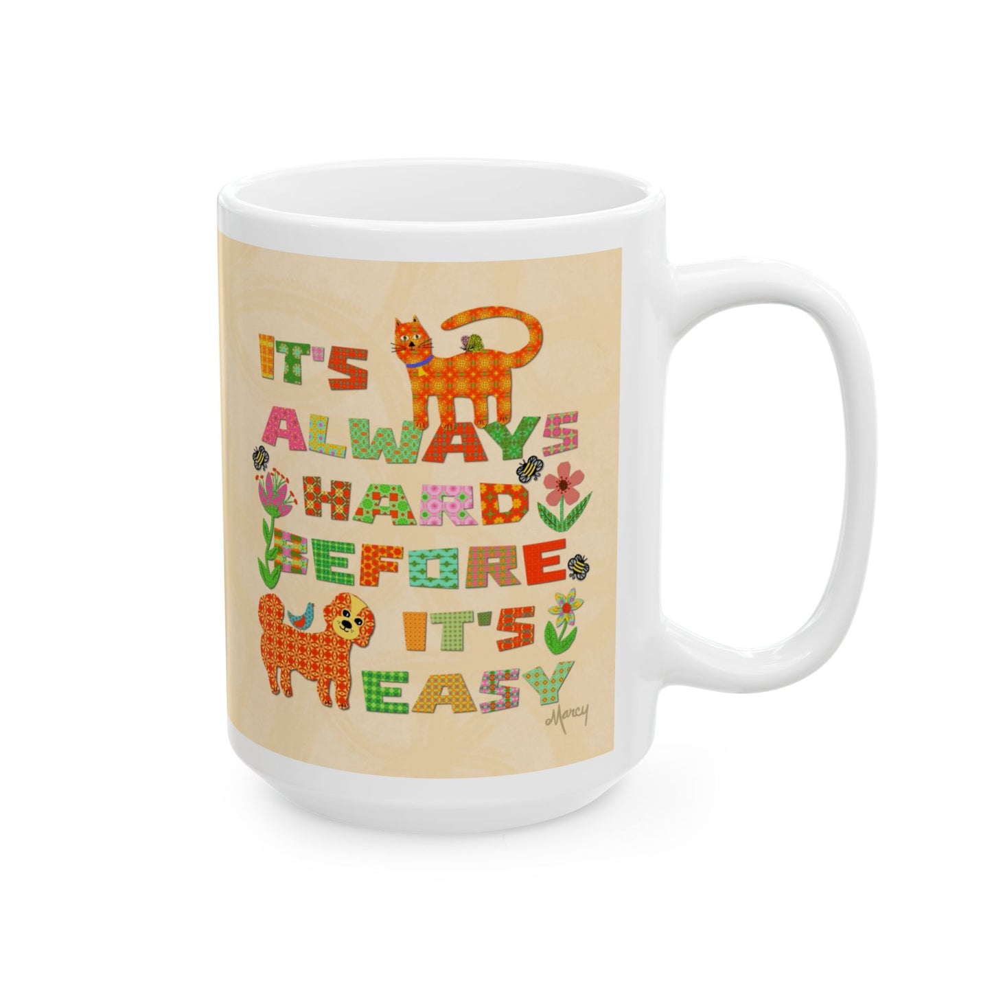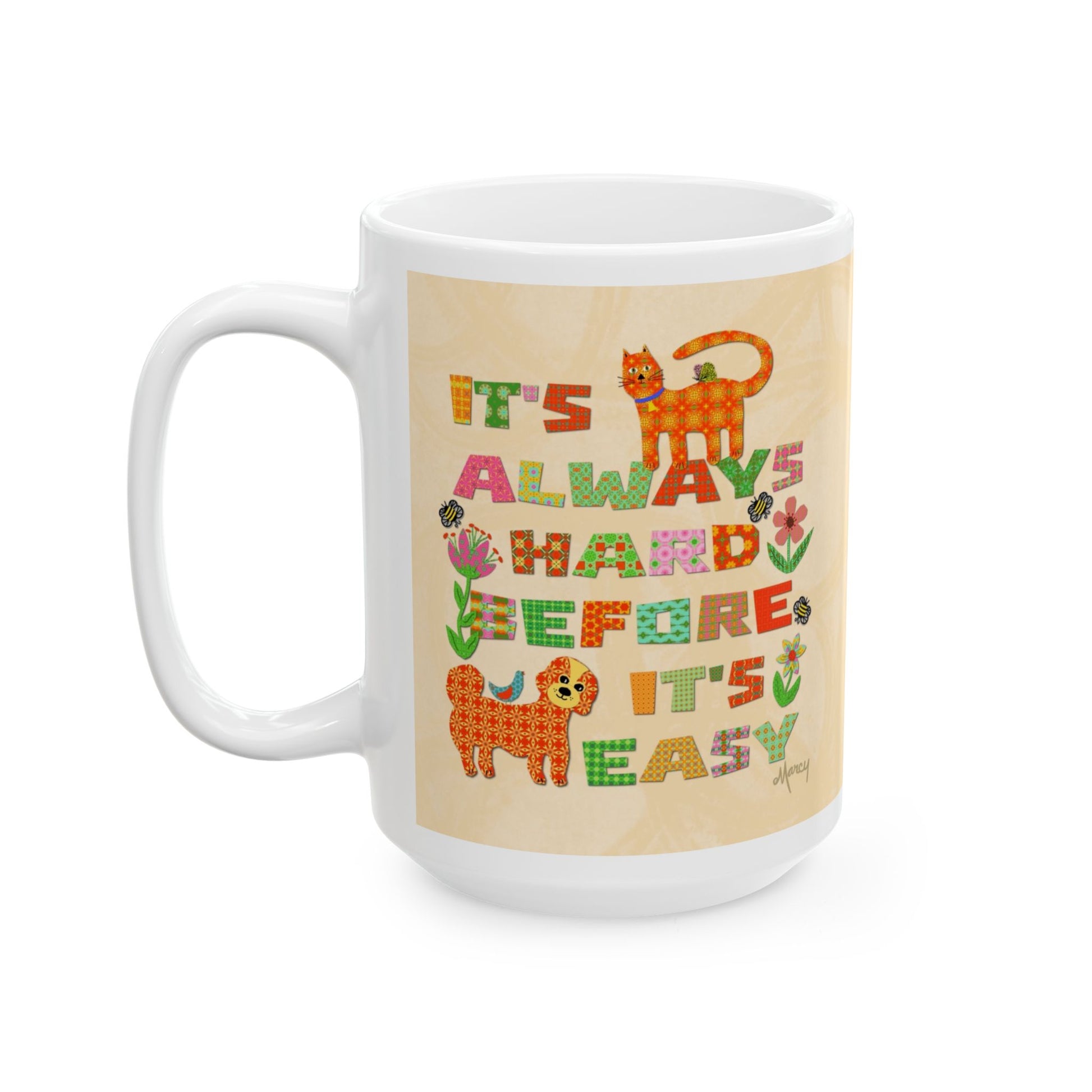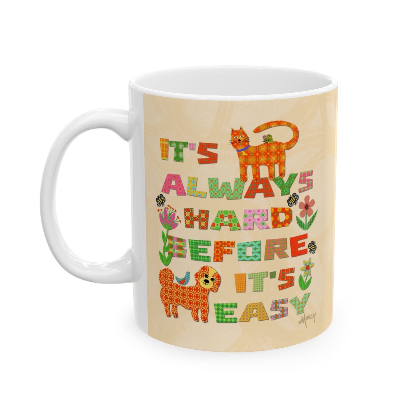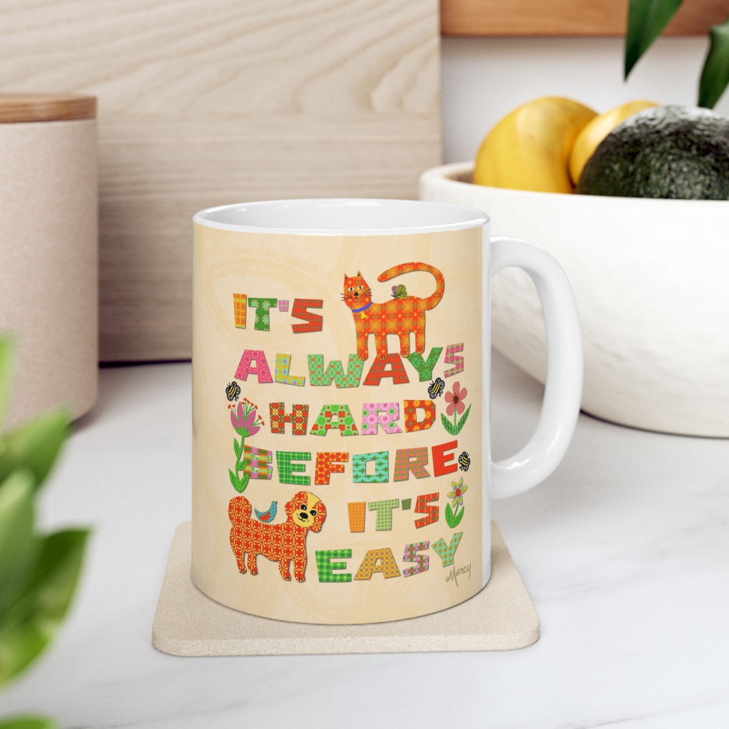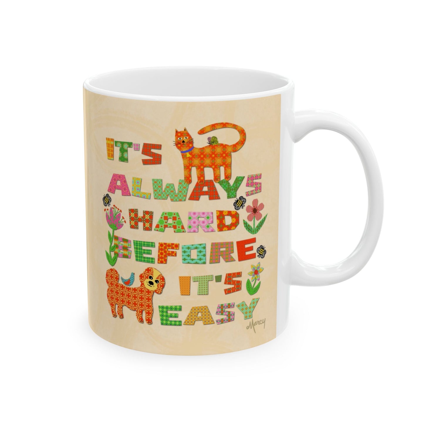 Start your day with a sip of encouragement and a touch of whimsy. This ceramic mug features the uplifting collage quote, “It’s Always Hard Before It’s Easy,” where each letter boasts its own vibrant color and textured pattern. A playful cat with a butterfly, a lovable Maltipoo dog with a bird on its back, and three blooming flowers visited by bumblebees bring charm and warmth to the scene. Set against a softly textured cream background, this mug is perfect for your morning coffee, afternoon tea, or a cozy evening unwind. Available in both 11 oz and 15 oz sizes, it’s a heartfelt reminder that growth takes time—but beauty is always brewing.