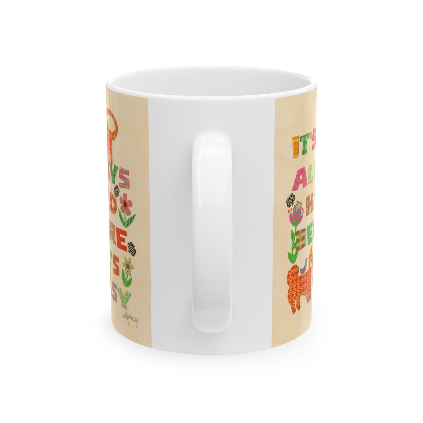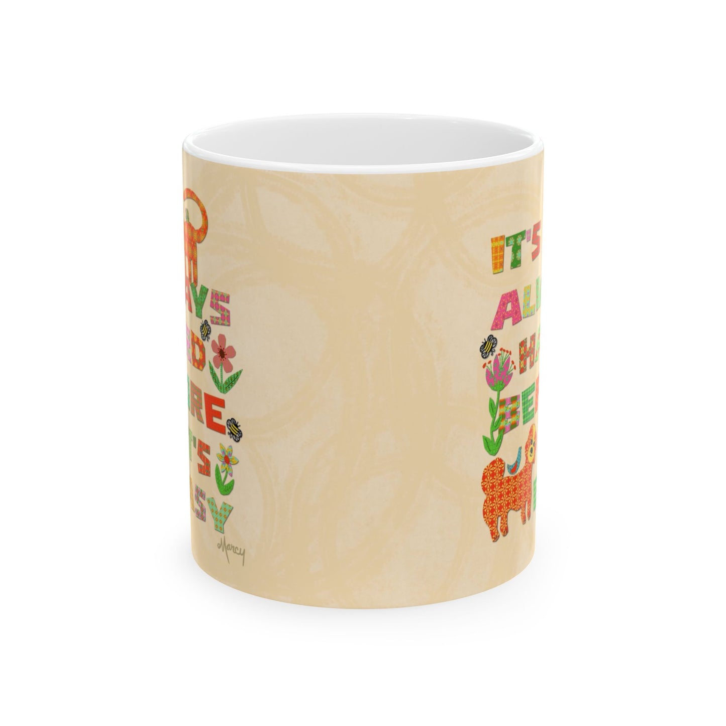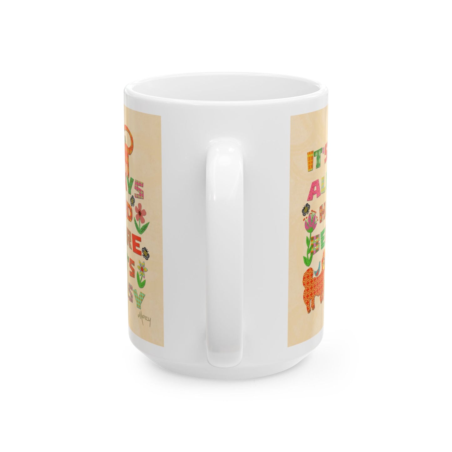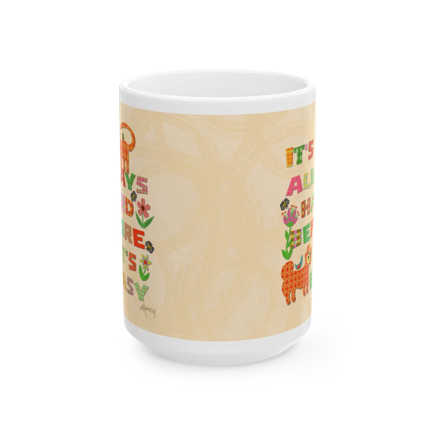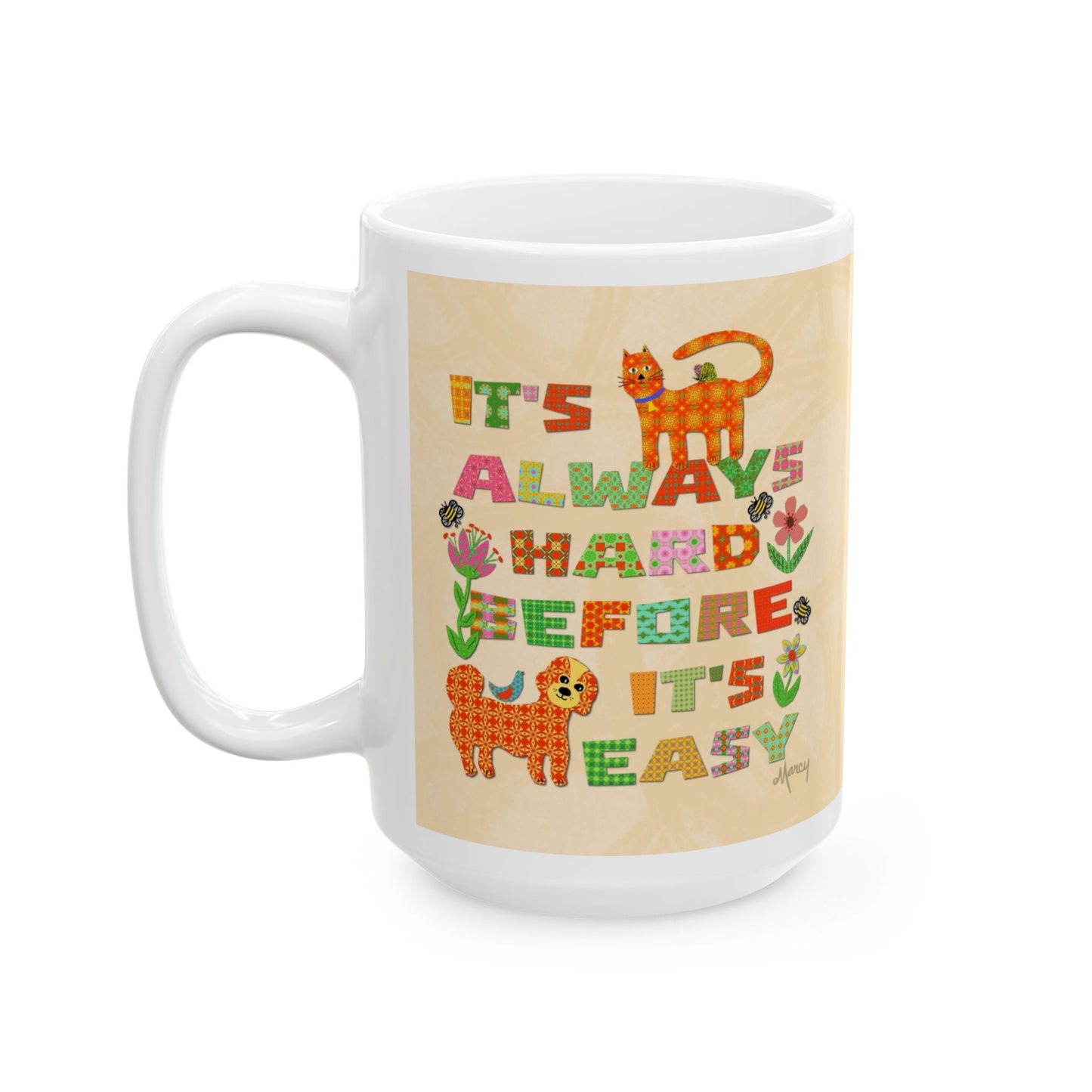 Start your day with a sip of encouragement and a touch of whimsy. This ceramic mug features the uplifting collage quote, “It’s Always Hard Before It’s Easy,” where each letter boasts its own vibrant color and textured pattern. A playful cat with a butterfly, a lovable Maltipoo dog with a bird on its back, and three blooming flowers visited by bumblebees bring charm and warmth to the scene. Set against a softly textured cream background, this mug is perfect for your morning coffee, afternoon tea, or a cozy evening unwind. Available in both 11 oz and 15 oz sizes, it’s a heartfelt reminder that growth takes time—but beauty is always brewing.
