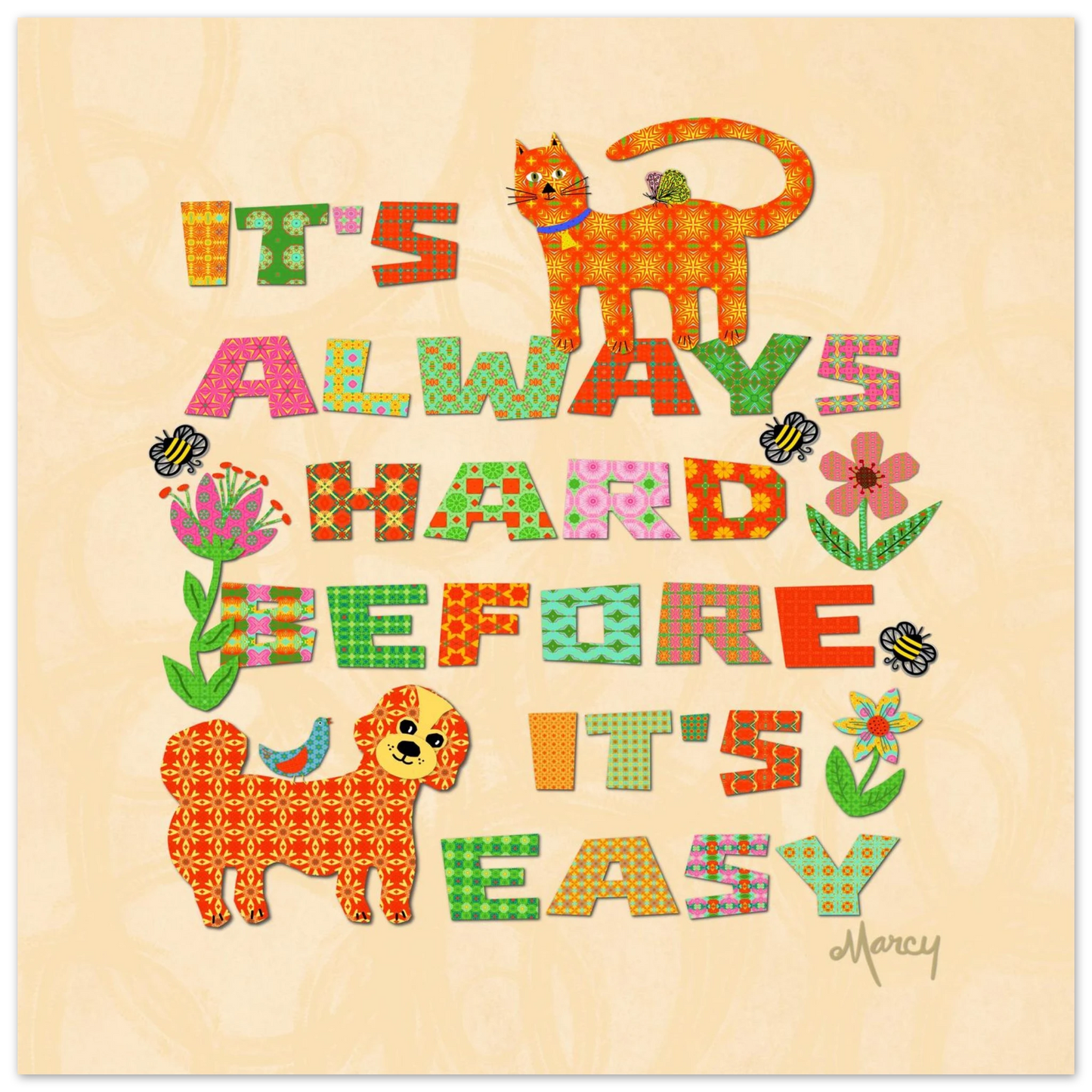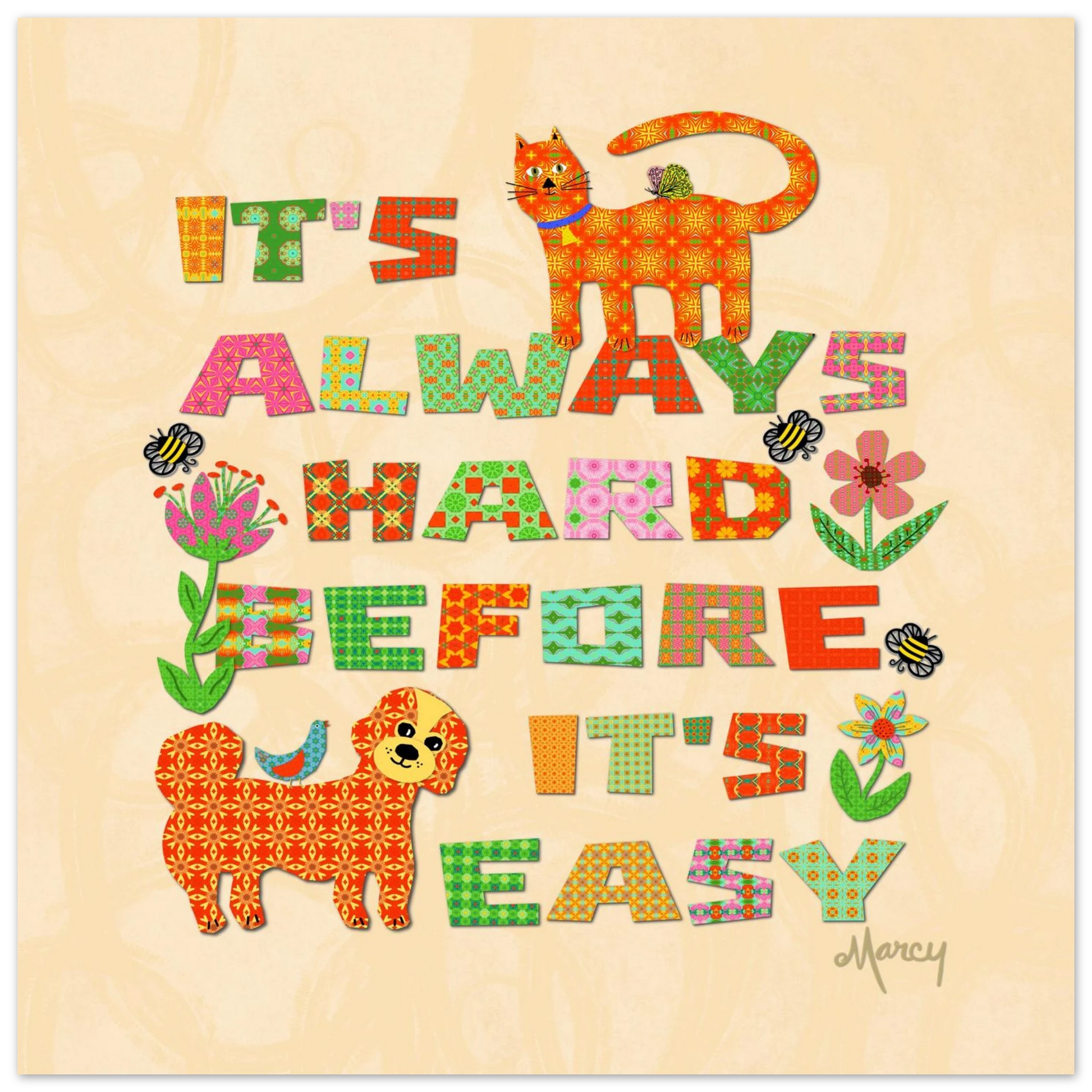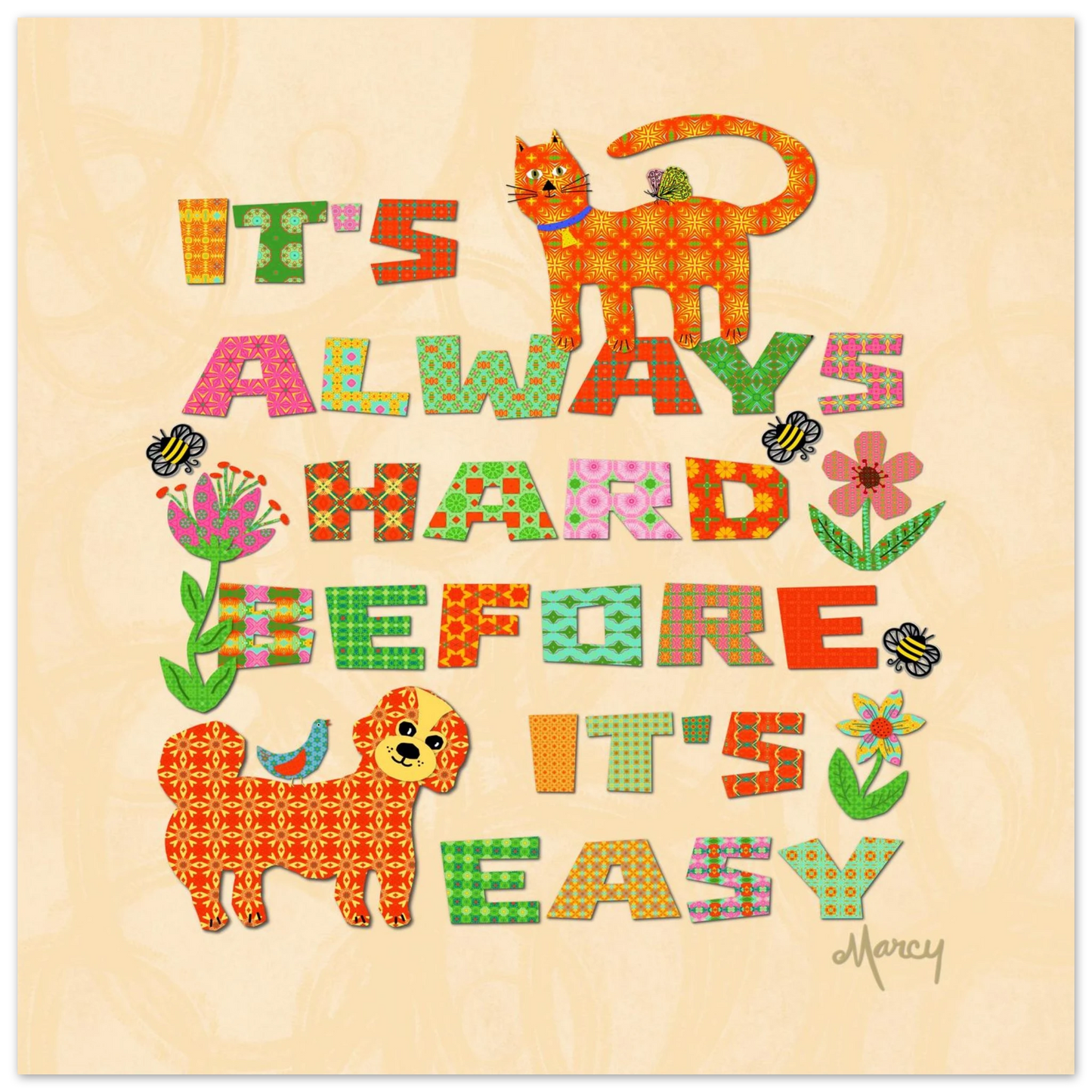 Add an uplifting touch of whimsy to your space with this premium matte paper poster of “It’s Always Hard Before It’s Easy.” This charming collage illustration features each letter of the motivational quote rendered in a variety of colorful, textured patterns that radiate warmth and encouragement.