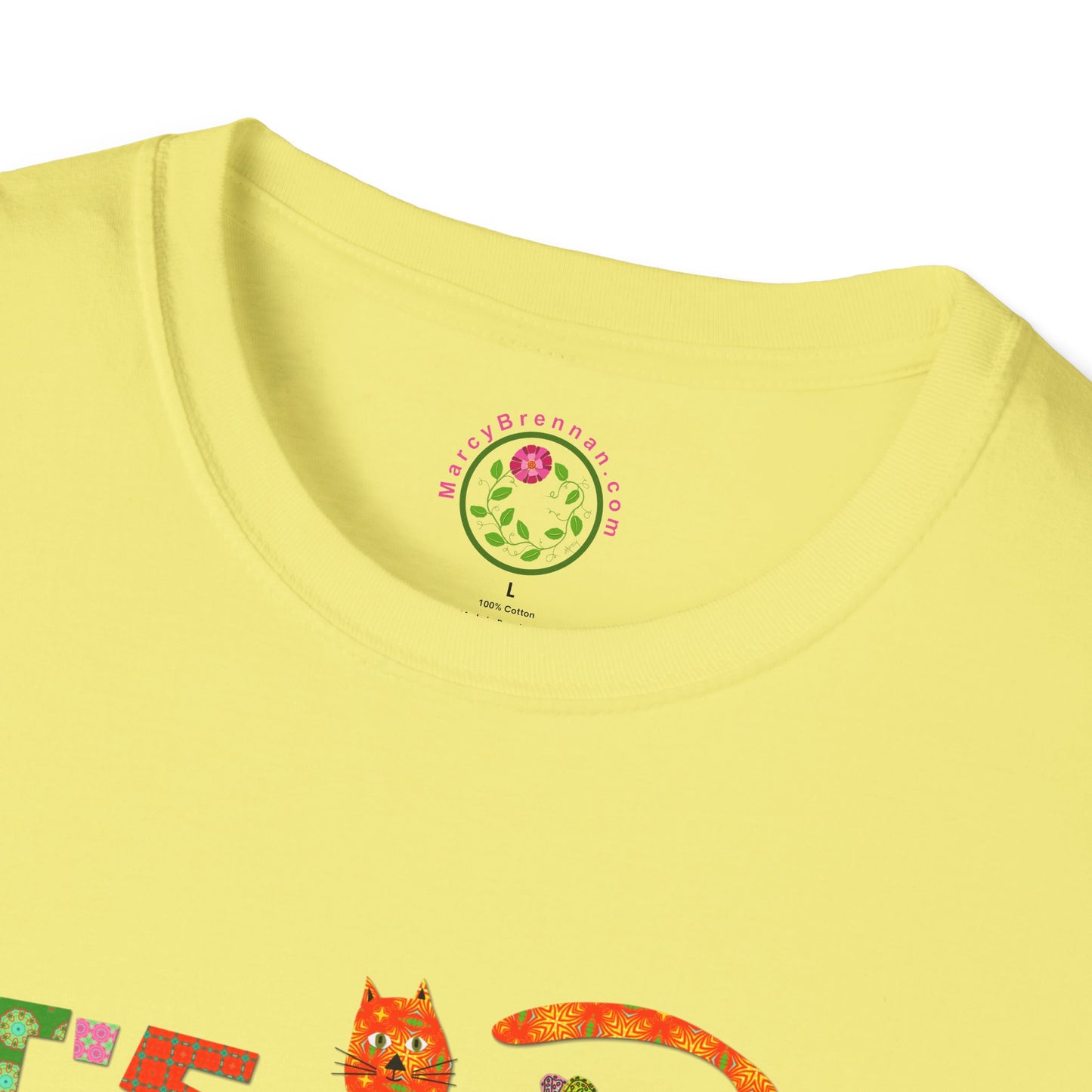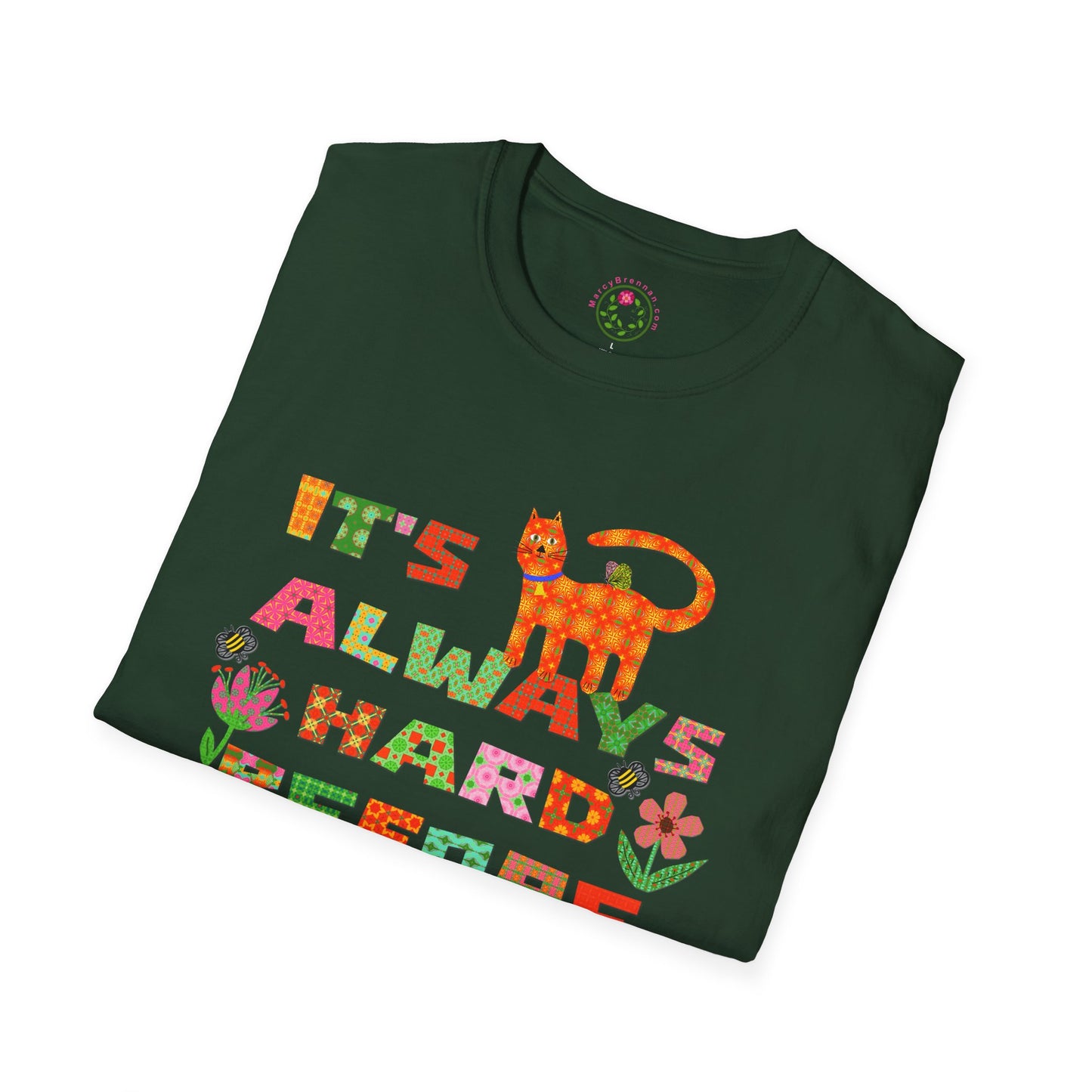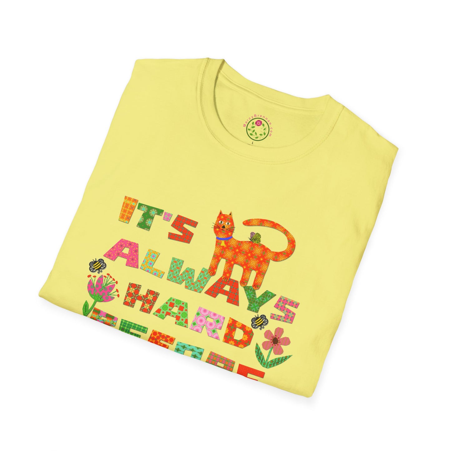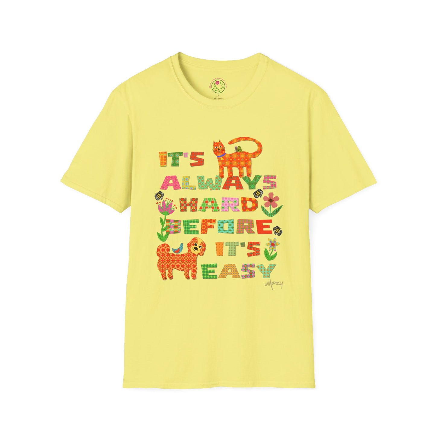 Wear your encouragement proudly with this ultra-soft t-shirt featuring the charming hand-cut collage design, “It’s Always Hard Before It’s Easy.” Each letter bursts with unique color and textured pattern, creating a playful yet powerful message of resilience. Surrounding the quote are heartwarming illustrations: a curious cat with a butterfly perched on its back, a cheerful Maltipoo dog hosting a sweet bird, and three blooming flowers alive with buzzing bumblebees. All elements rest on a softly textured cream background that enhances the layered collage feel.