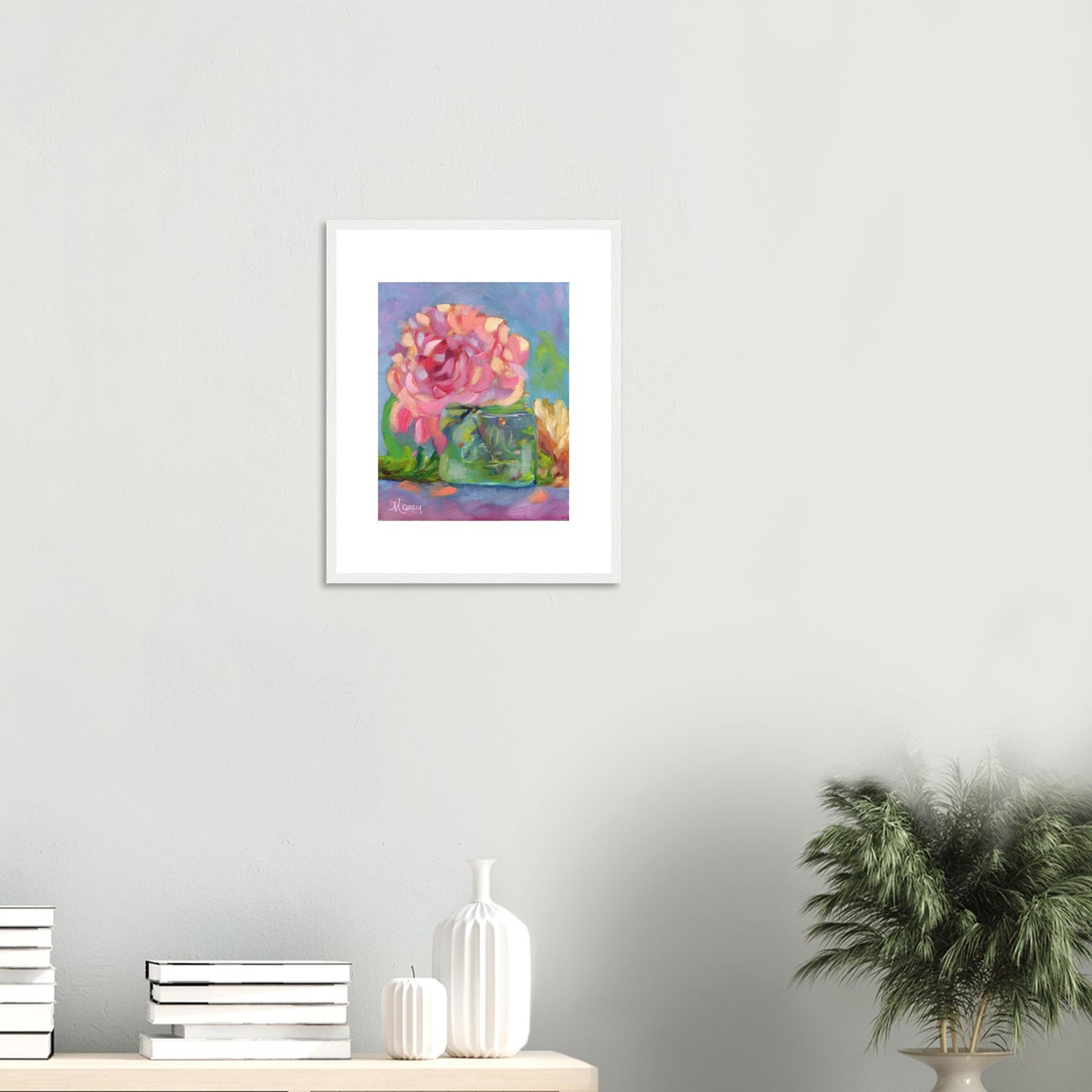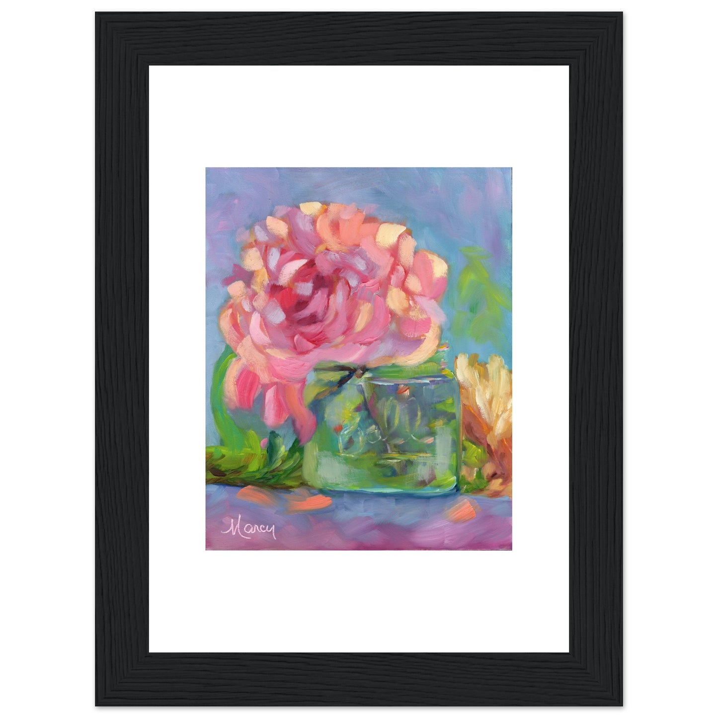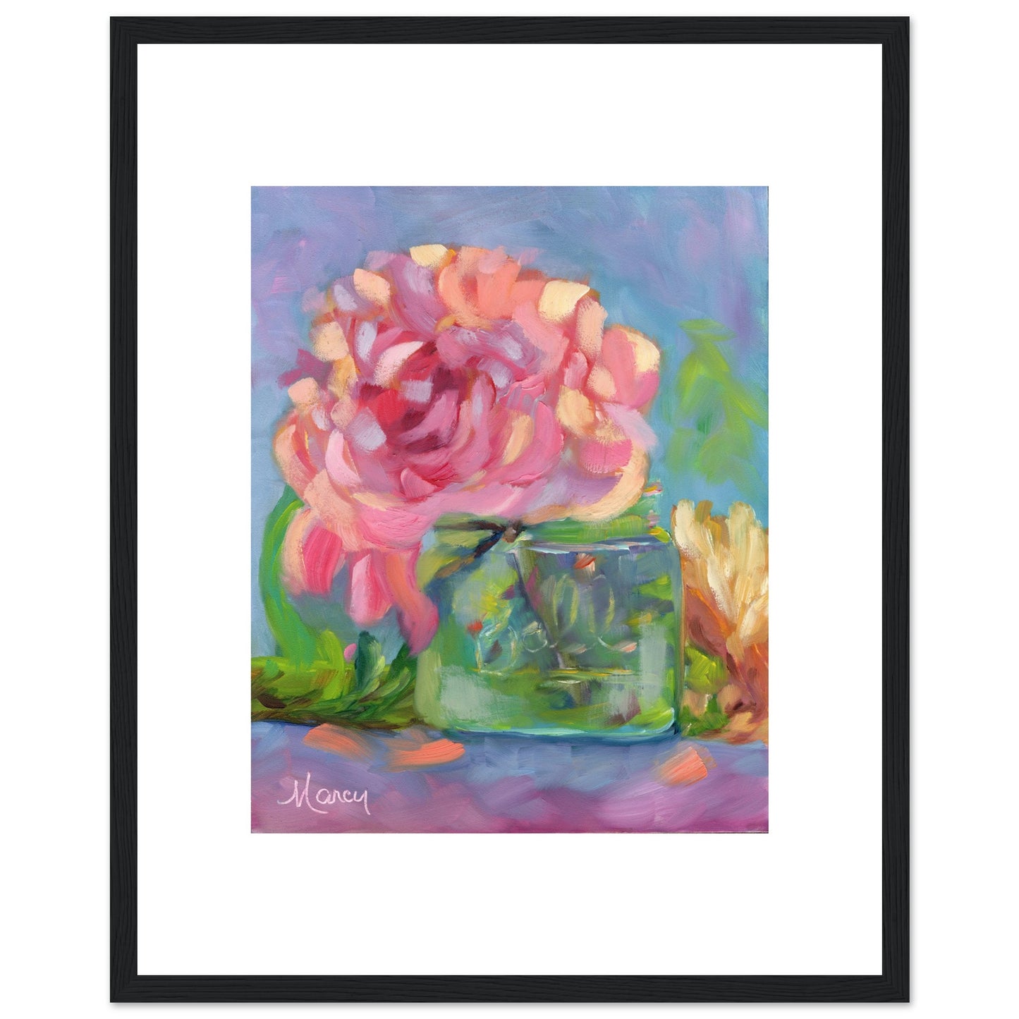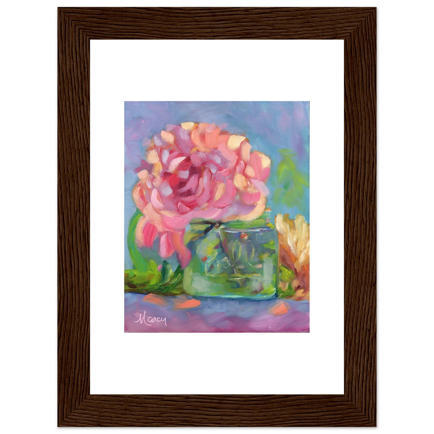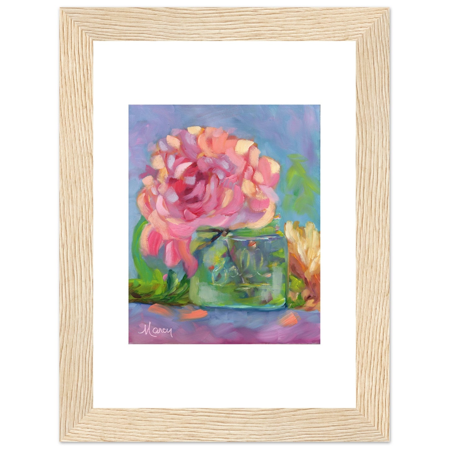 Elevate your decor with this premium matte print of a charming impressionistic oil painting. Featuring a single pink peony elegantly displayed in a green Mason Ball jar, complemented by a yellow peony lying gracefully behind it, this artwork exudes delicate beauty and timeless charm. The soft, expressive brushstrokes capture the essence of the flowers, creating a serene and inviting composition. Encased in a handcrafted wooden frame, this piece adds a touch of sophistication and warmth to any space, making it an ideal focal point for your home or office.