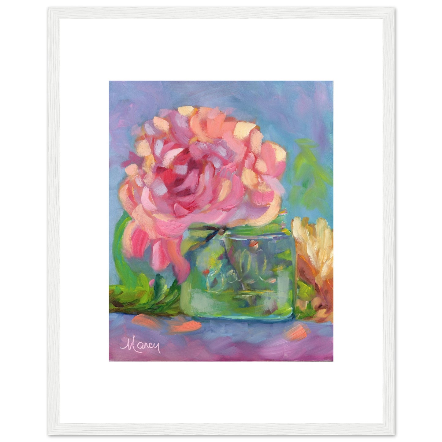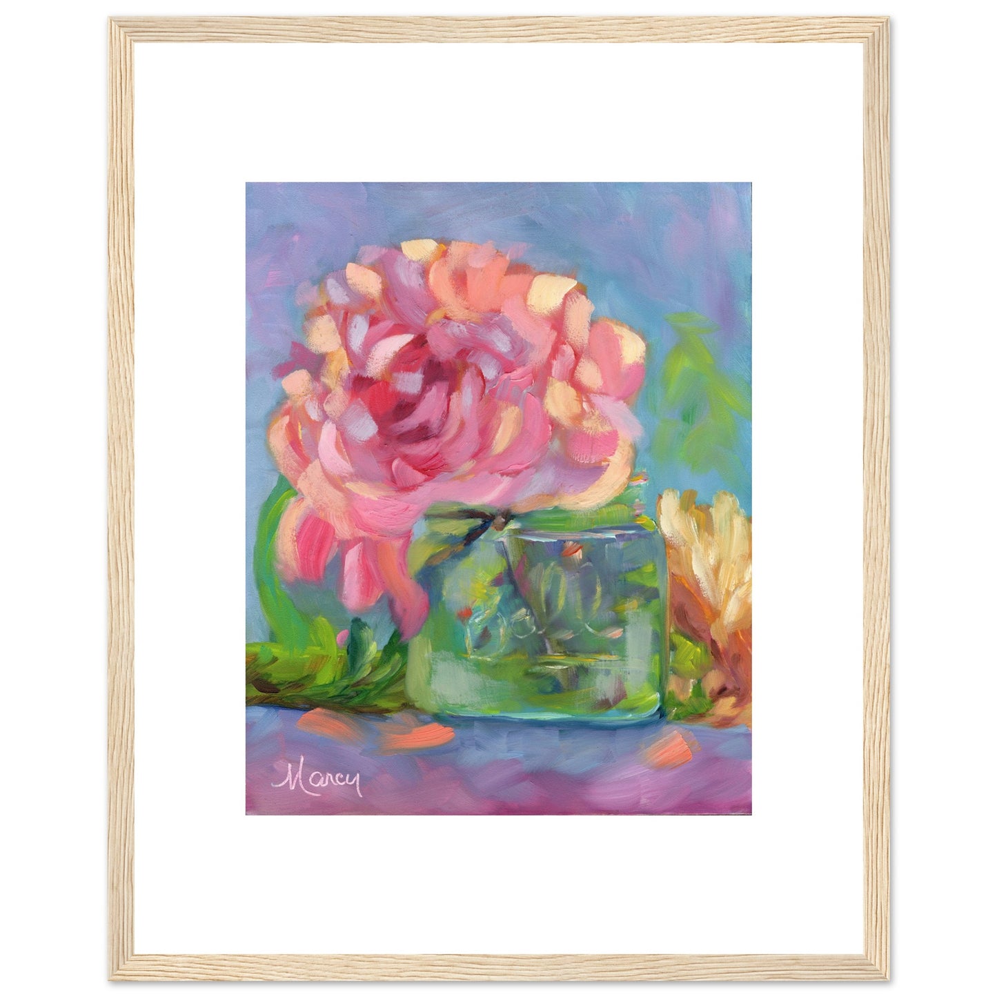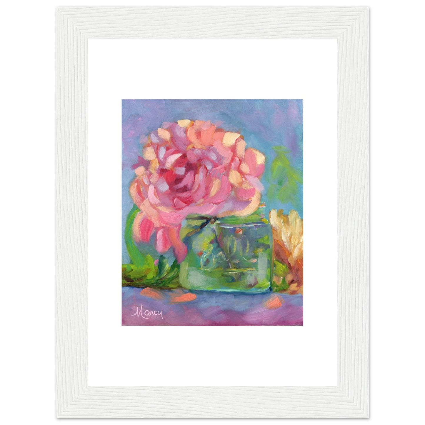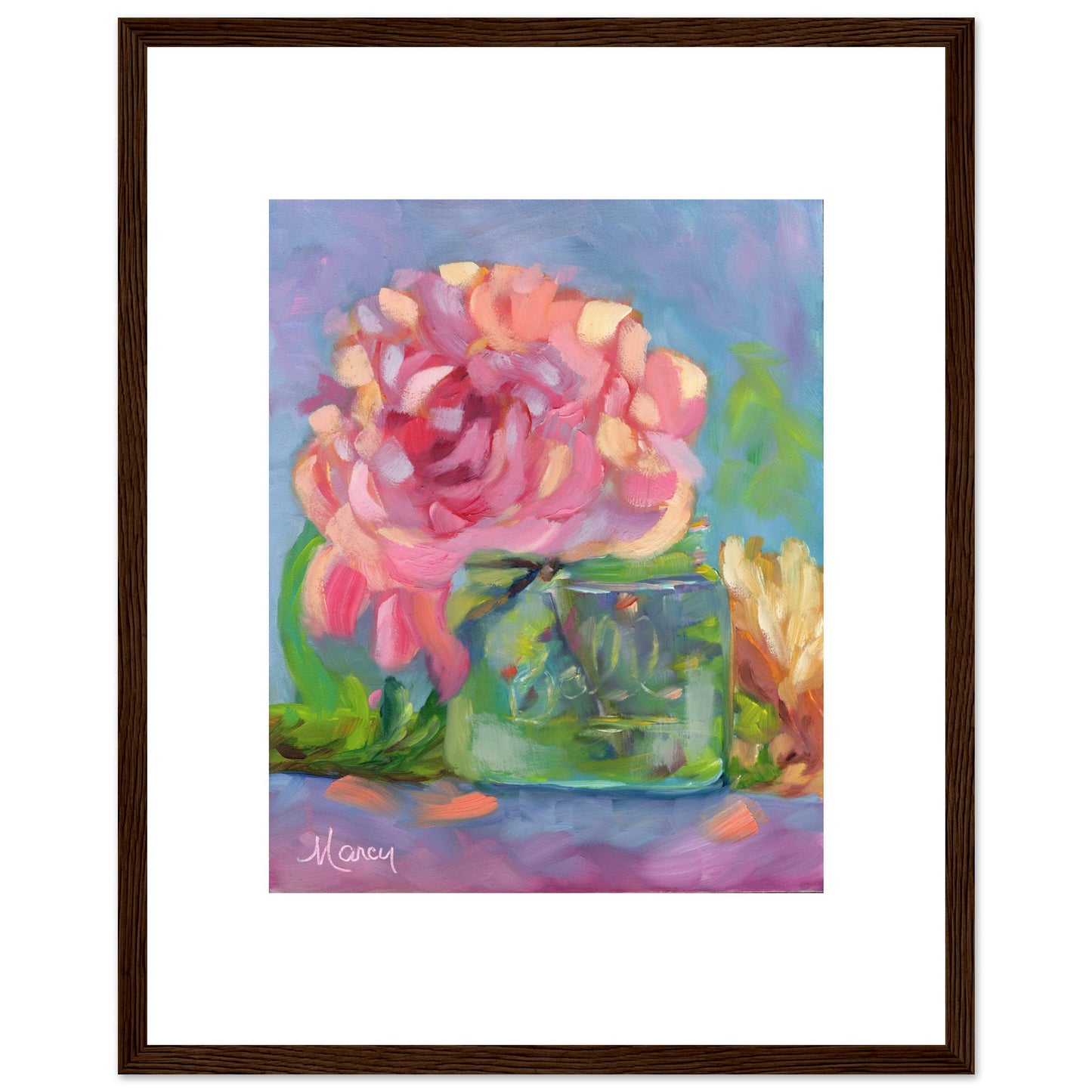 Elevate your decor with this premium matte print of a charming impressionistic oil painting. Featuring a single pink peony elegantly displayed in a green Mason Ball jar, complemented by a yellow peony lying gracefully behind it, this artwork exudes delicate beauty and timeless charm. The soft, expressive brushstrokes capture the essence of the flowers, creating a serene and inviting composition. Encased in a handcrafted wooden frame, this piece adds a touch of sophistication and warmth to any space, making it an ideal focal point for your home or office.