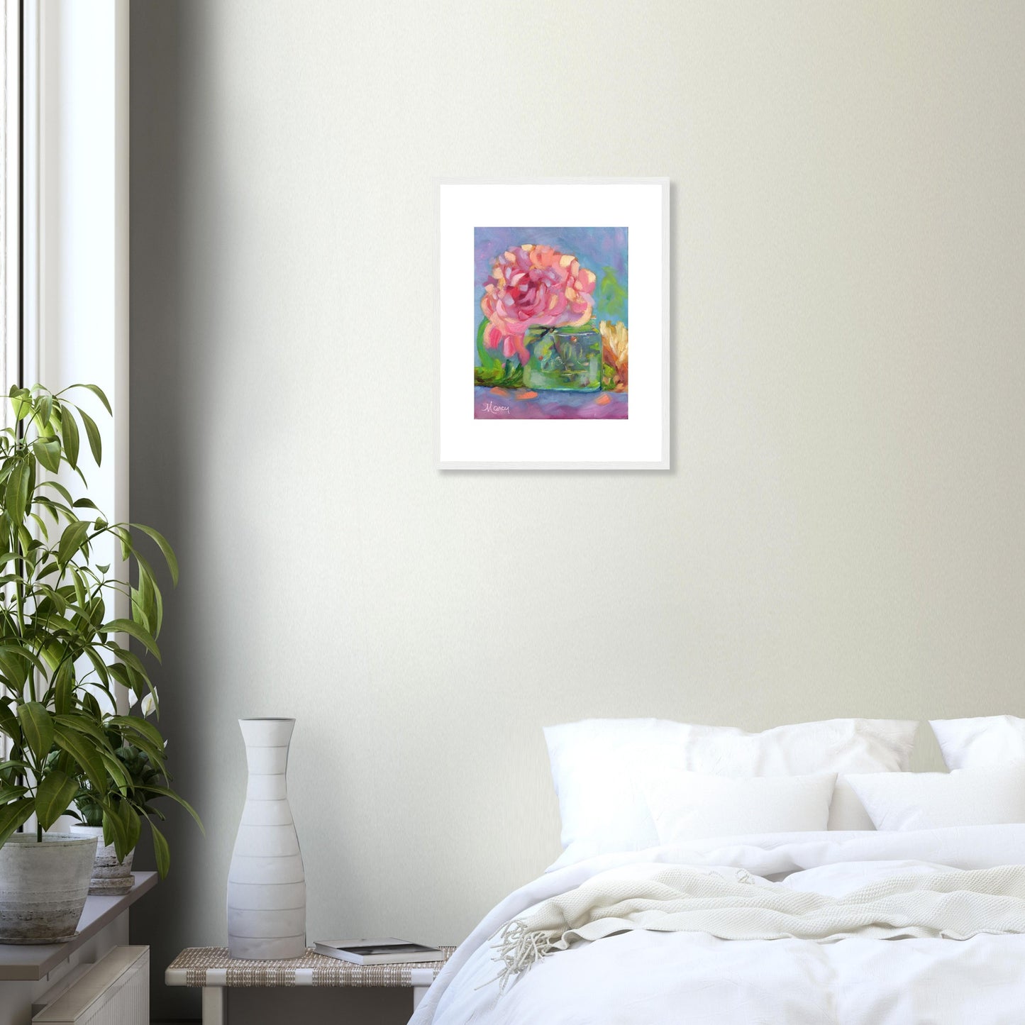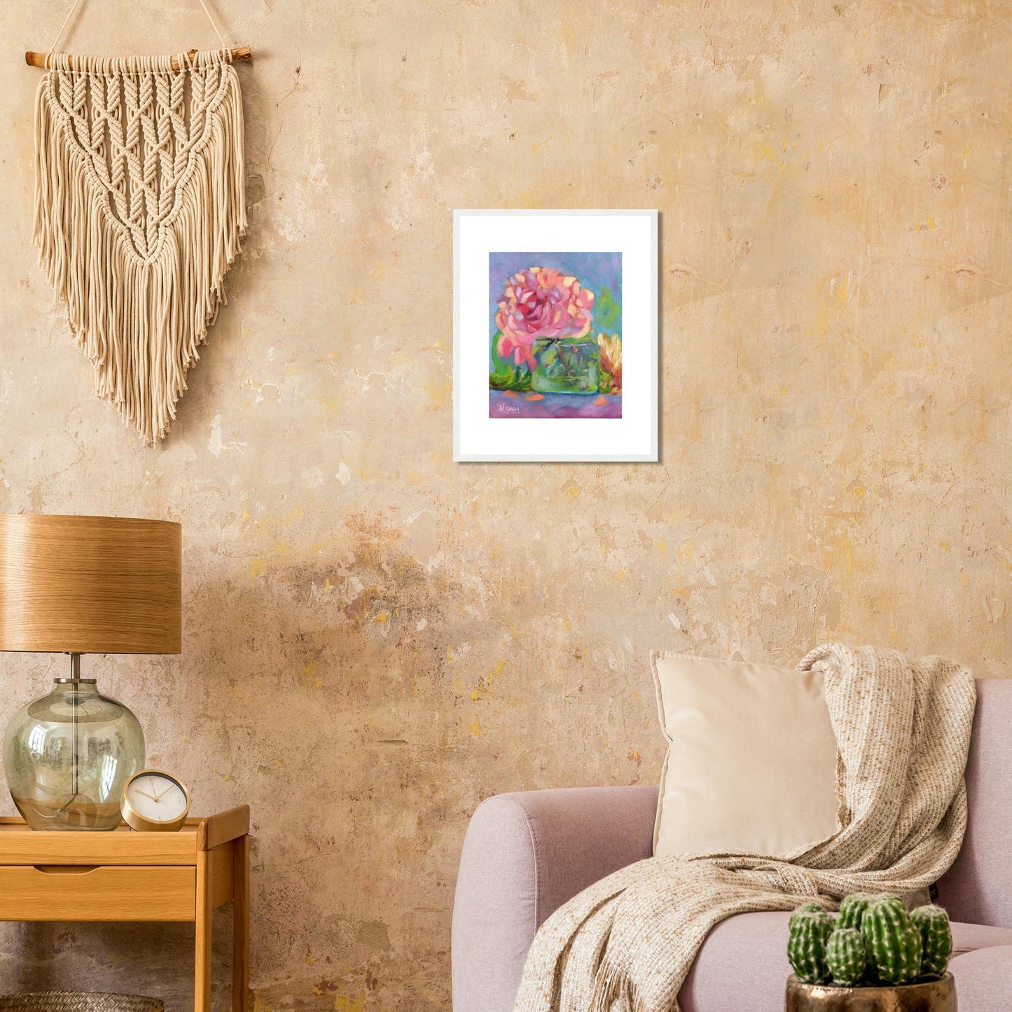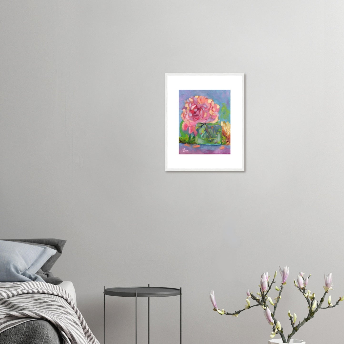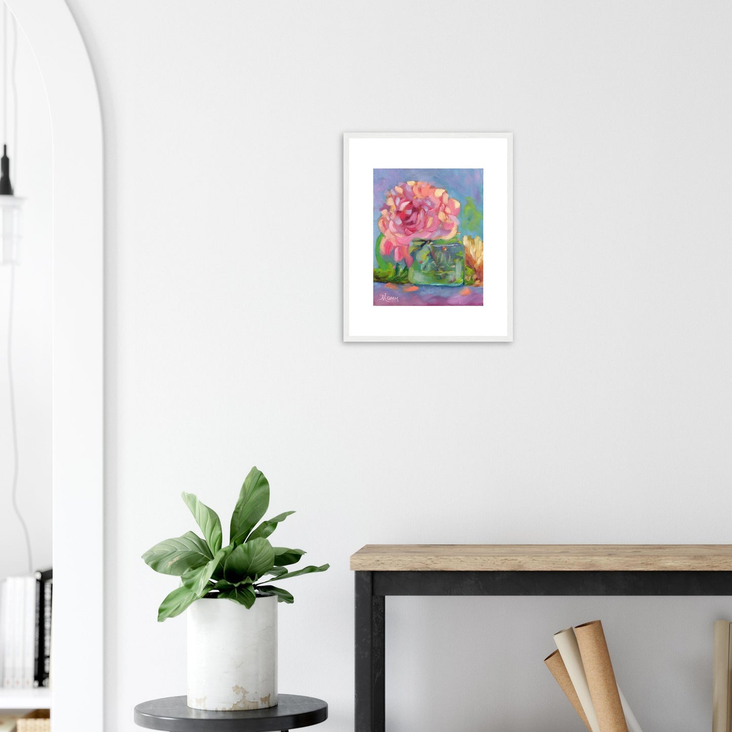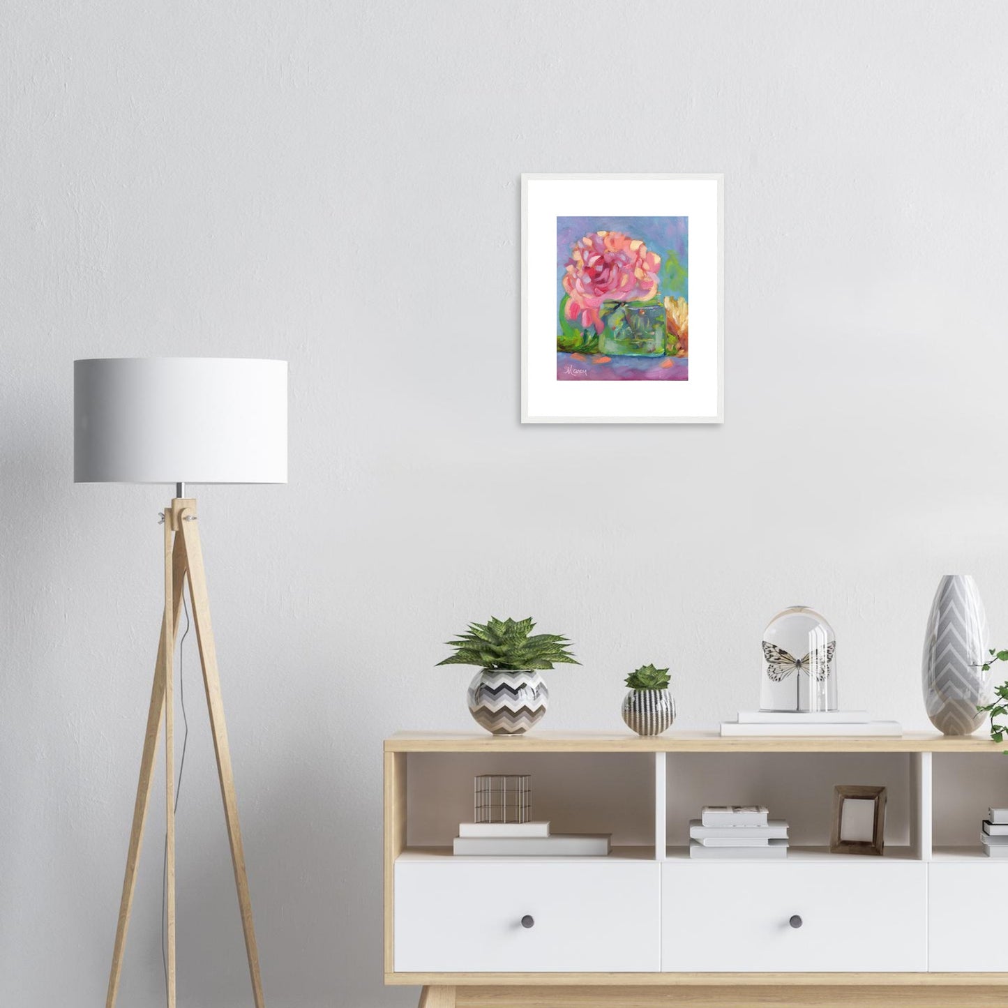 Elevate your decor with this premium matte print of a charming impressionistic oil painting. Featuring a single pink peony elegantly displayed in a green Mason Ball jar, complemented by a yellow peony lying gracefully behind it, this artwork exudes delicate beauty and timeless charm. The soft, expressive brushstrokes capture the essence of the flowers, creating a serene and inviting composition. Encased in a handcrafted wooden frame, this piece adds a touch of sophistication and warmth to any space, making it an ideal focal point for your home or office.