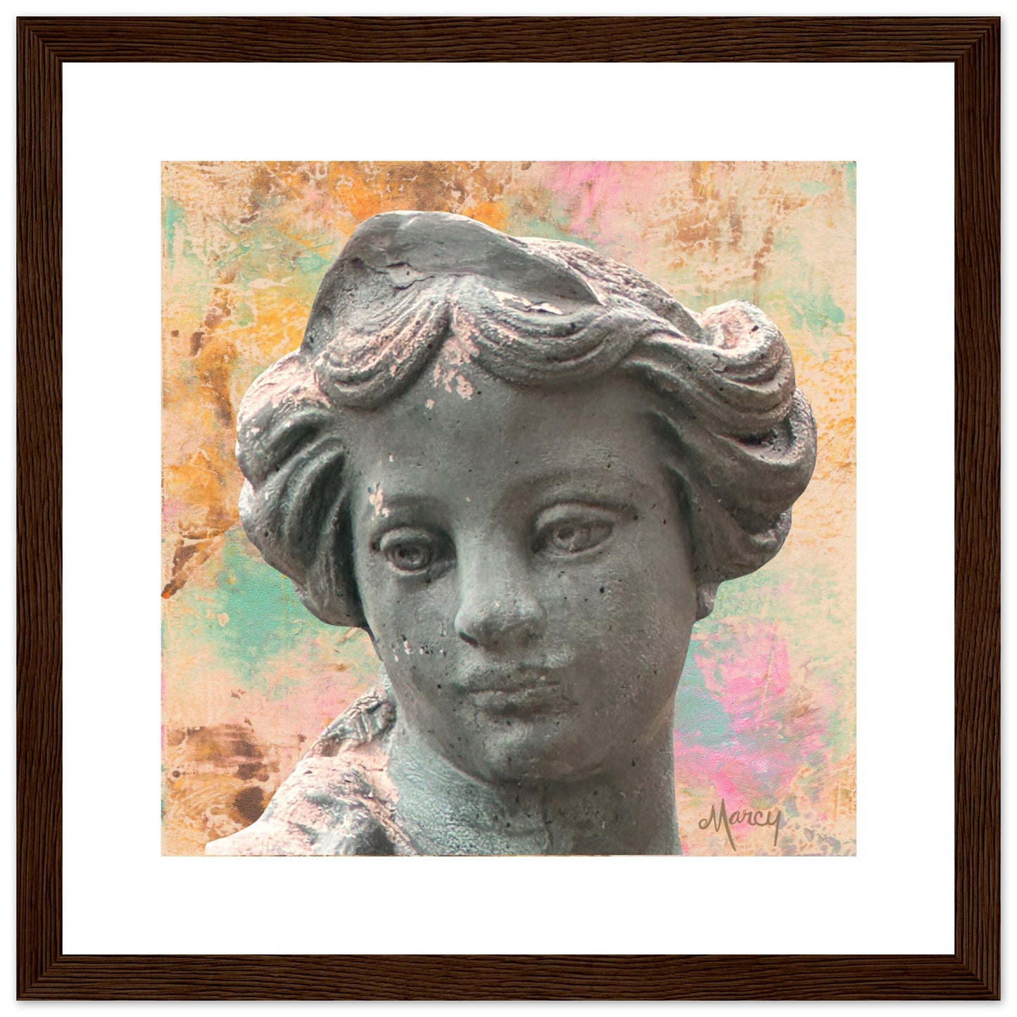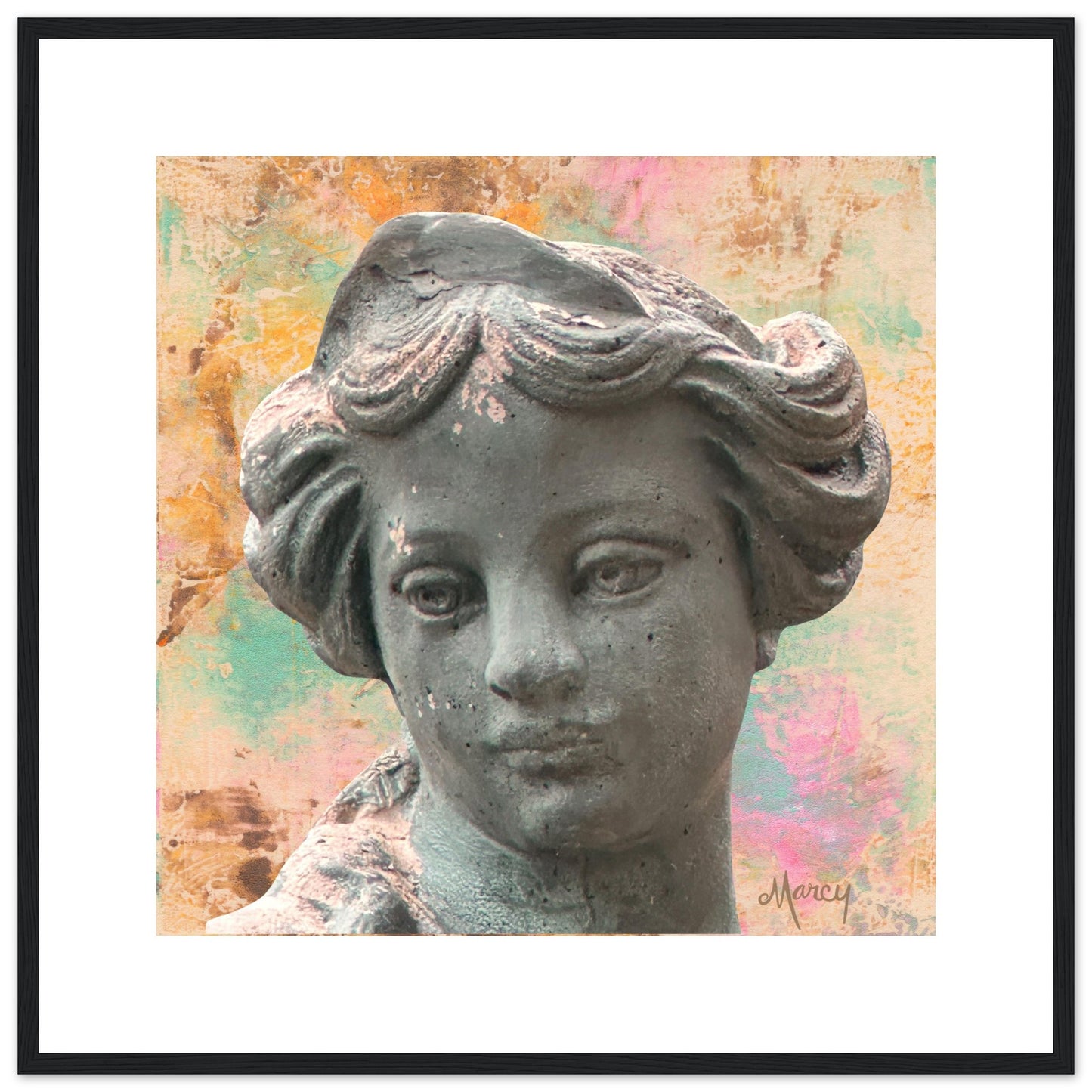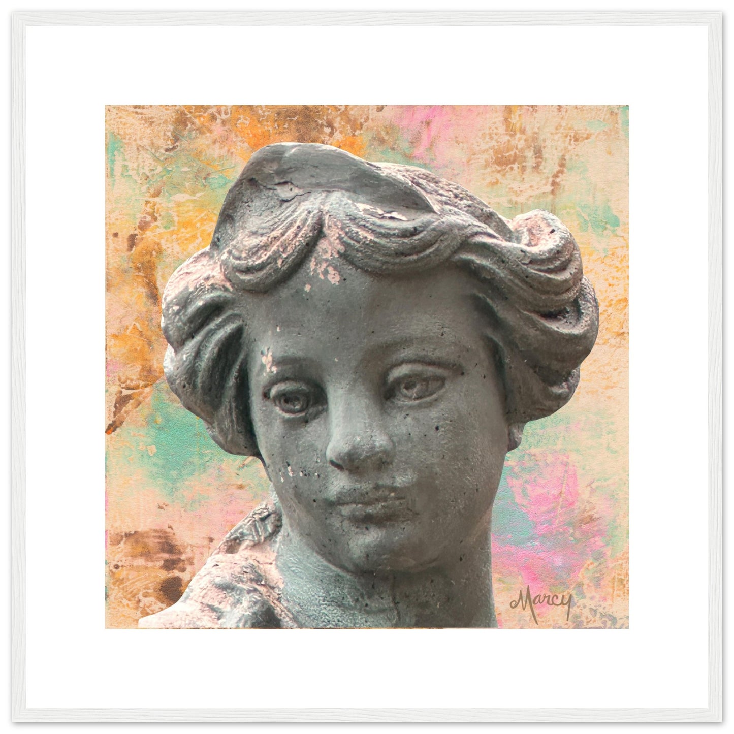 The Horae were, in Greek mythology, the goddesses of the seasons. They presided over the revolutions of the heavenly constellations and represented the change of the four seasons. This is a photo I took at one of our local garden centers of the head of the goddess statue representing winter. I placed it over an oil abstract monoprint I created some years ago. I think she’s a beautiful representation of winter!